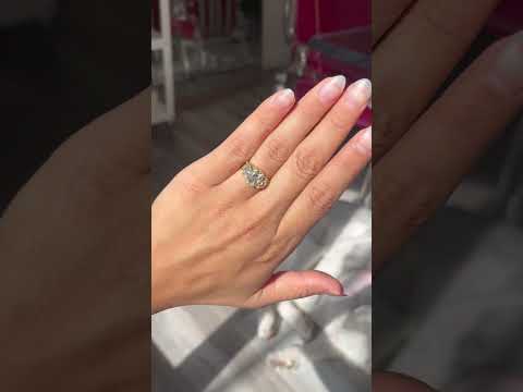 One of the prettiest Victorian-era rings to land on my lap for sometime, as these old treasures are getting harder and harder to come by due to their popularity and rarity. Set with a central old mine cushion with a gorgeous elongated make and flanked by a pair of old mine on the shoulders in rich yellow gold. Beautiful carved details along the shank with a swirl motif.