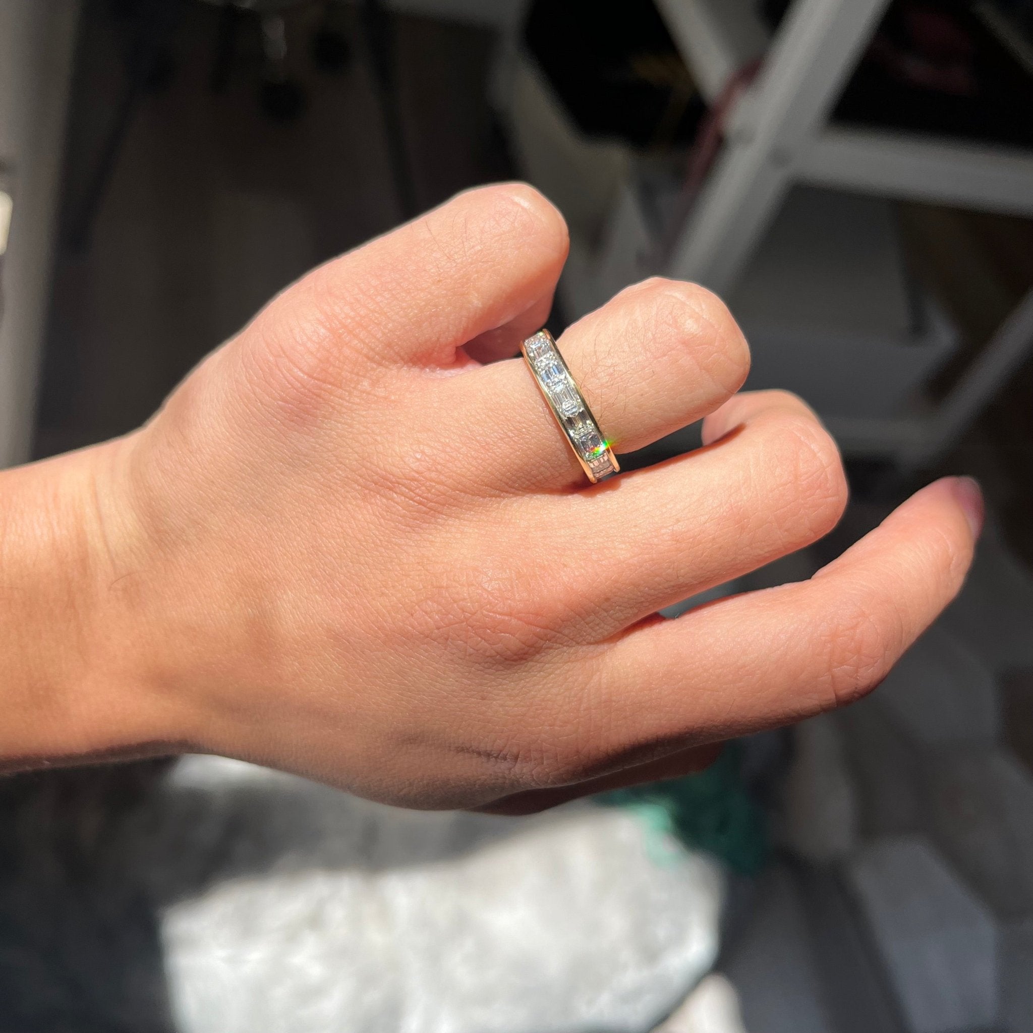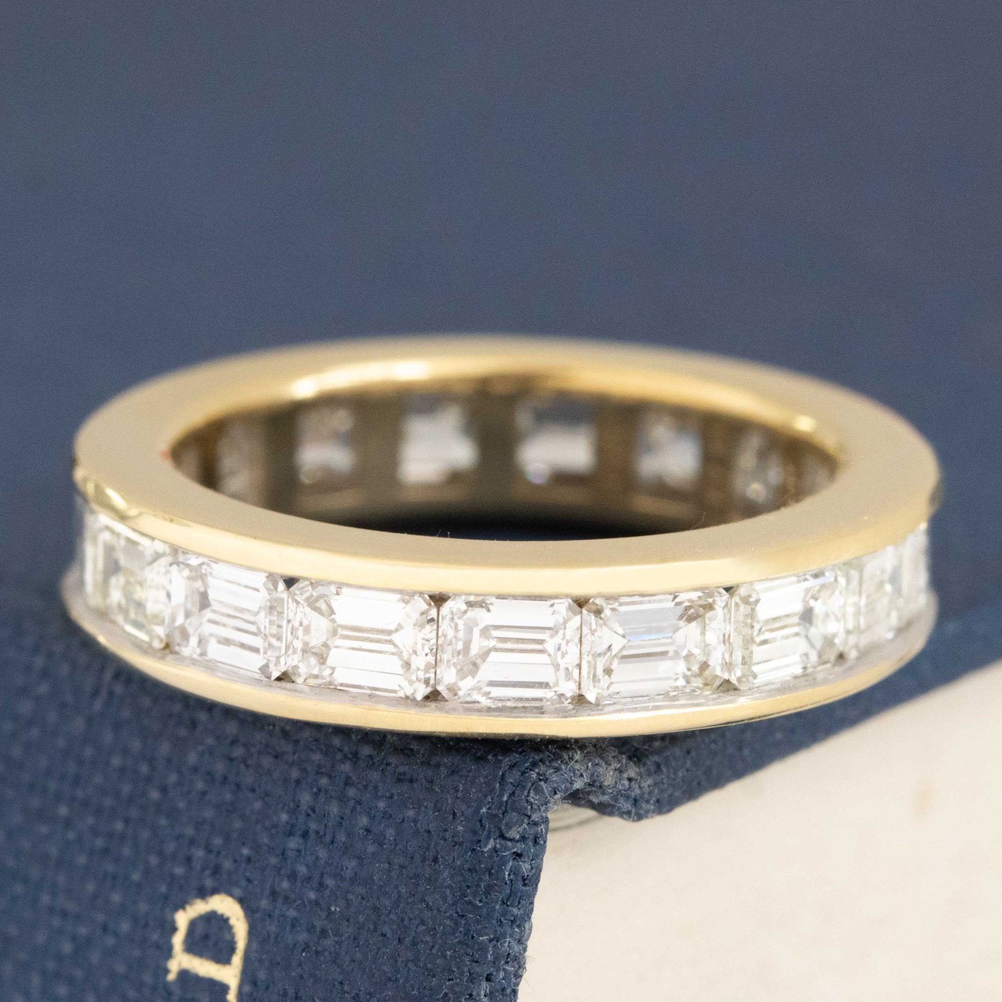 A classic emerald cut diamond eternity band in a channel style setting! Set in warm yellow gold, this timeless piece of jewelry spans beautifully around one's finger and stacks well with others.