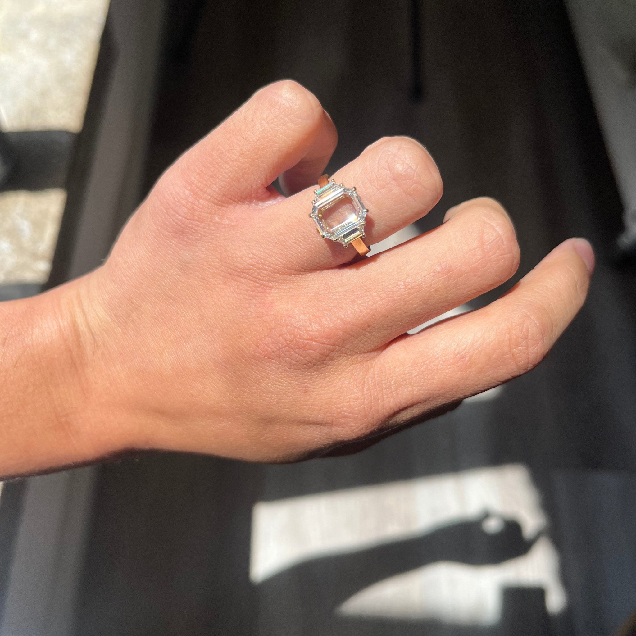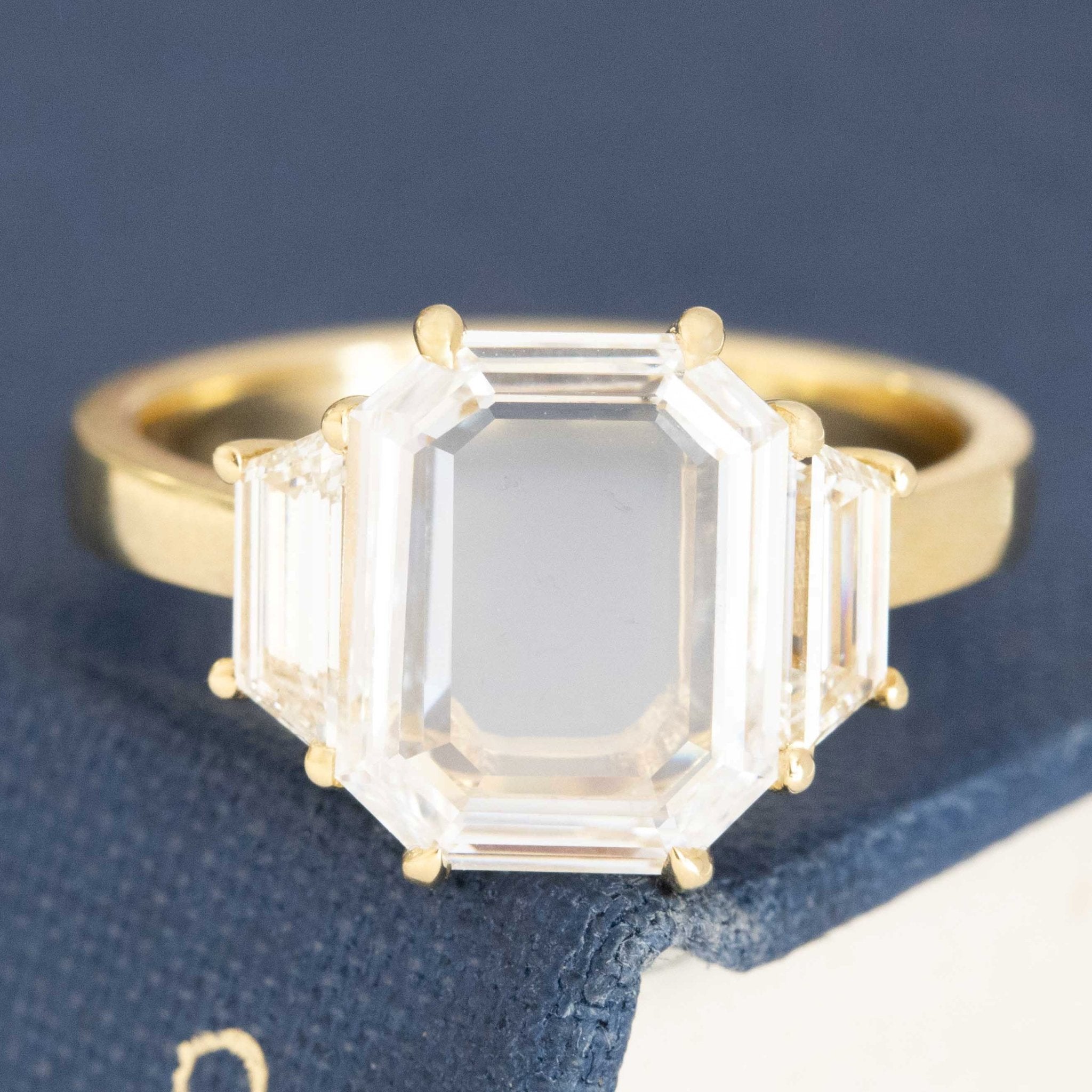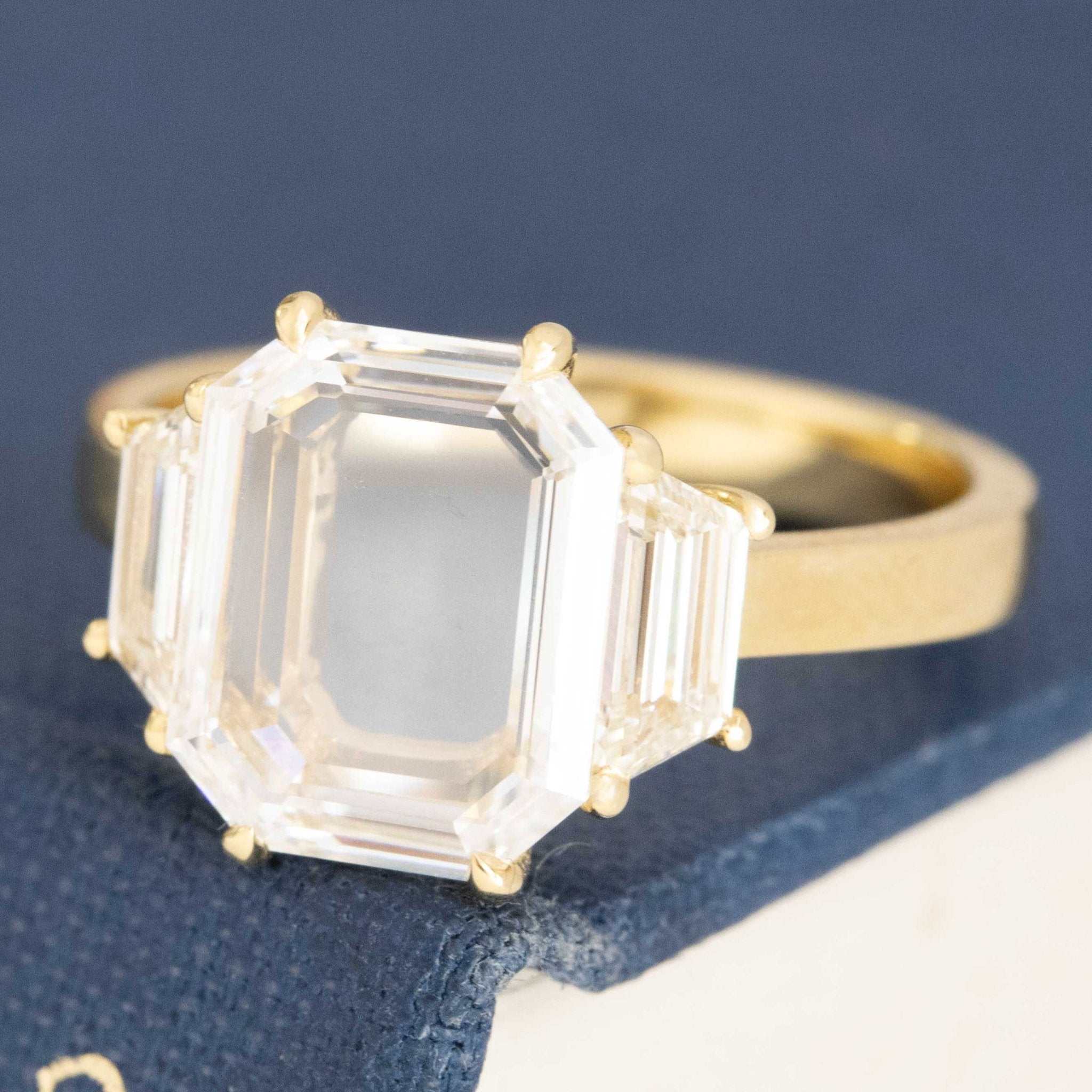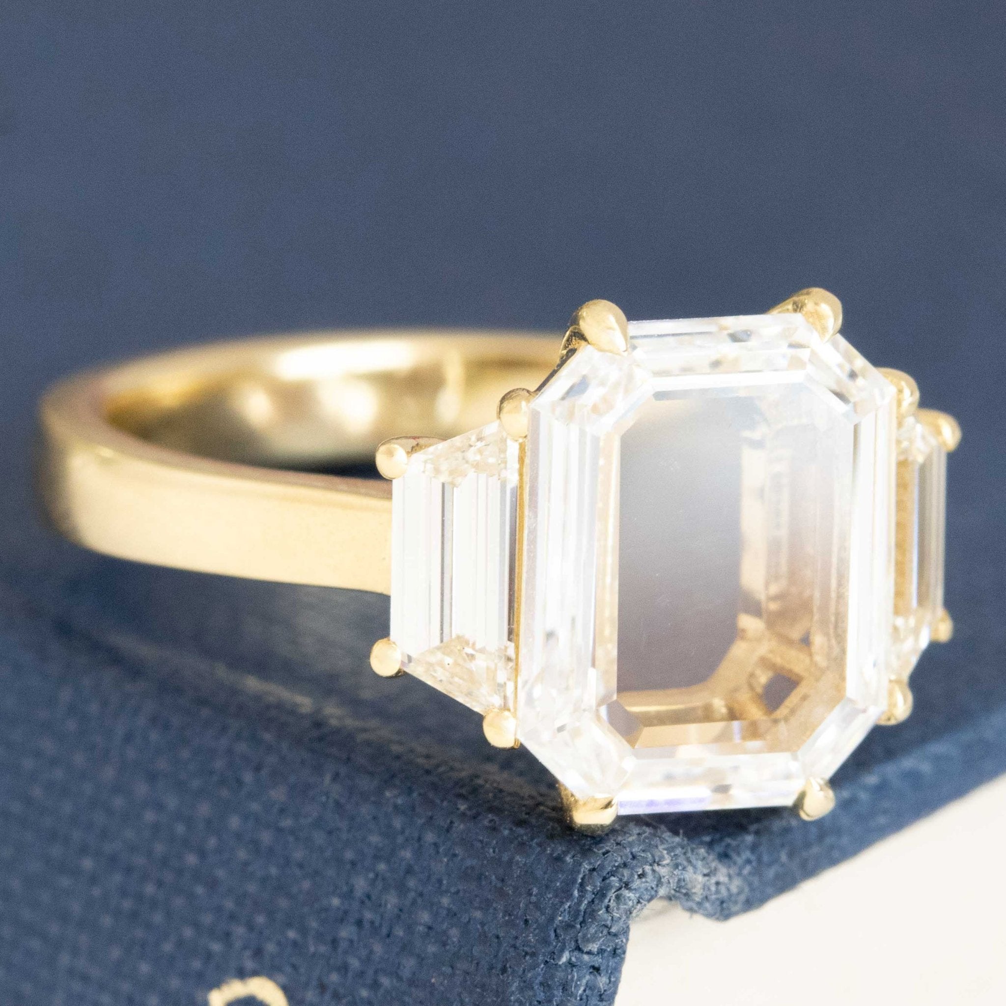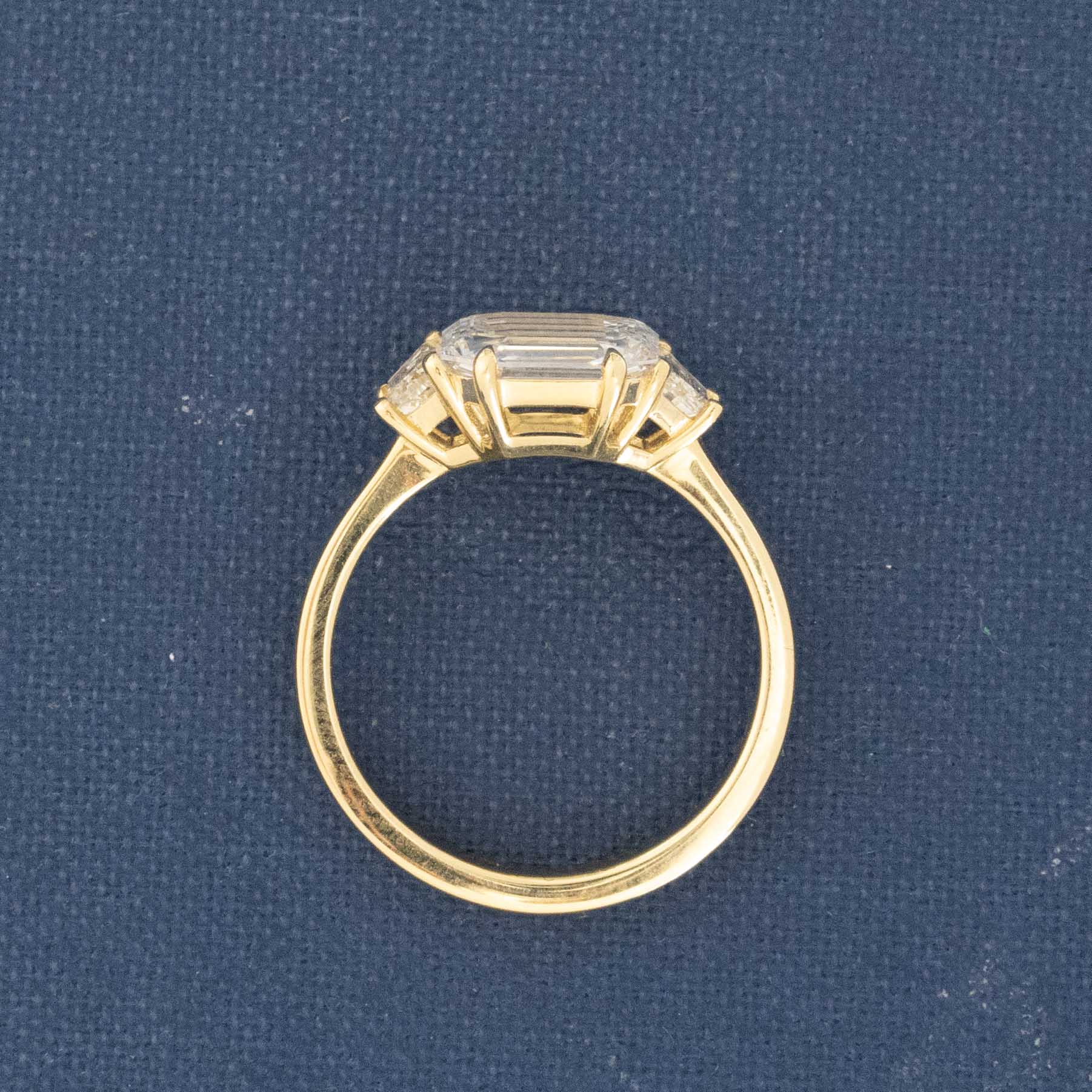 A magnificent portrait cut diamond in an emerald cut shape - delicate faceting and such a special, unique look. Flanked by trapezoid side stones, this trilogy is a step cut lover's dream that offers excellent spread and finger coverage in 18kt yellow gold. The 2.09ct center stone is a bright GIA D color and VVS2, evidenced by its' nearly perfect face up on the hands. We are quite fond of how this ring turned out - classic yet new all at the same time.
