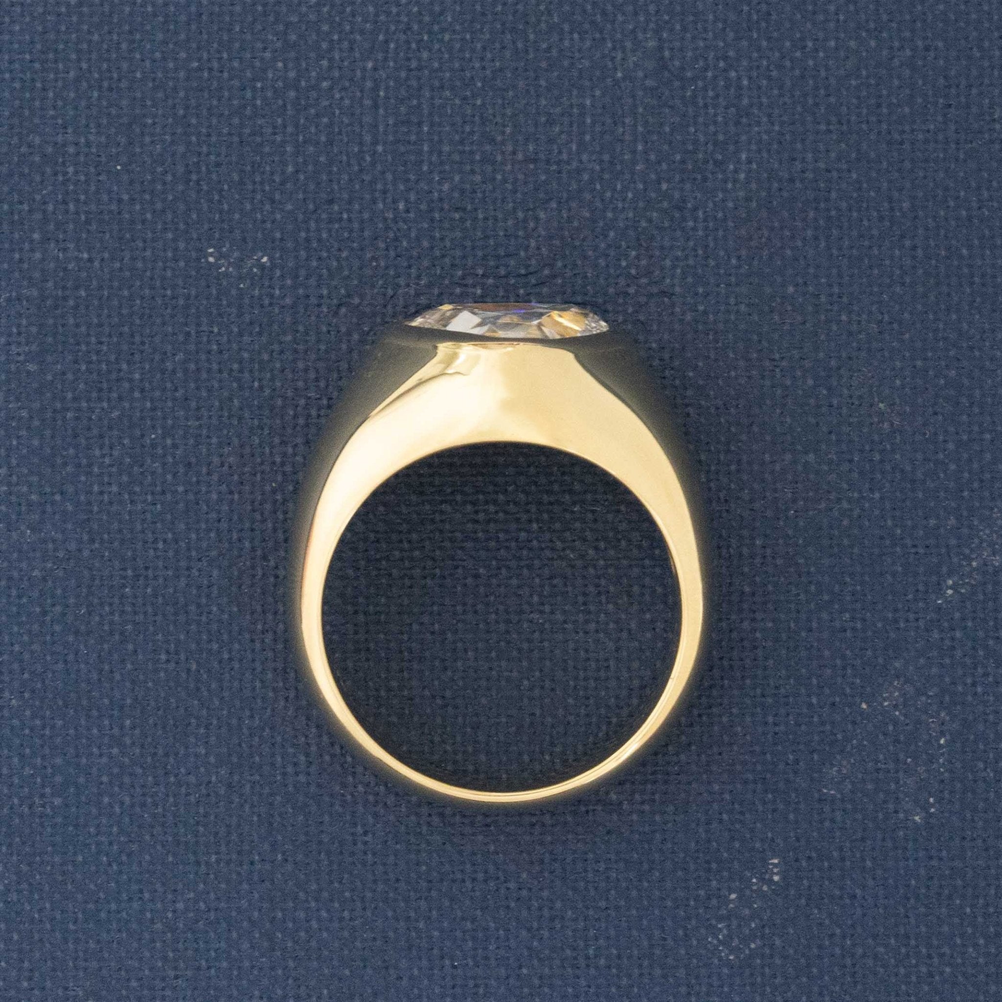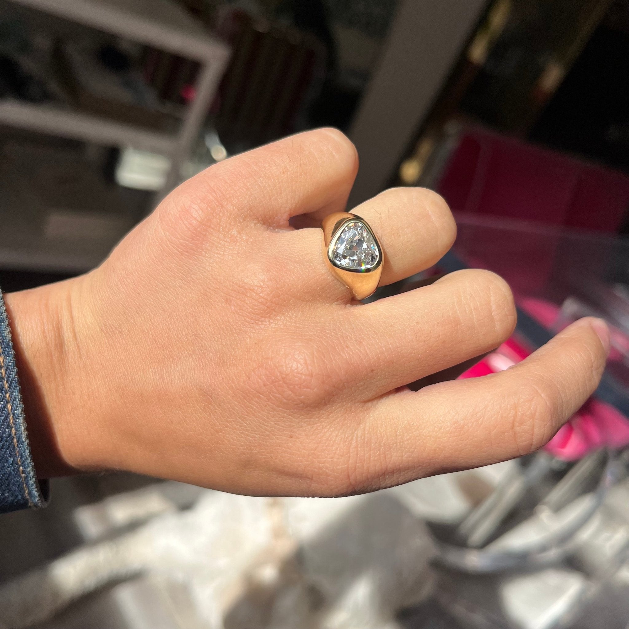How special is she? This antique "peart" cut diamond (as we like to call her) is literally a cross between a pear shape and a heart shape diamond. The overall look? A diamond that is simply oozing with charm and rare beauty - beyond stunning! Set in this 18kt chunky bezel dome setting, the diamond simply came to life and sits on the finger so, so beautifully! Beyond chic in its simplicity and elegance. What a gorgeous and unique engagement ring this would make!
