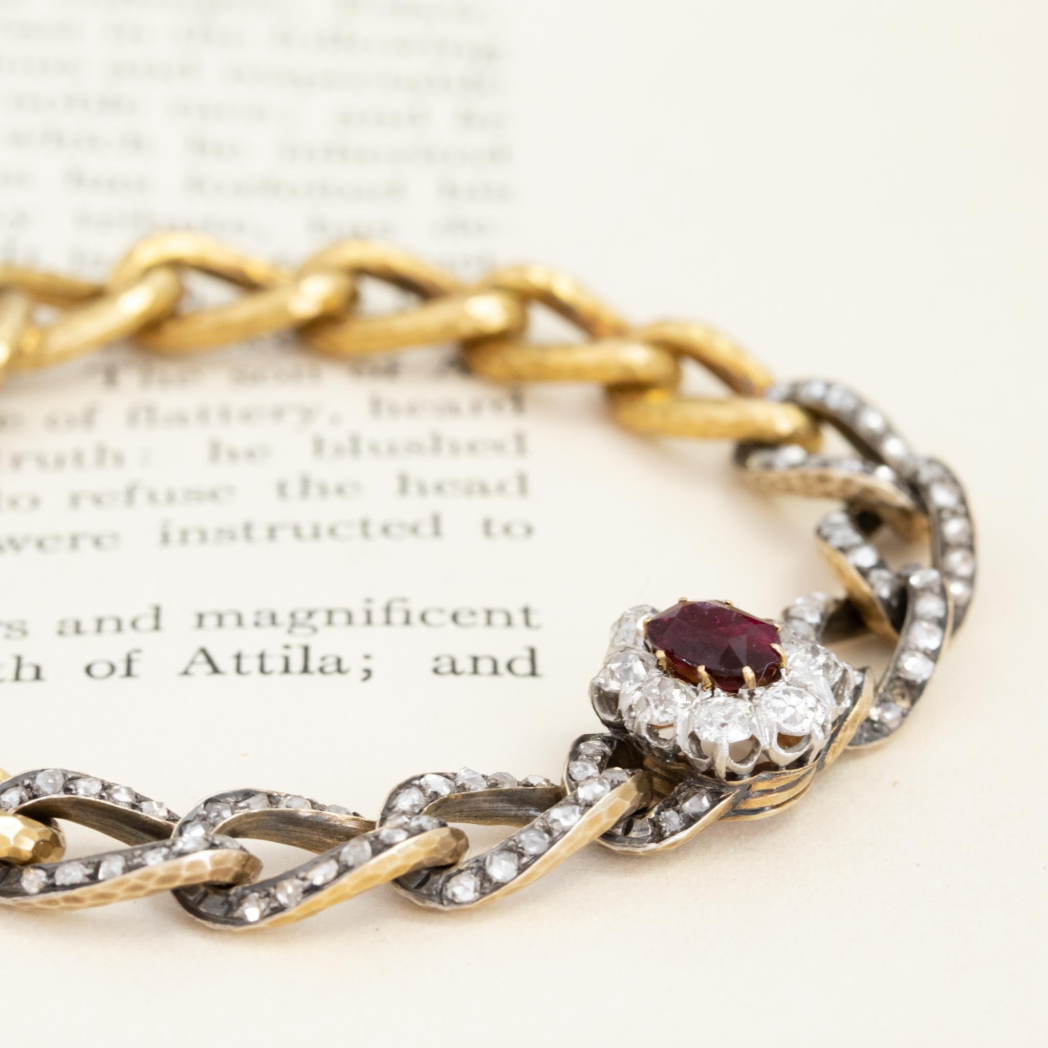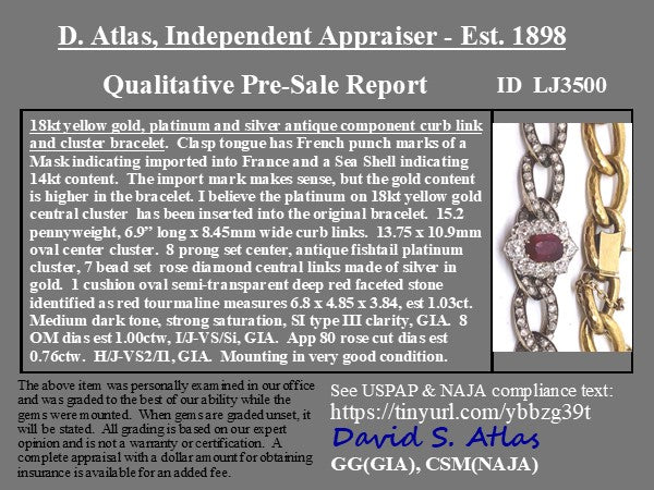 A most unique antique curb link bracelet - the perfect juxtaposition between the intricate and the simple. The diamond and tourmaline cluster appears is French, and might have been a later addition (although also an antique piece). Set in the center of a bolder curb link with rose cut diamonds toward the center - the bracelet is super unique and looks even better on the wrist!