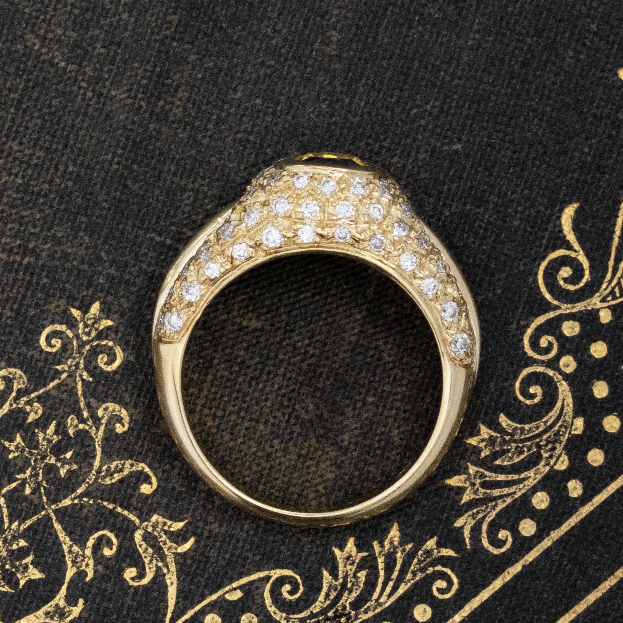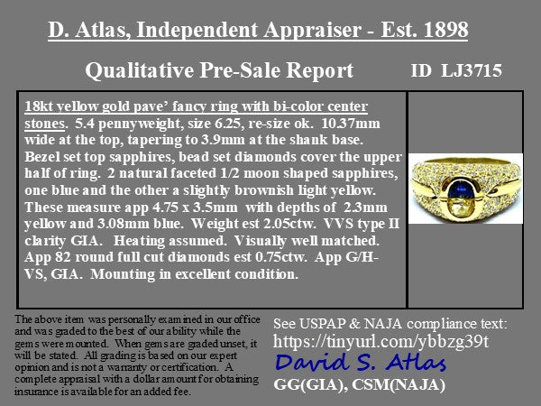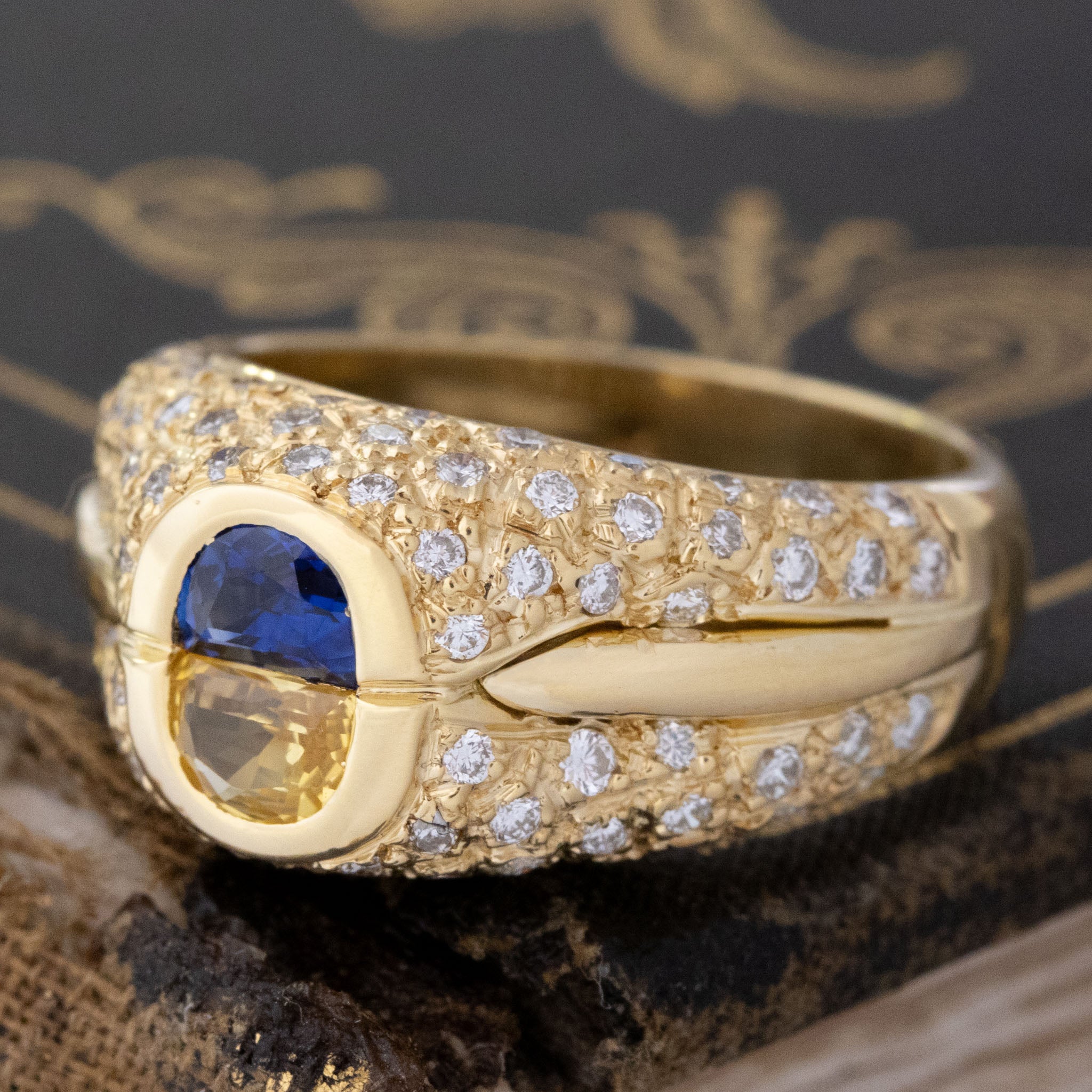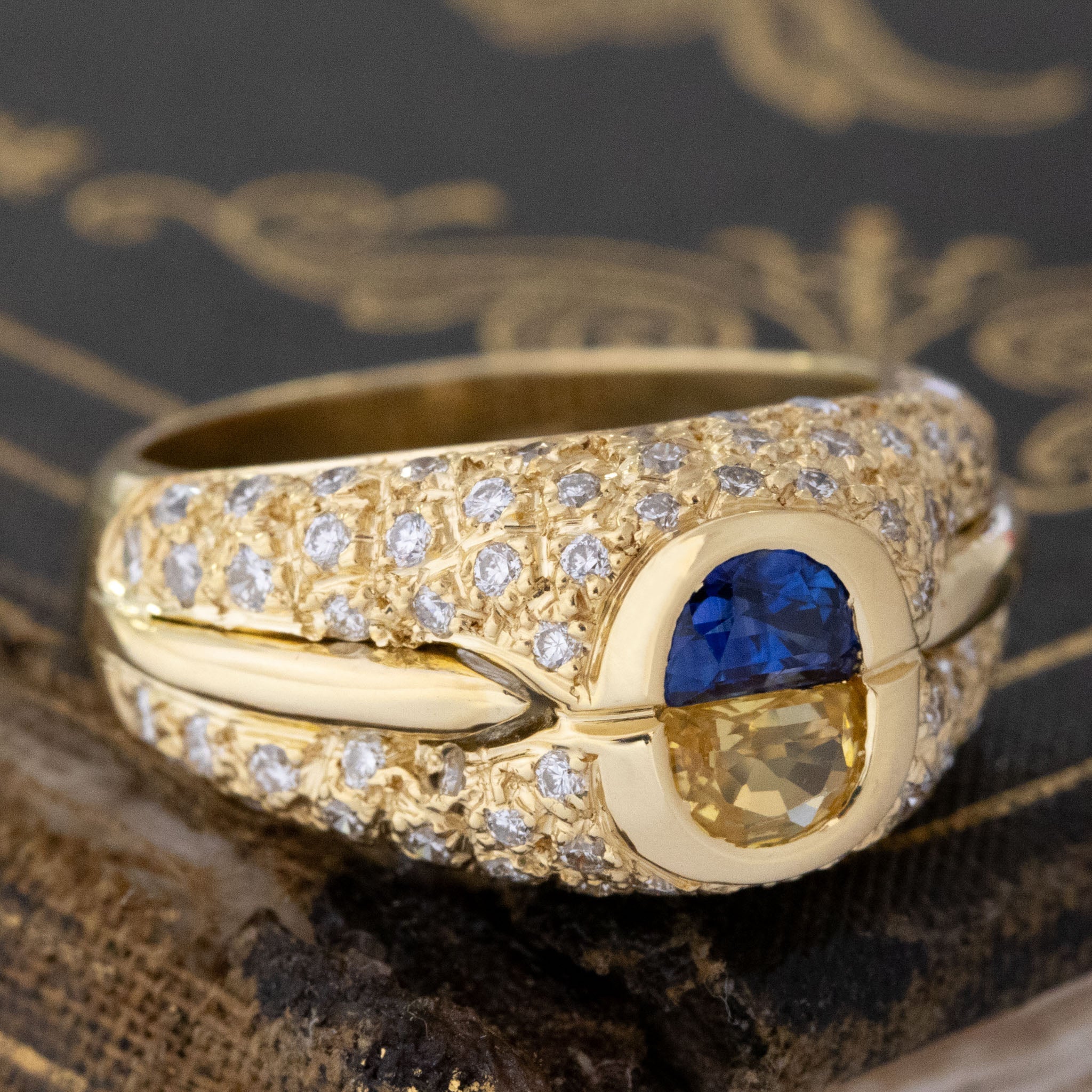 Two half-moon sapphires sit in a chunky yellow gold dome ring with pave diamond details throughout. This ring gives us big 1980's energy in the best way possible! From the buttery gold to the color contrast between the sapphires, she is bold and bright in every way.
