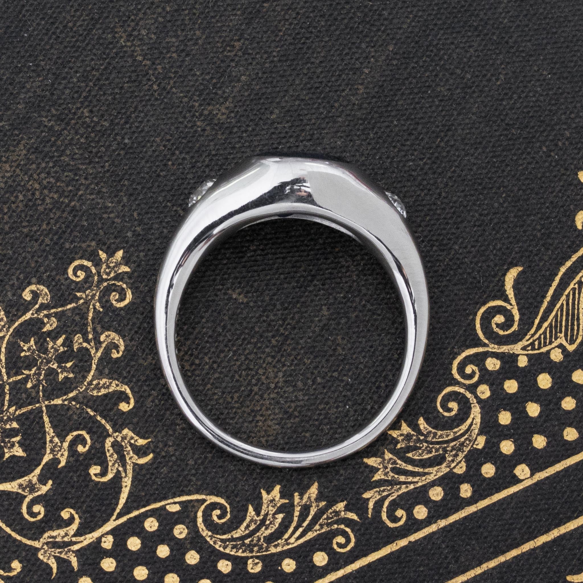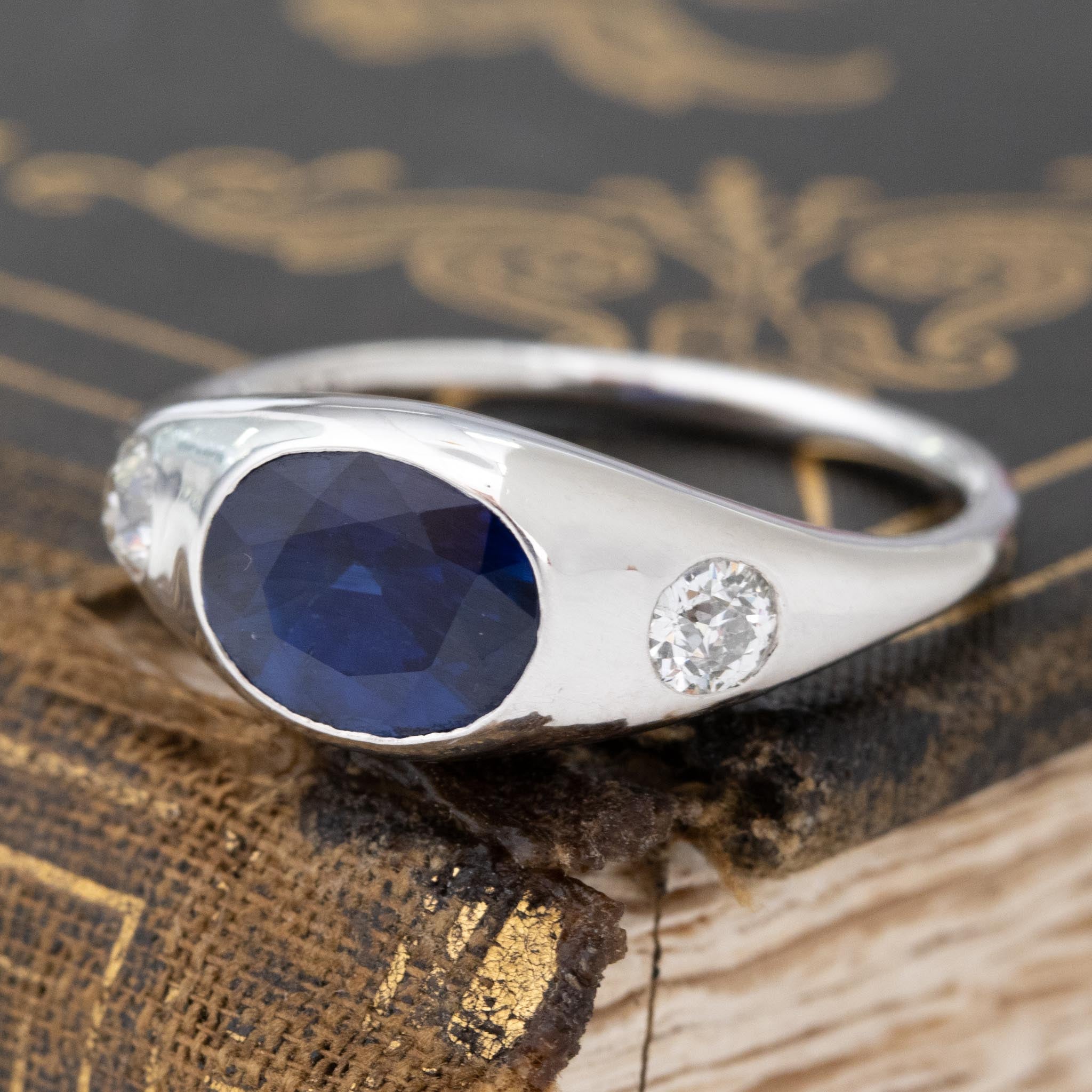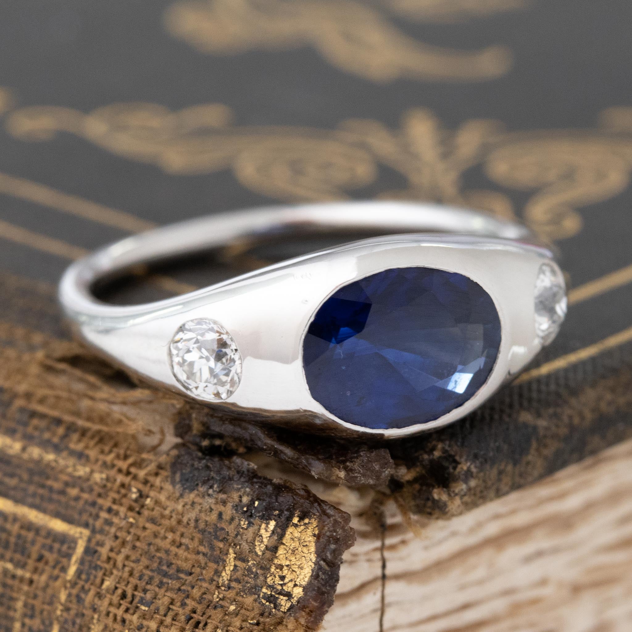 Heavily inspired by antique flush-set rings, this ring showcases a Ceylon sapphire in the center, flanked by a pair of chunky old European cut diamonds. Fluid and clean, the ring slips on the finger like buttah!