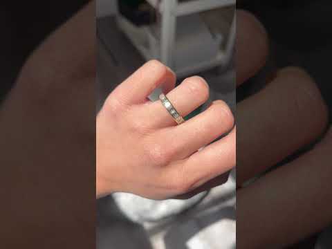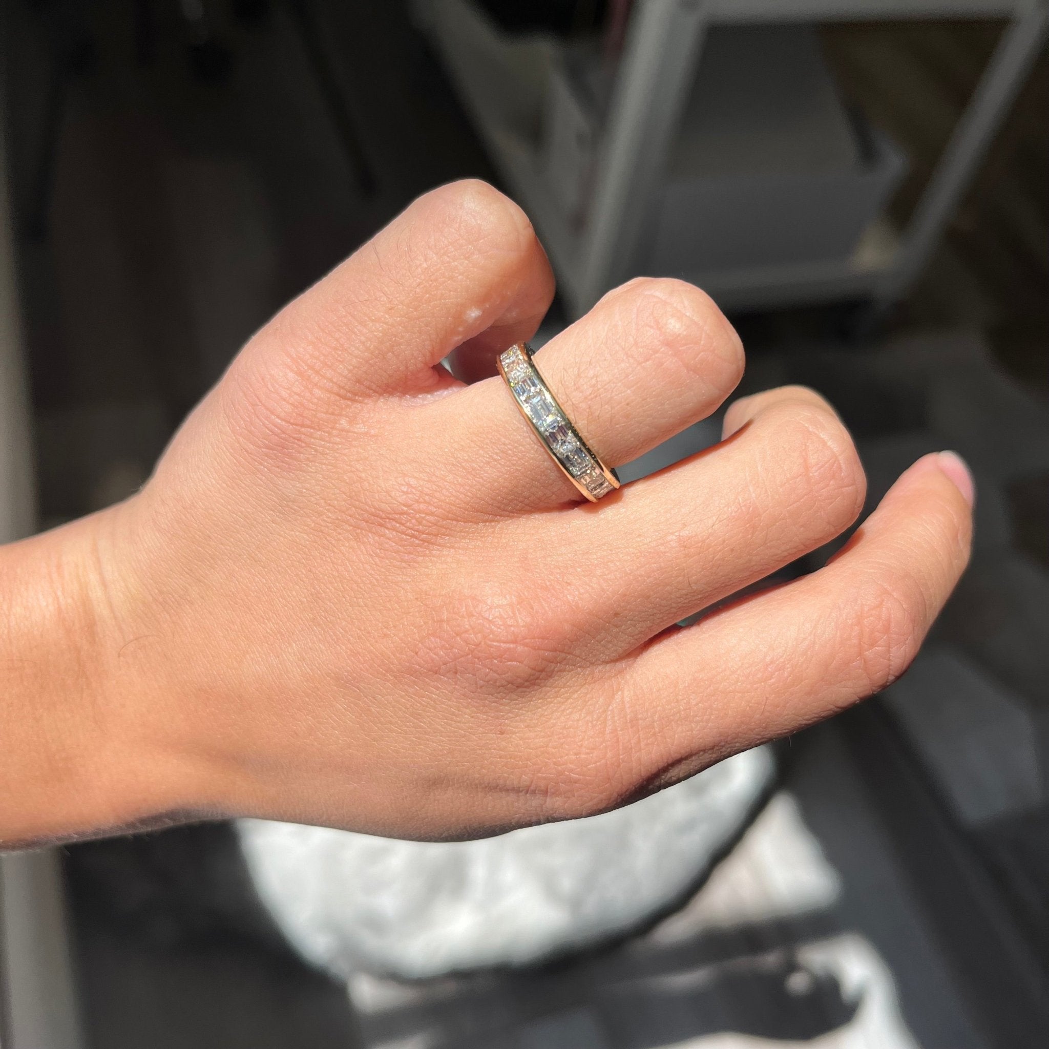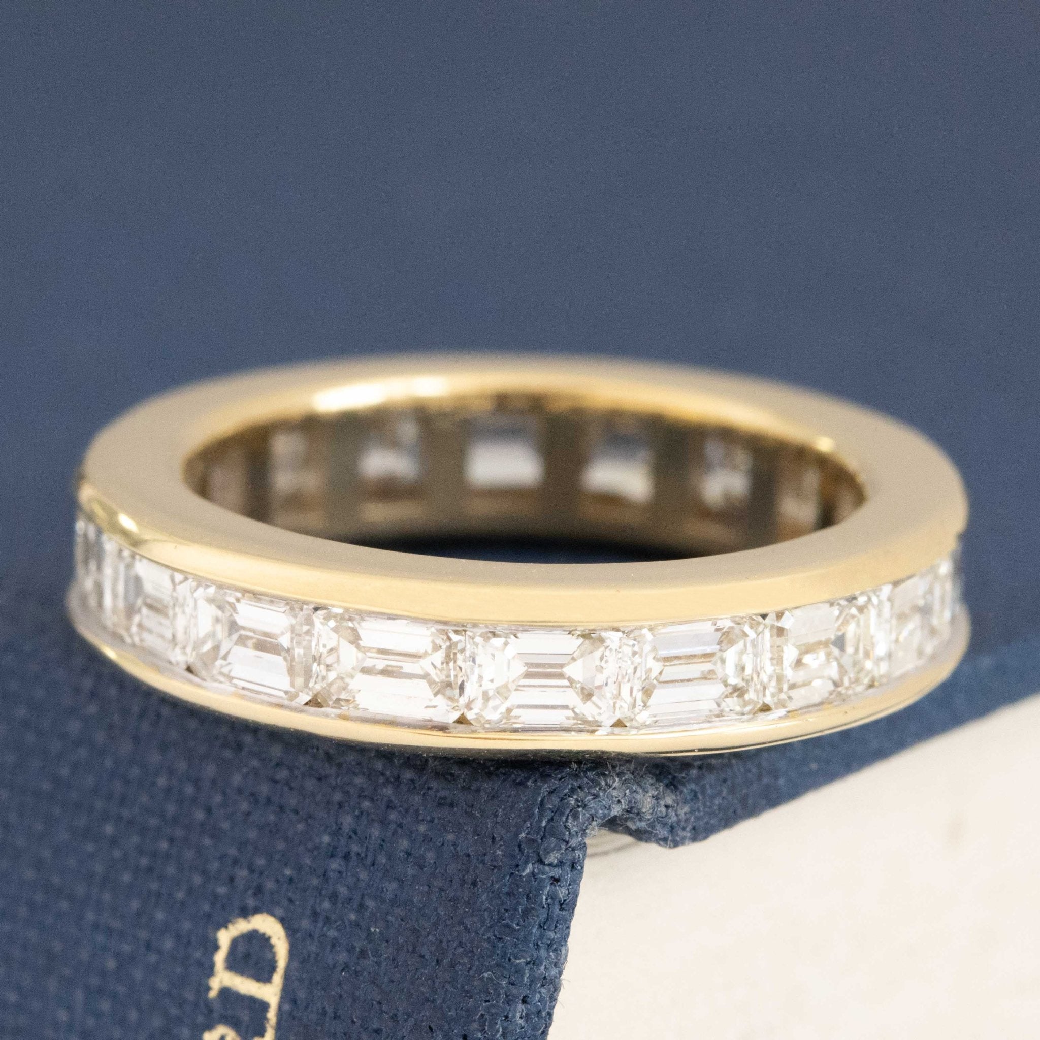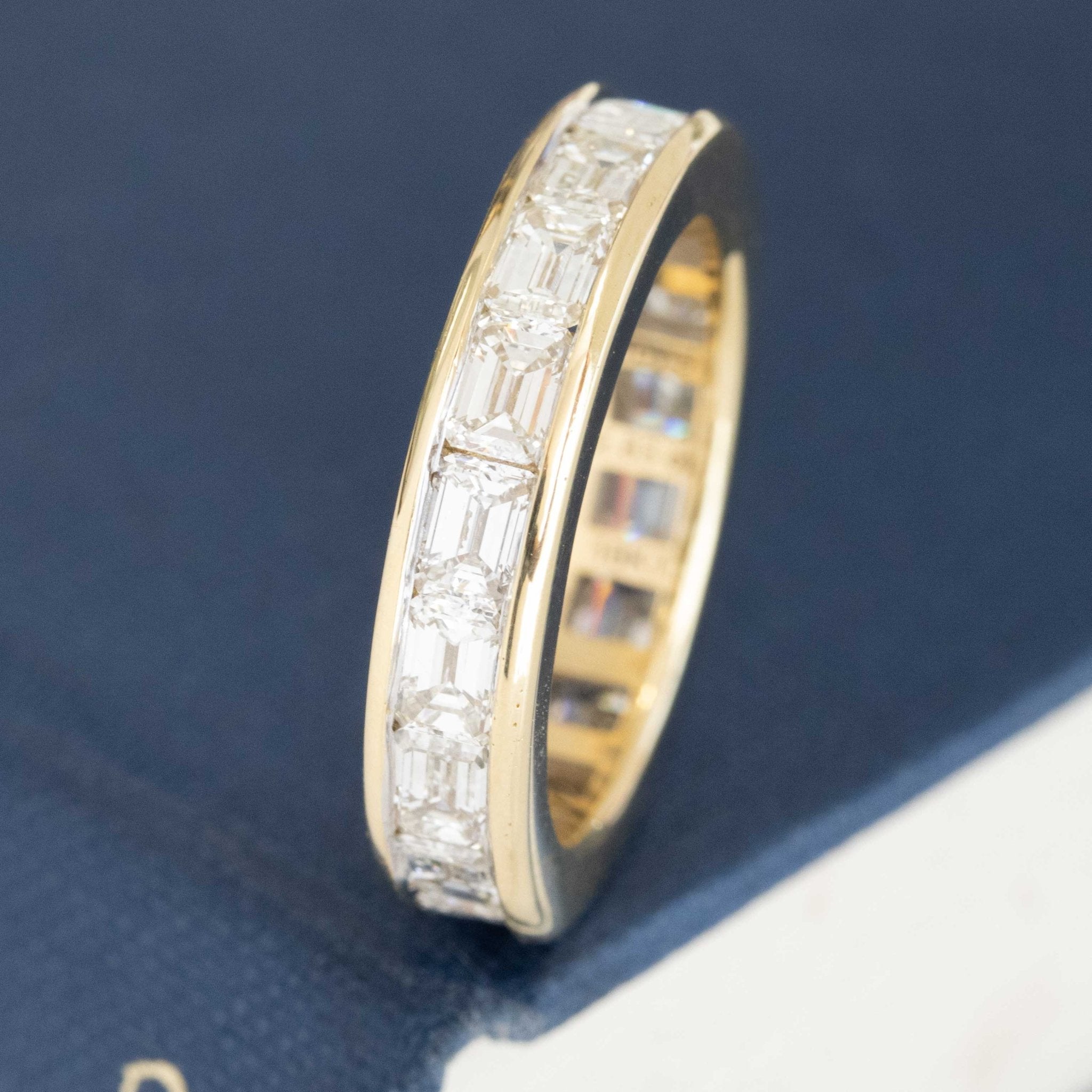 A classic emerald cut diamond eternity band in a channel style setting! Set in warm yellow gold, this timeless piece of jewelry spans beautifully around one's finger and stacks well with others.