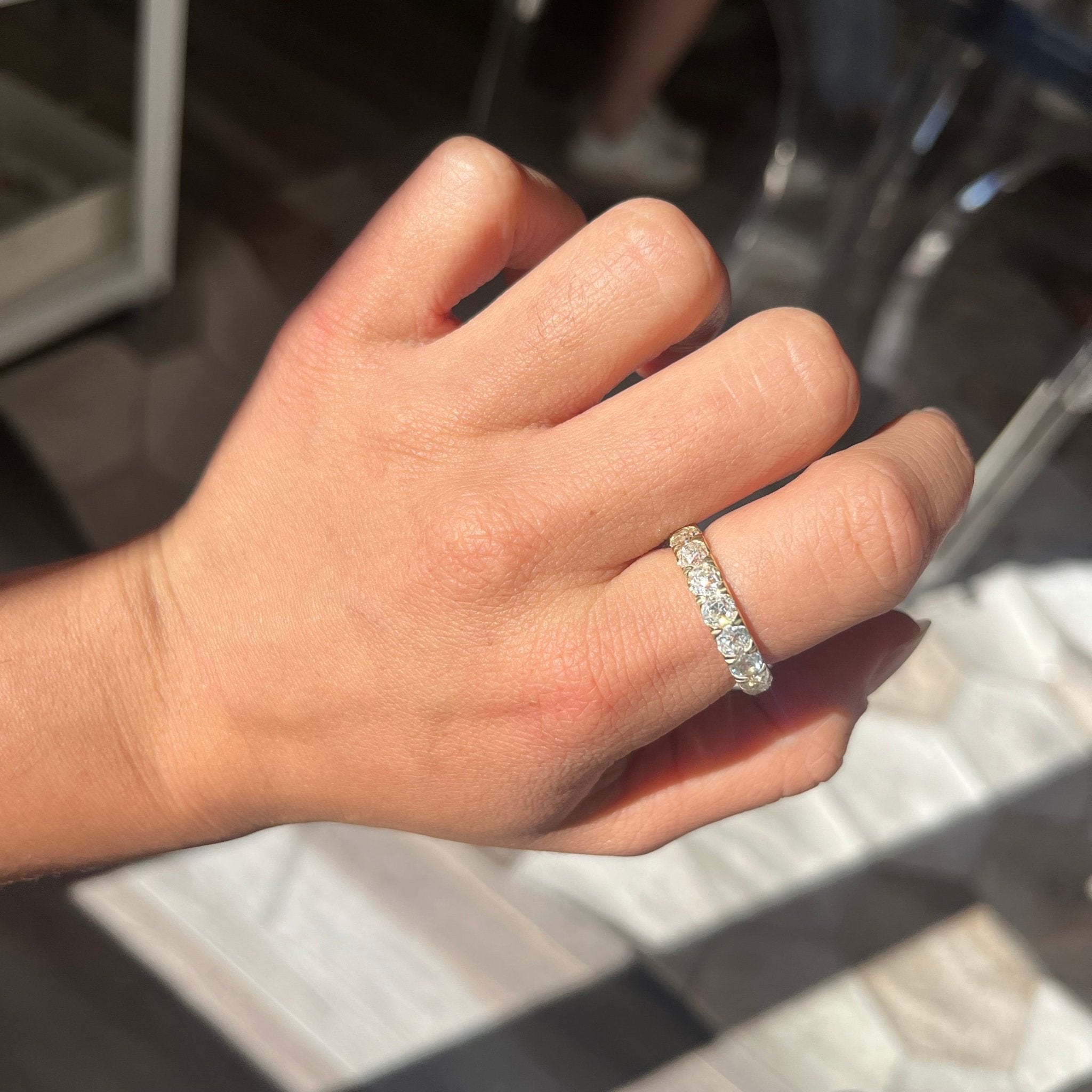 The most buttery Old European cut diamond band on the block! We came across a parcel of the prettiest recycled Old European cut diamonds, all matched in faceting and specs, so the only option was to throw them in a beautiful band! Spready, buttery, and incredibly comfortable on the finger because of its rounded silhoutte, this band is a perfect addition to one's jewelry collection. Made in a half eternity style, to allow for excellent diamond coverage at a great value.