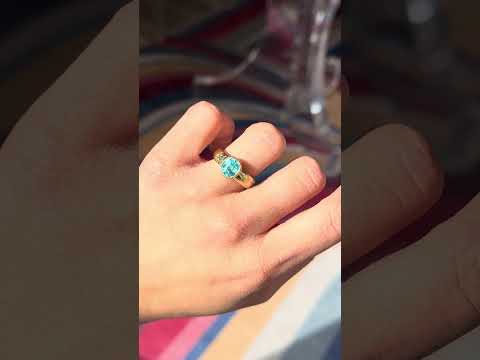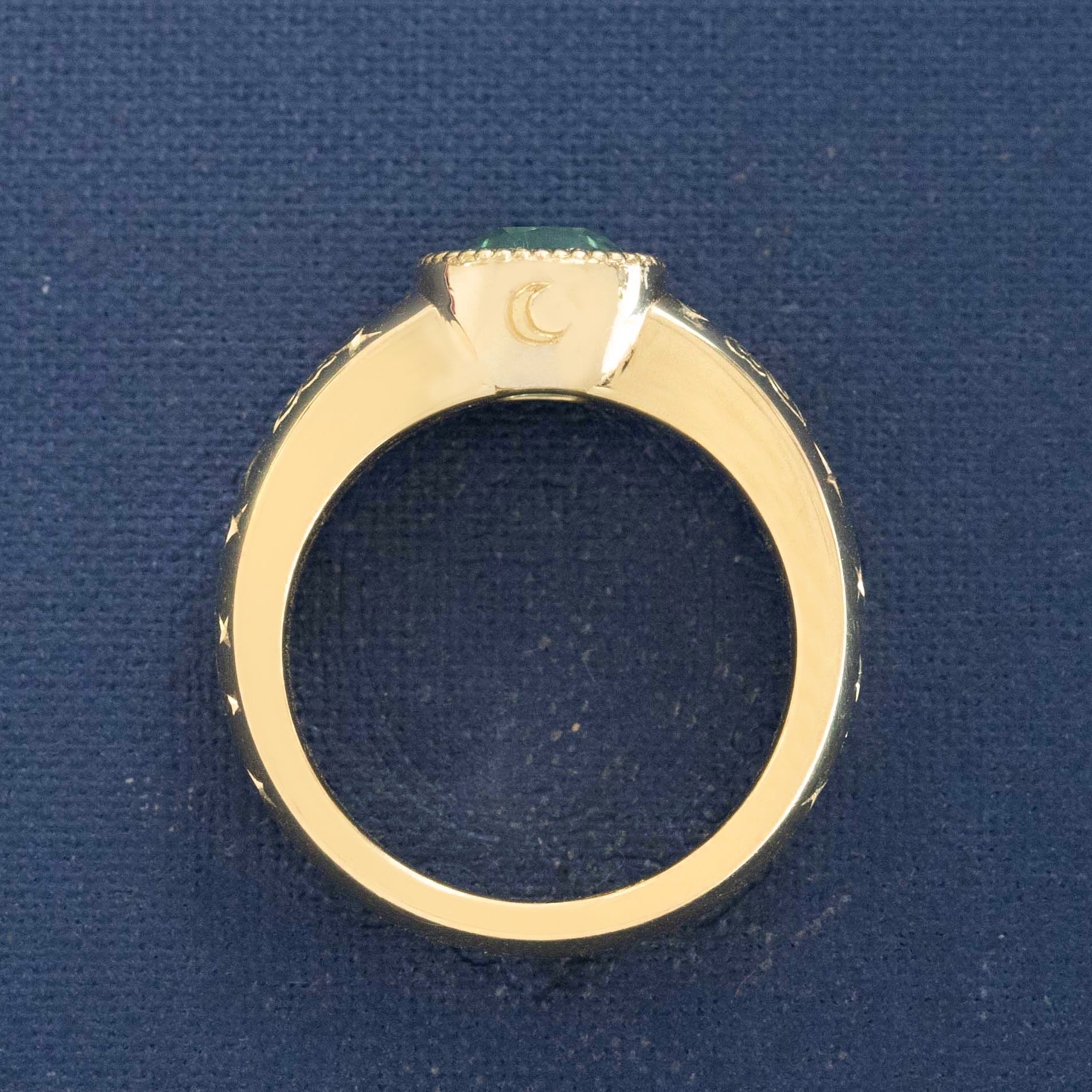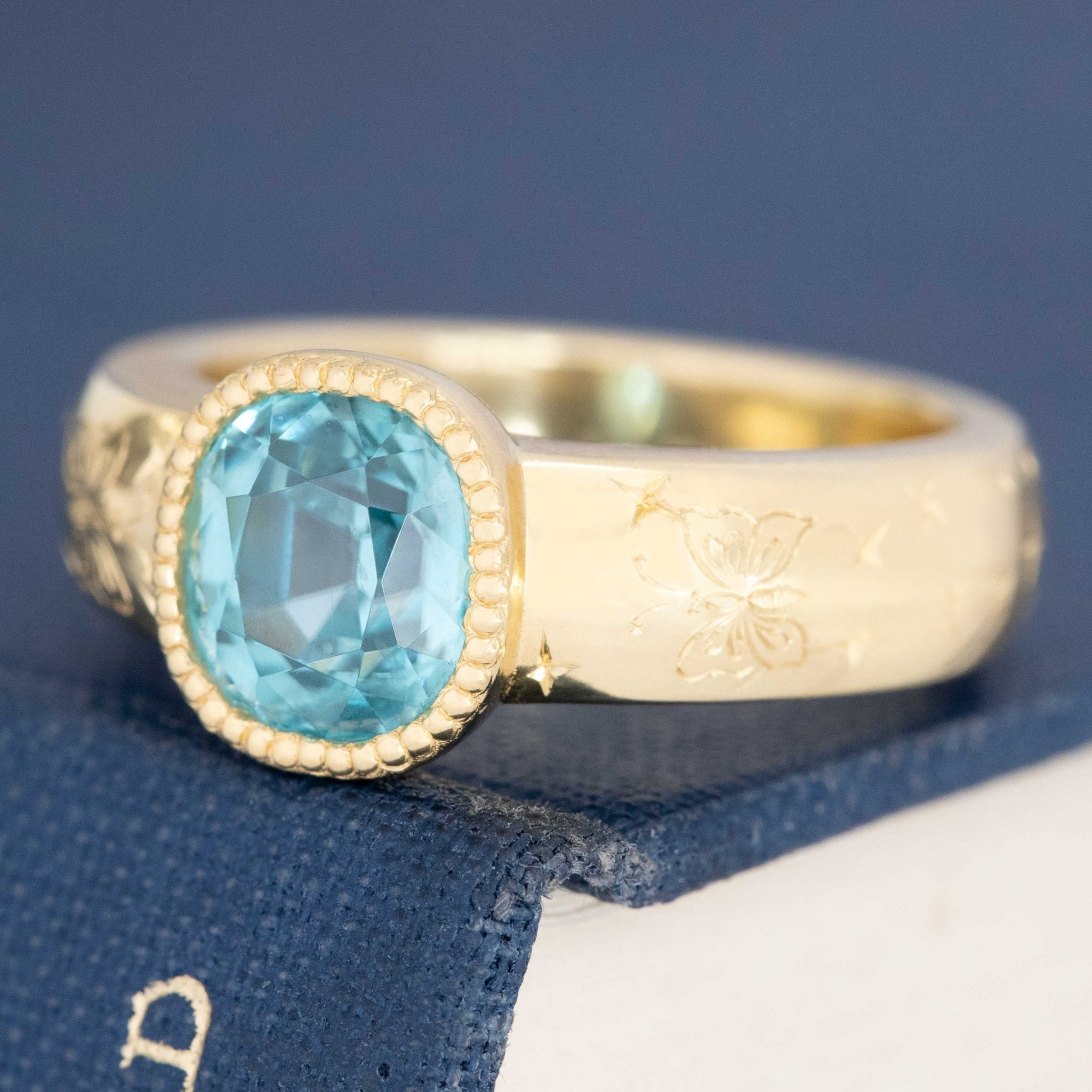 A wonderful collab of the old and the new! The vibrant blue zircon is antique, sourced from an antique brooch. Now set in this sleek, simple band with Victorian-inspired hand engraving of butterflies, crescent moons, and stars. The contrast of the gemstones against the rich yellow gold is beautiful! An excellent, non-conventional engagement ring, or right-hand ring.
