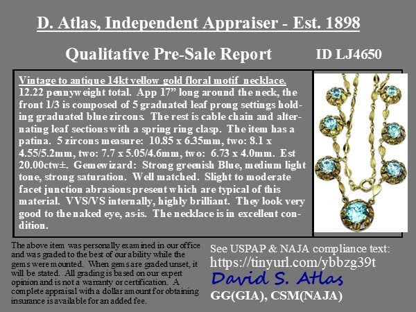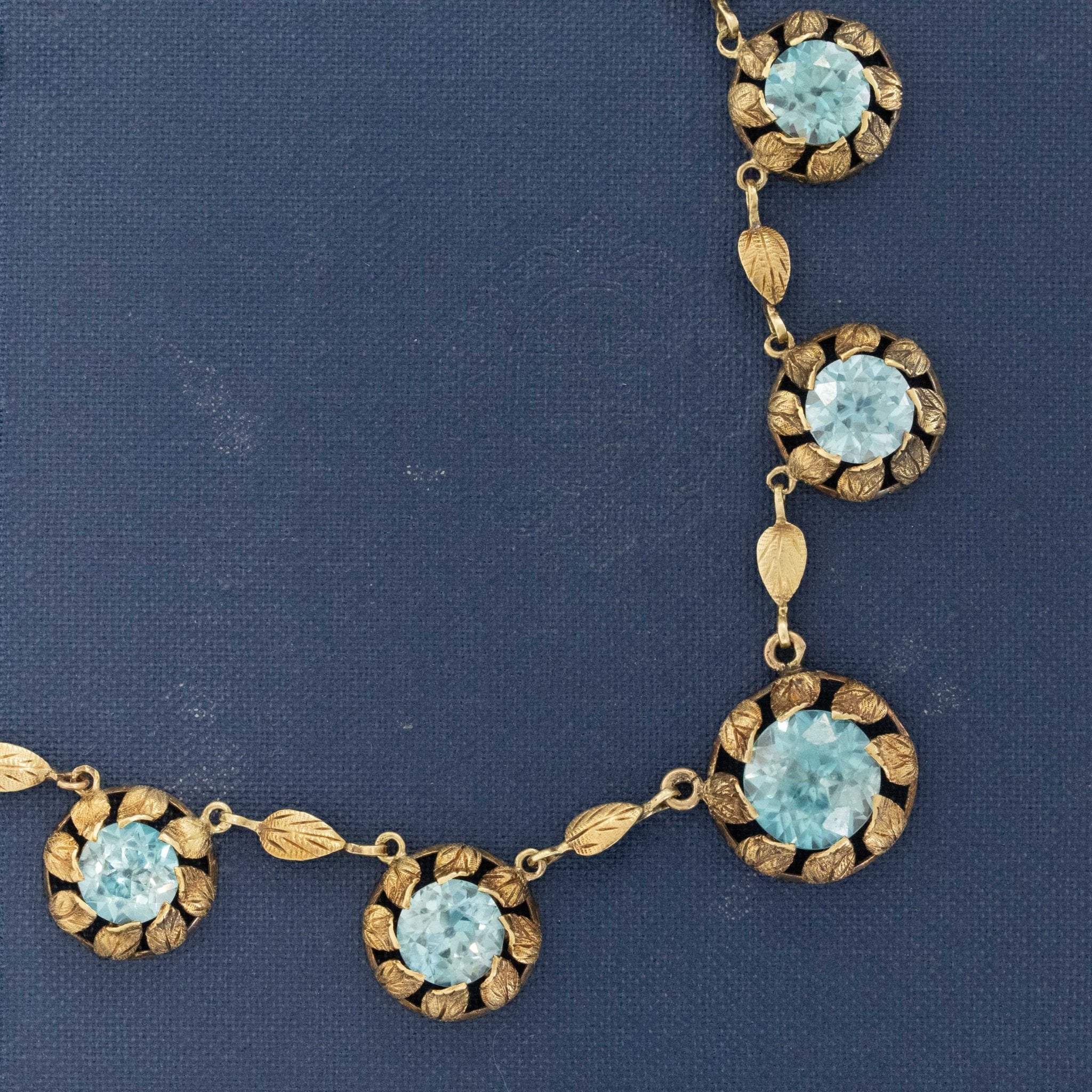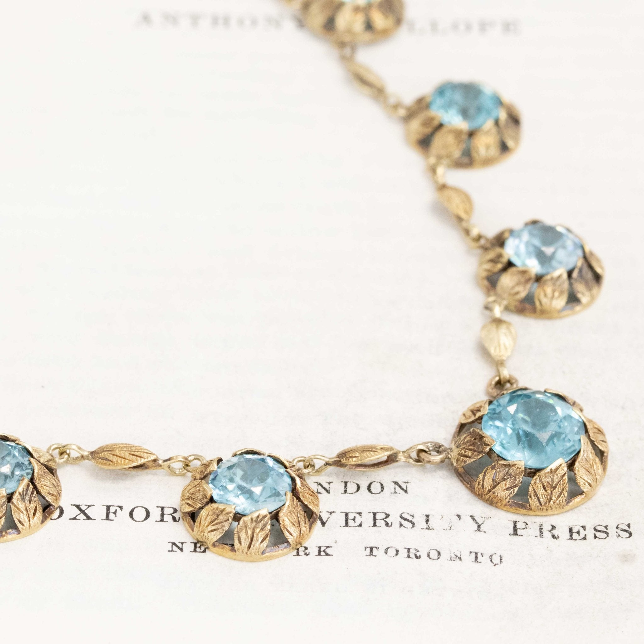 Total Bridgerton vibes with this charming necklace! Bright blue zircons are set in gold floral cups strung on a gold chain with little leaves in between. Whimsical and romantic, with gorgeous patina to boot.