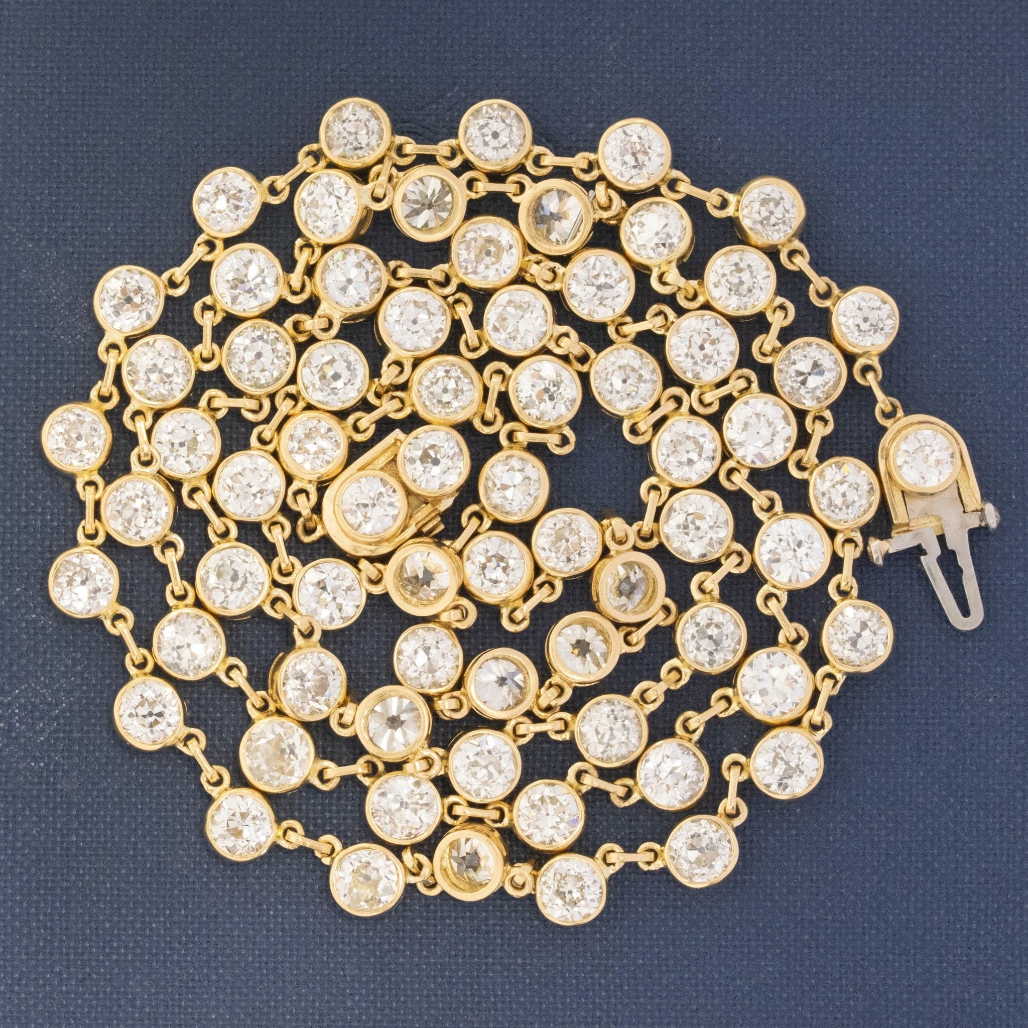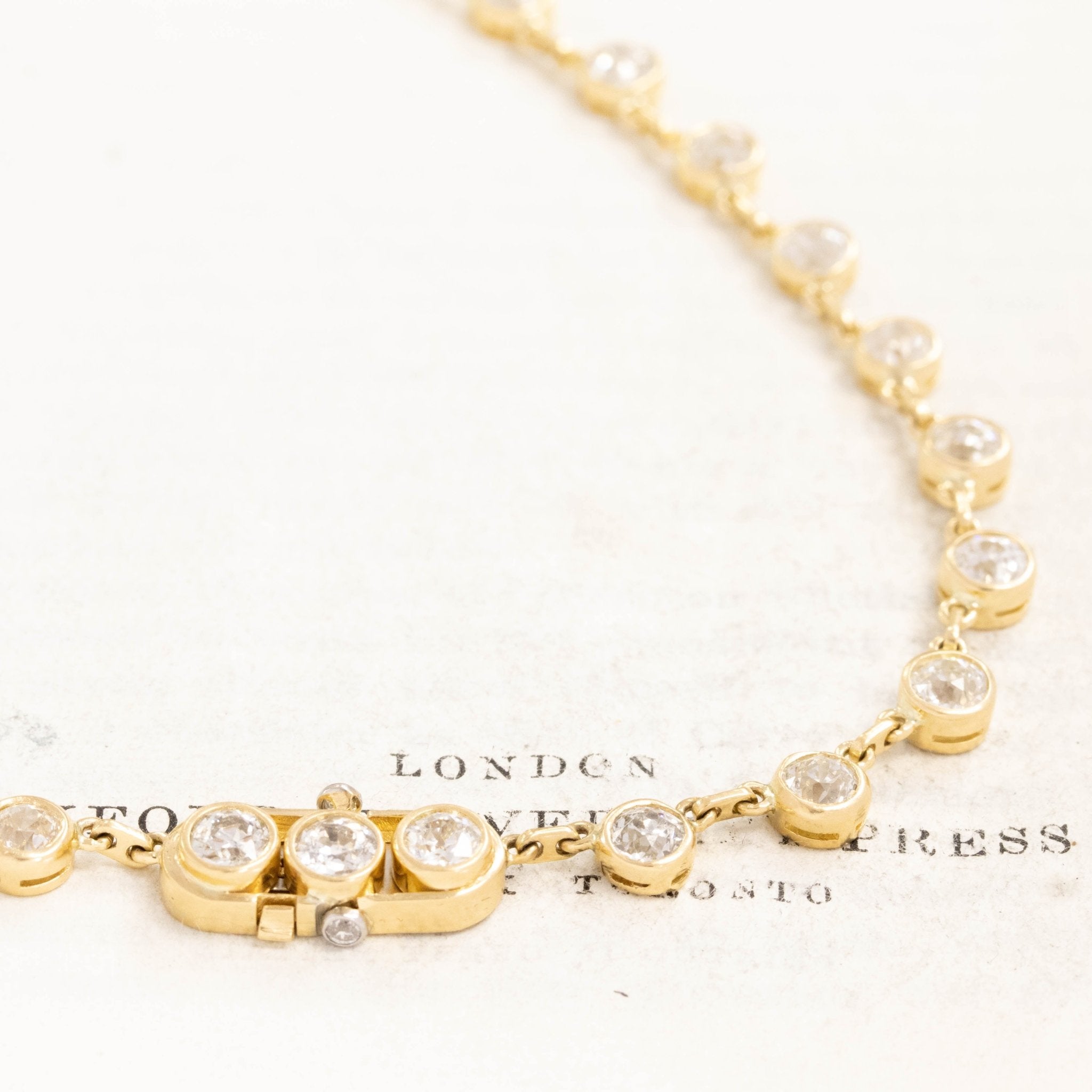 When we put this necklace on, all we can think of is - MAGNIFICENT! And she is all that, and then some! The diamonds are all upcycled (and collected over some time) old European cut diamonds sourced as a big parcel which we set in a custom-commissioned, hand-crafted 18kt yellow gold bezels and chain. The diamonds are all matched perfectly, twinkling and sparkling like mad on the chest. Its literally like wearing a disco ball on your neck!