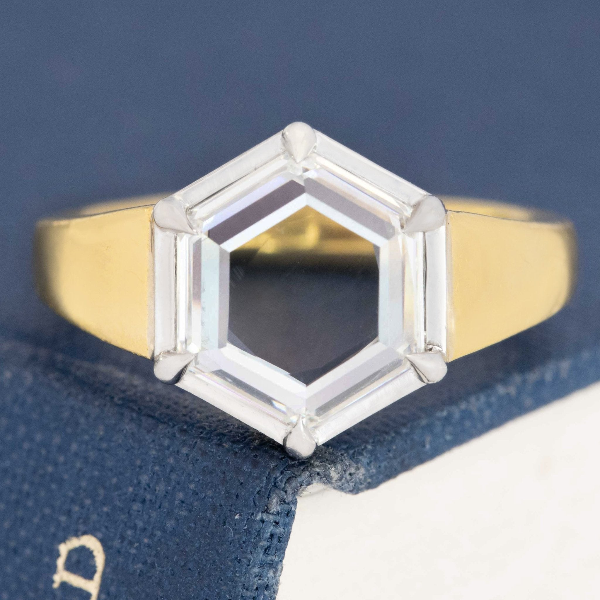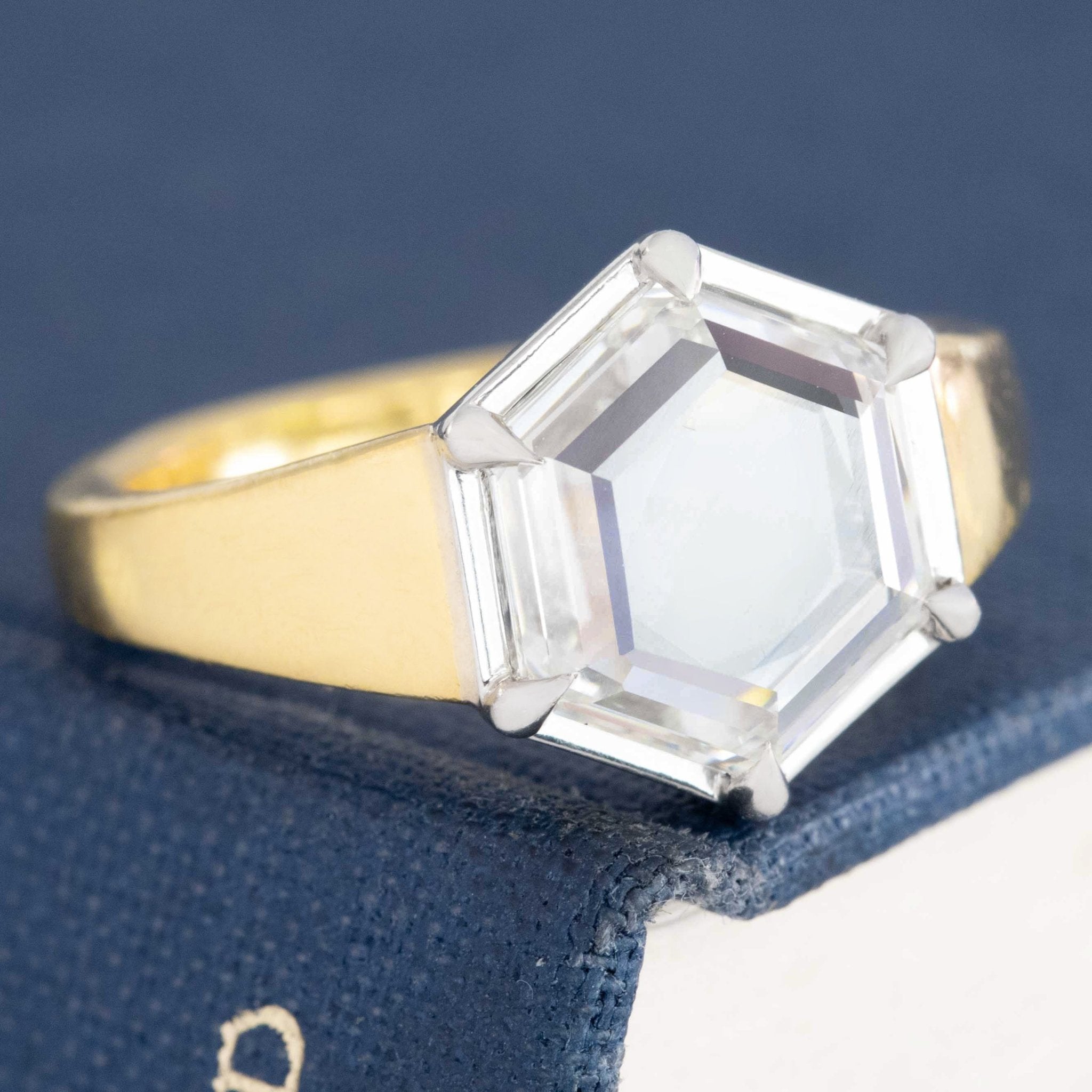 Chic doesn’t even cover it — this is easily one of the most unique rings we’ve ever dreamt up. Our super rare 3.00ct Hexagonal Portrait Cut Diamond, GIA certified G VS1, sits in a low-profile platinum setting with an 18kt yellow gold shank for the perfect touch of contrast.