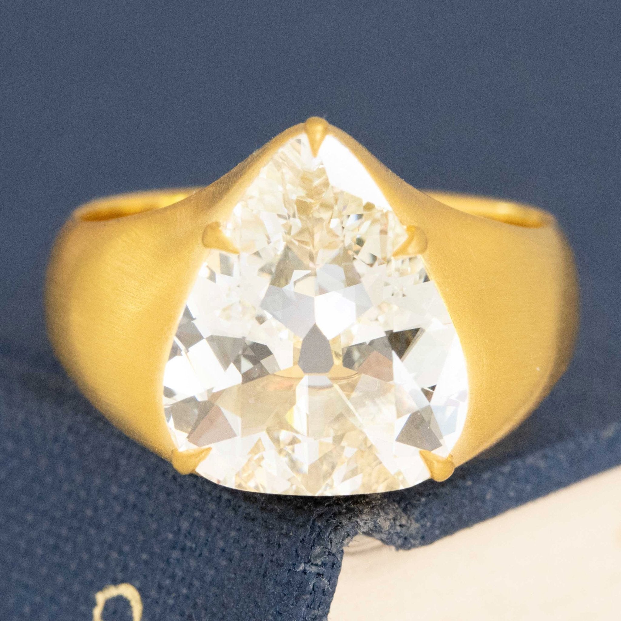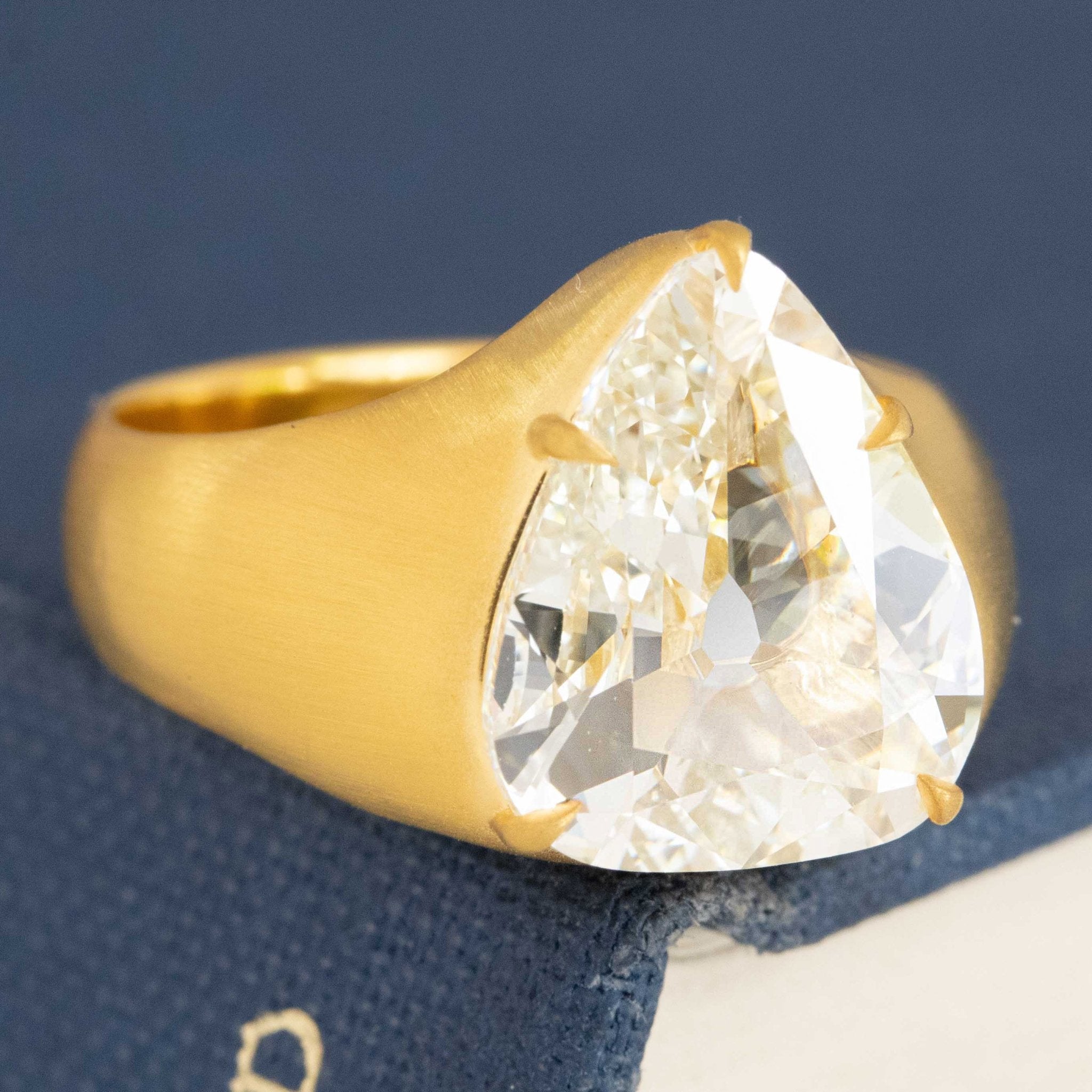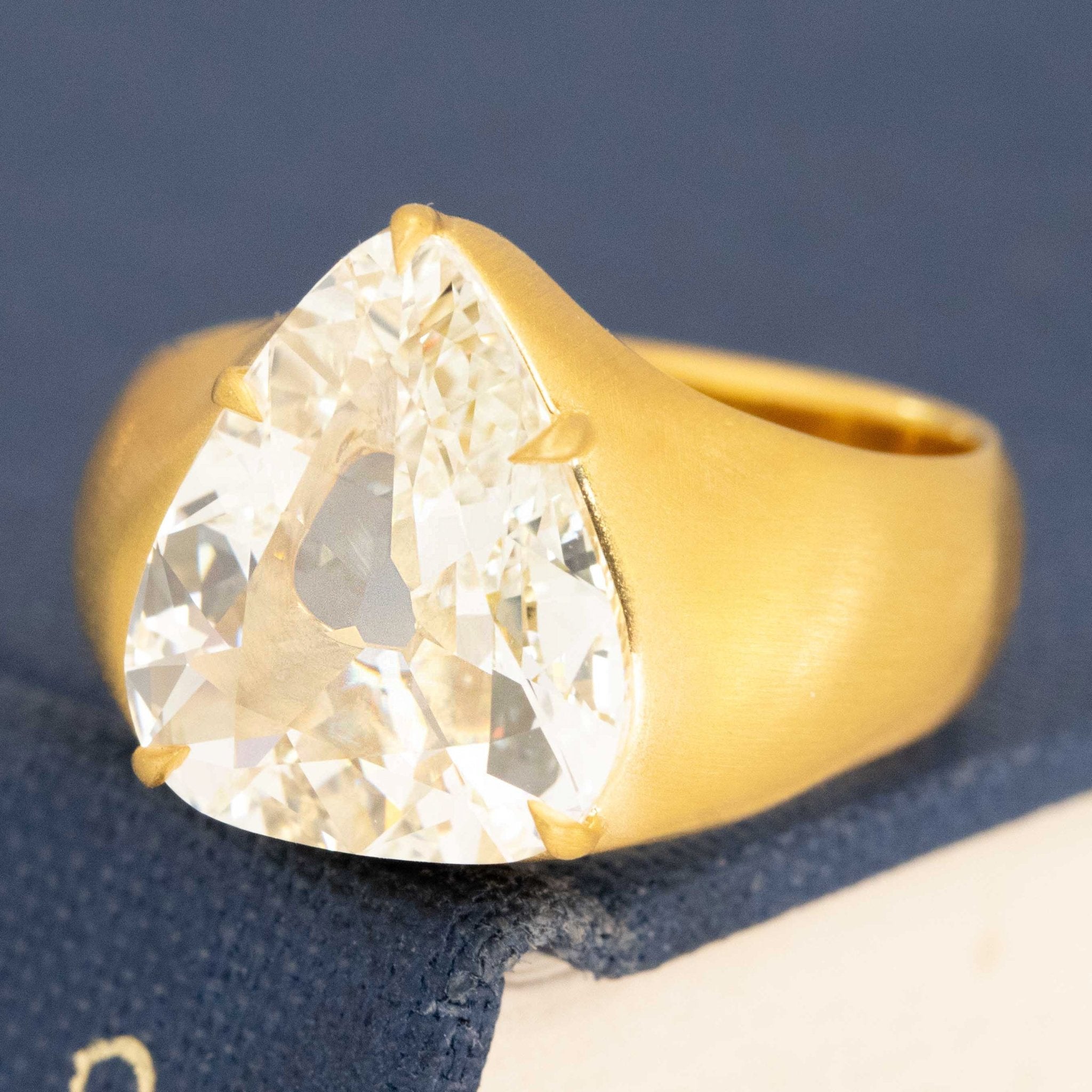 This 3ct chunky pear-cut diamond is pure showstopper material, nestled in a bold, thick yellow gold setting with perfect claw prongs. It's the perfect mix of old-school glamour and modern edge! The pear cut, also known as the teardrop, dates all the way back to the 1400s, but it really took off in the 1800s thanks to some clever diamond cutters. It’s got that striking mix of elegance and flair, with the rounded bottom and pointy top creating maximum sparkle. A real conversation starter, this beauty proves that classic never goes out of style!