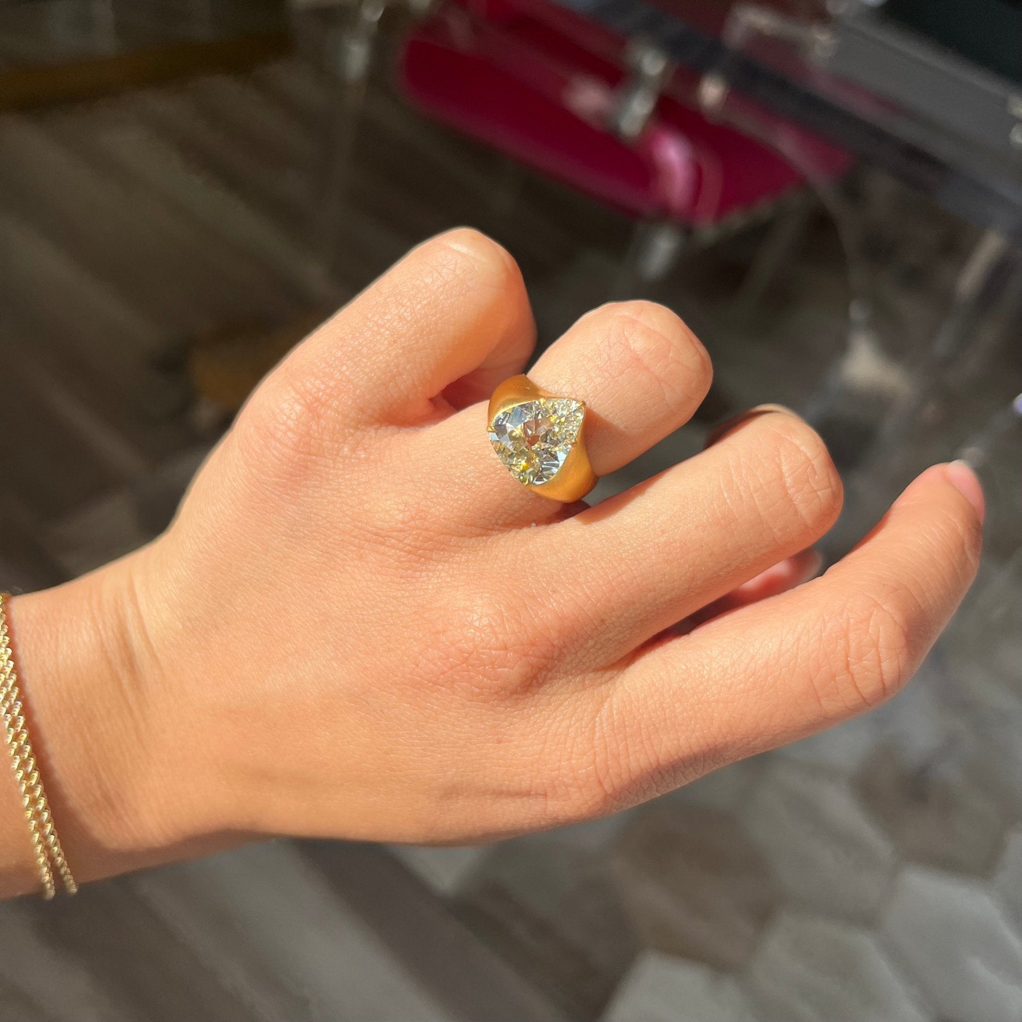 The diamond faces up like a 4ct, with its broad facets twinkling loudly with every movement! The setting is clean and sleek to allow the old cut pear to literally shine in all its chunky glory. On the finger, the ring is bold yet sleek and fluid at the same time. Unique and one of a kind, we just adore how the diamond is like a chameleon - facing up super white and bright in most lighting conditions and rich, buttery yellow is all others!