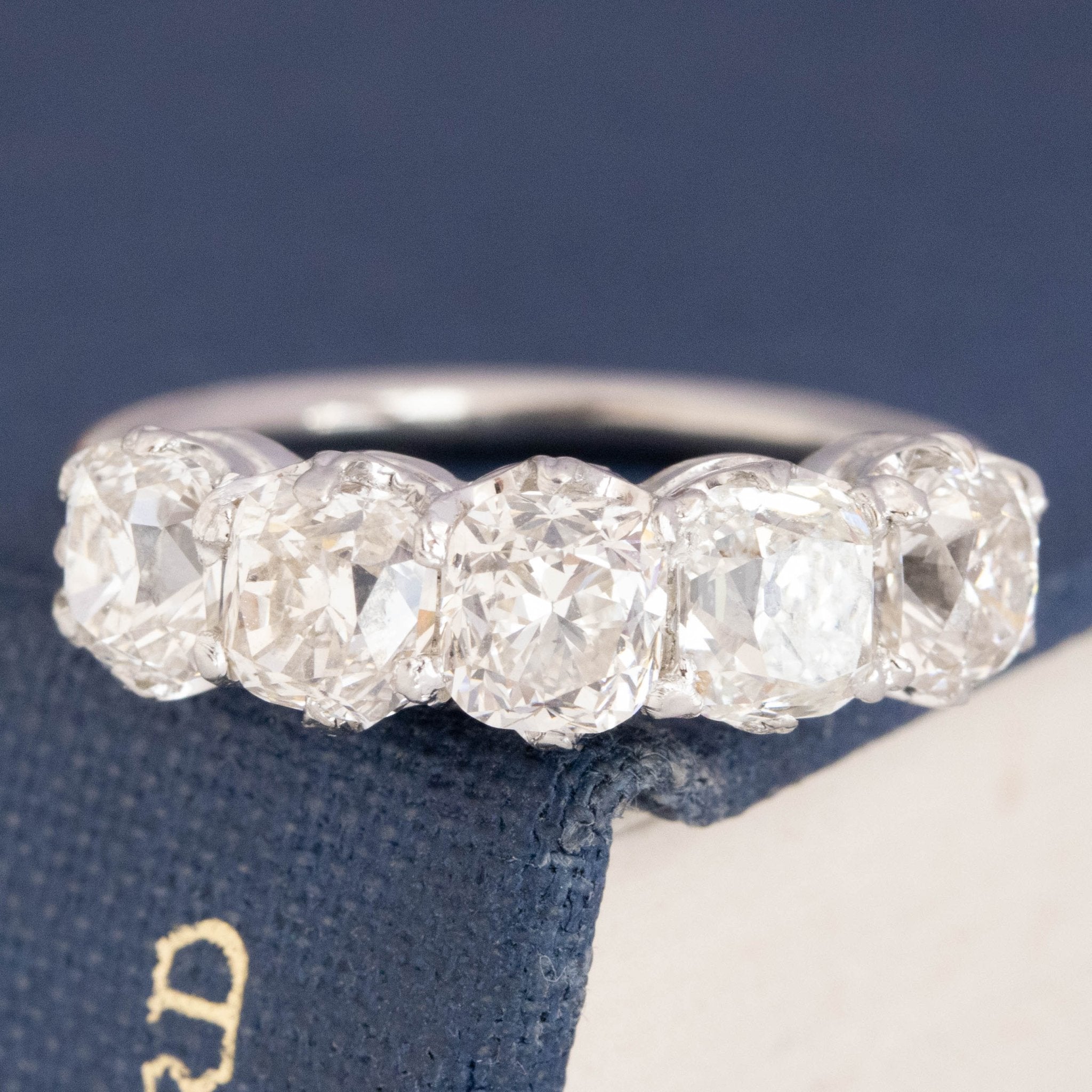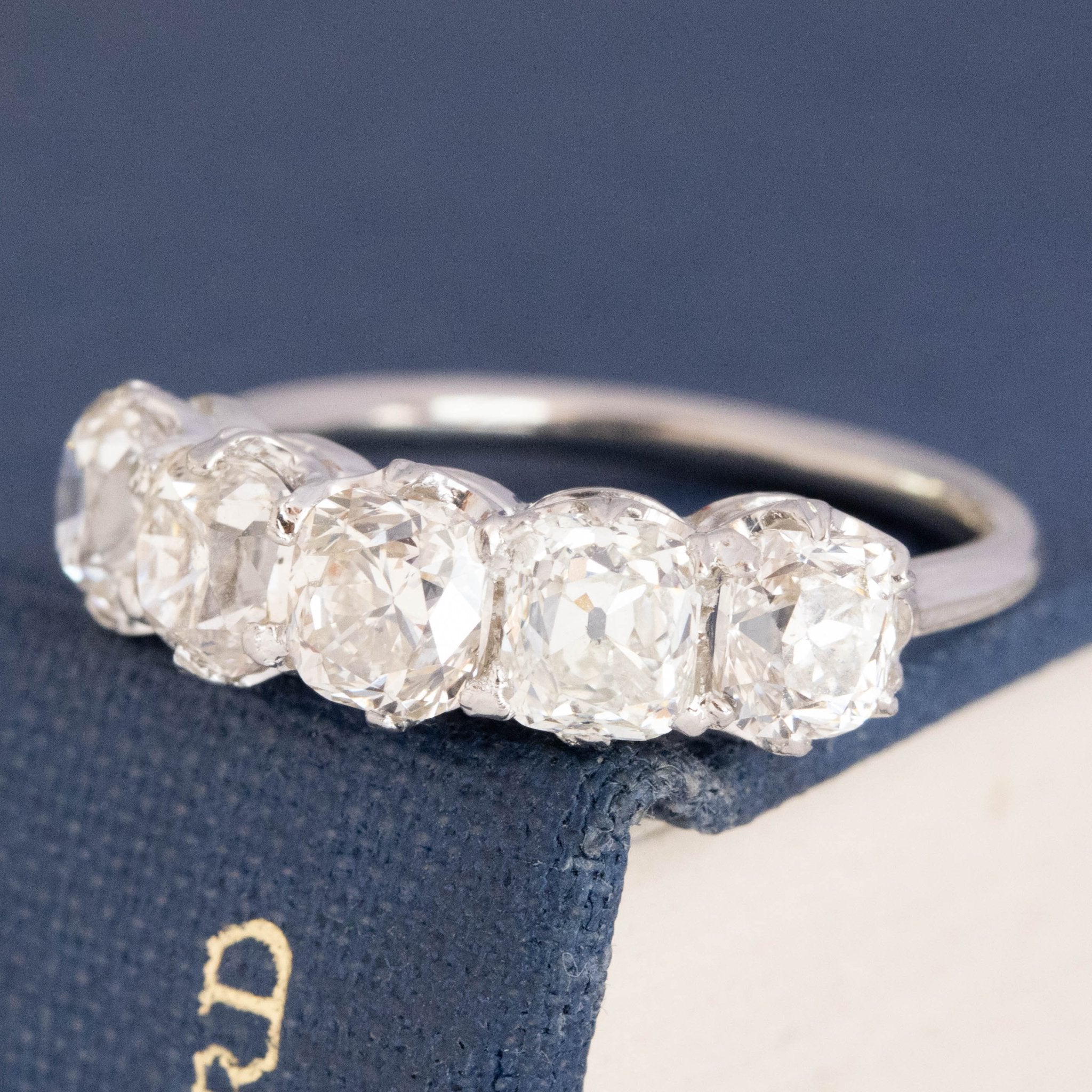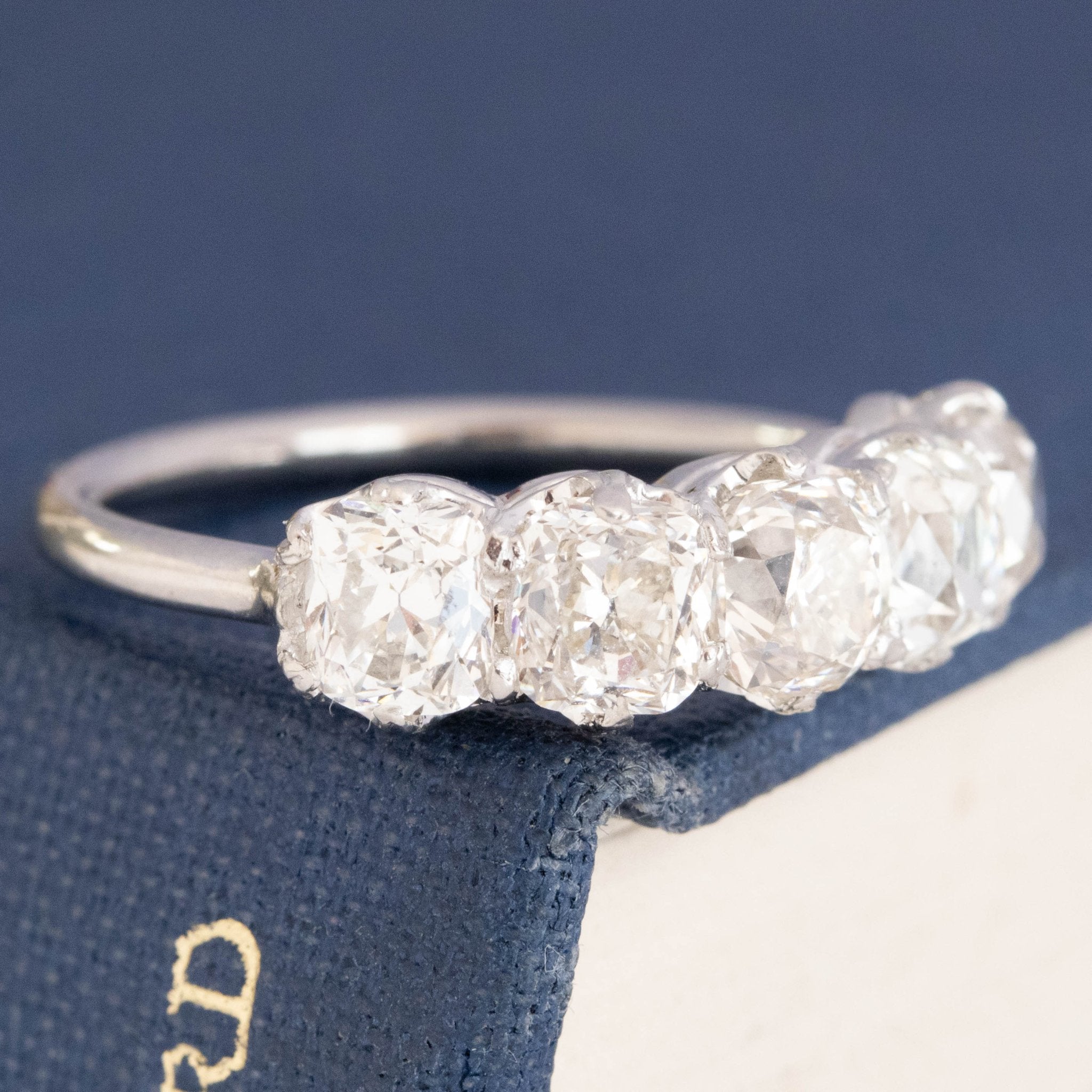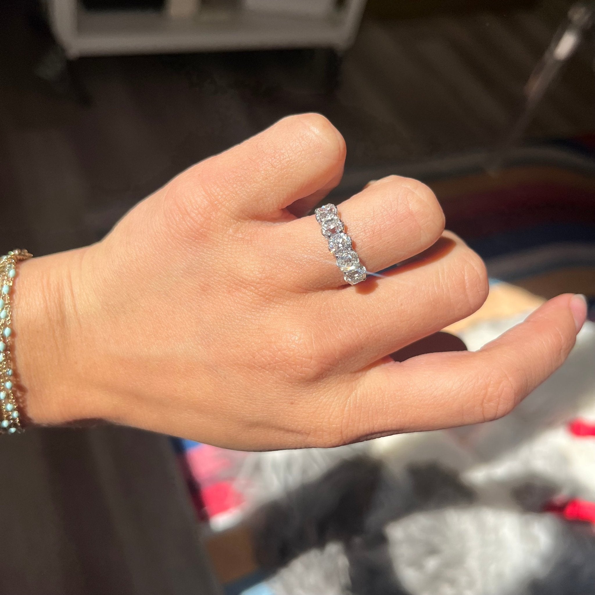 Modeled after antique diamond bands from the Georgian and Victorian eras, this 5-stone band is set with chunky and charming cushion cut diamonds in simple settings with swoopy, airy gallery details. The diamonds are bright and sparkly and just looks so beautiful and elegant on the finger. Our favorite bands by far!