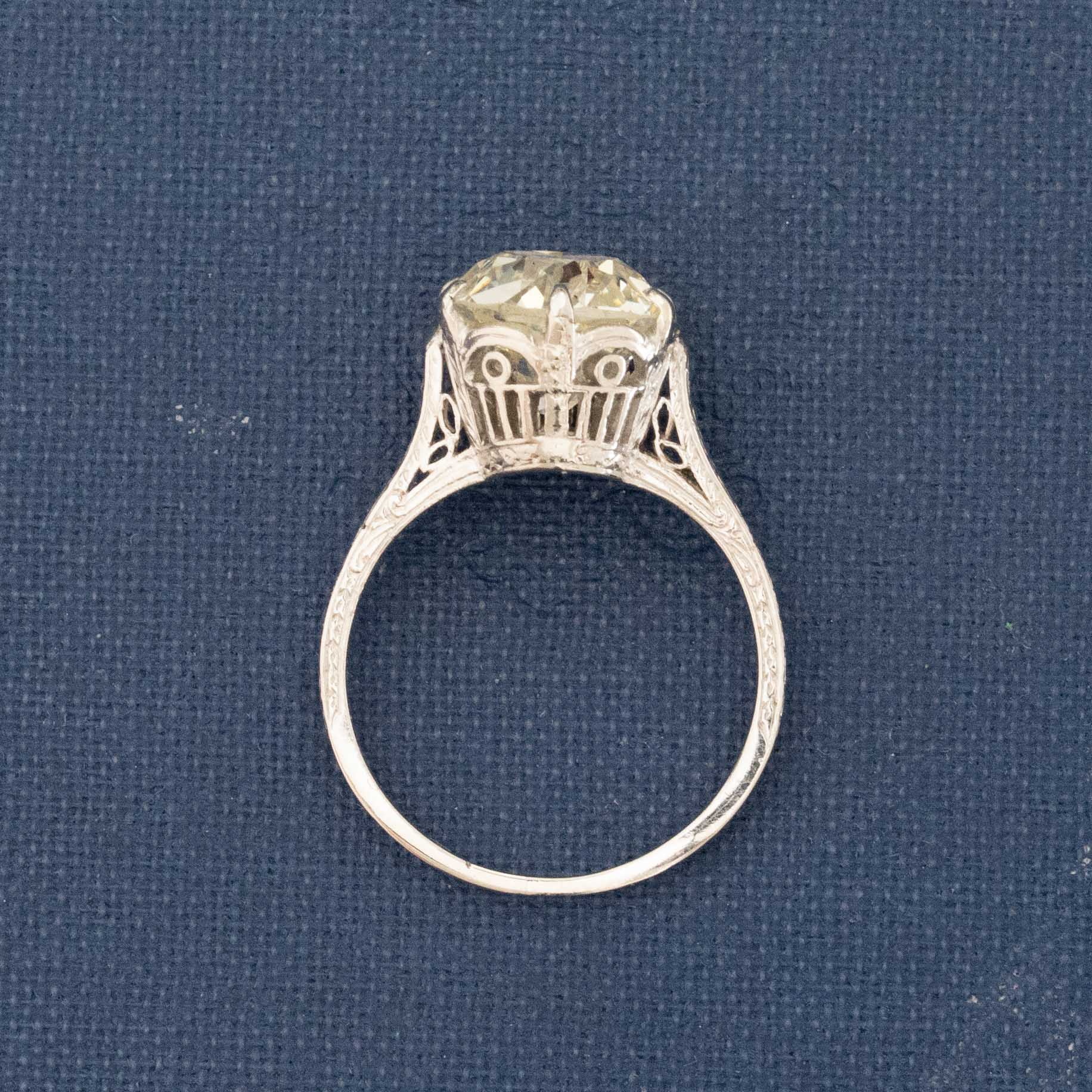 Regal and proud is the best description we can think of when viewing this ring. The diamond has the most charming hint of ivory to her, and the setting has delicate filigree details along the gallery. Just gorgeous, and this allows any wedding band to sit nice and flush with the ring as well.