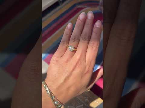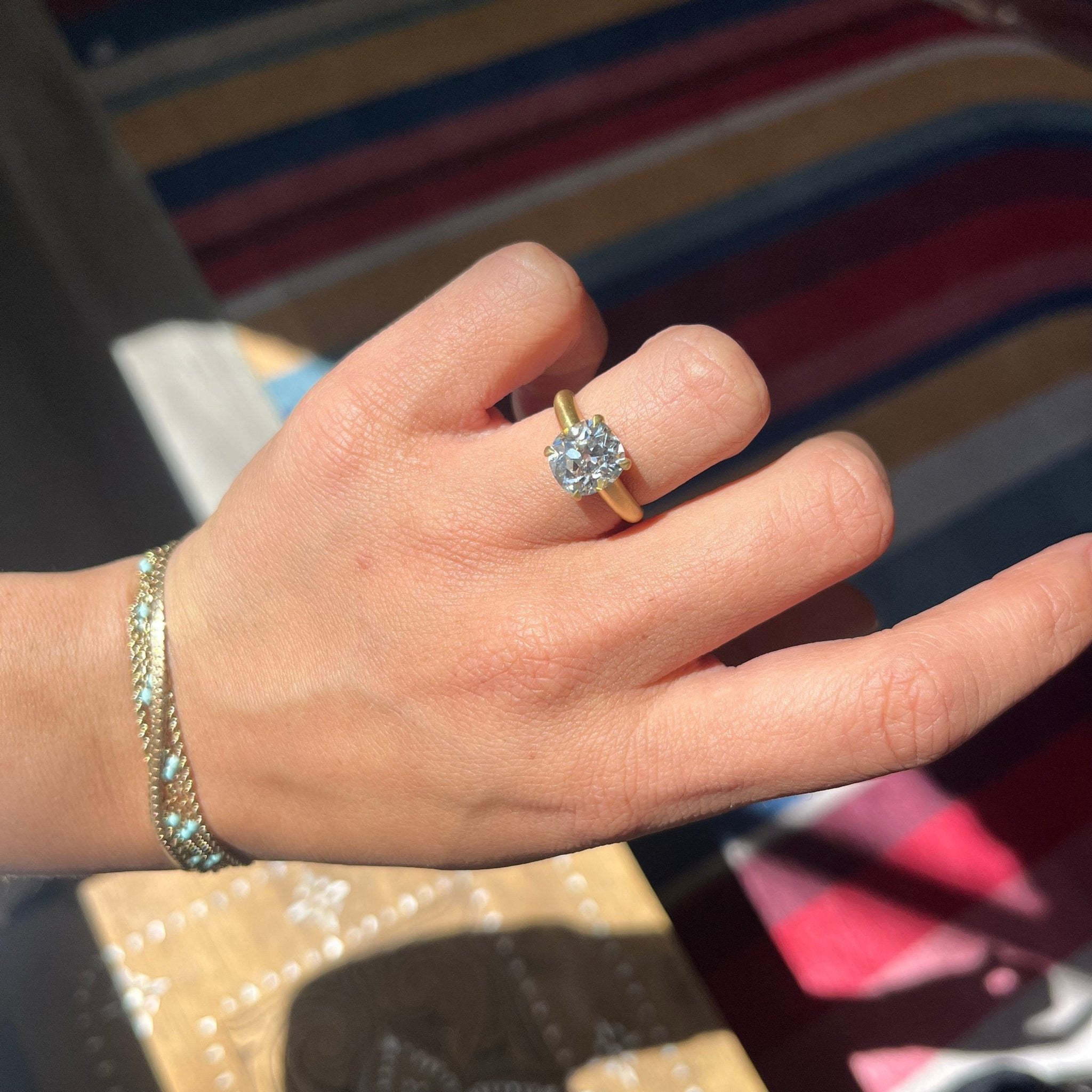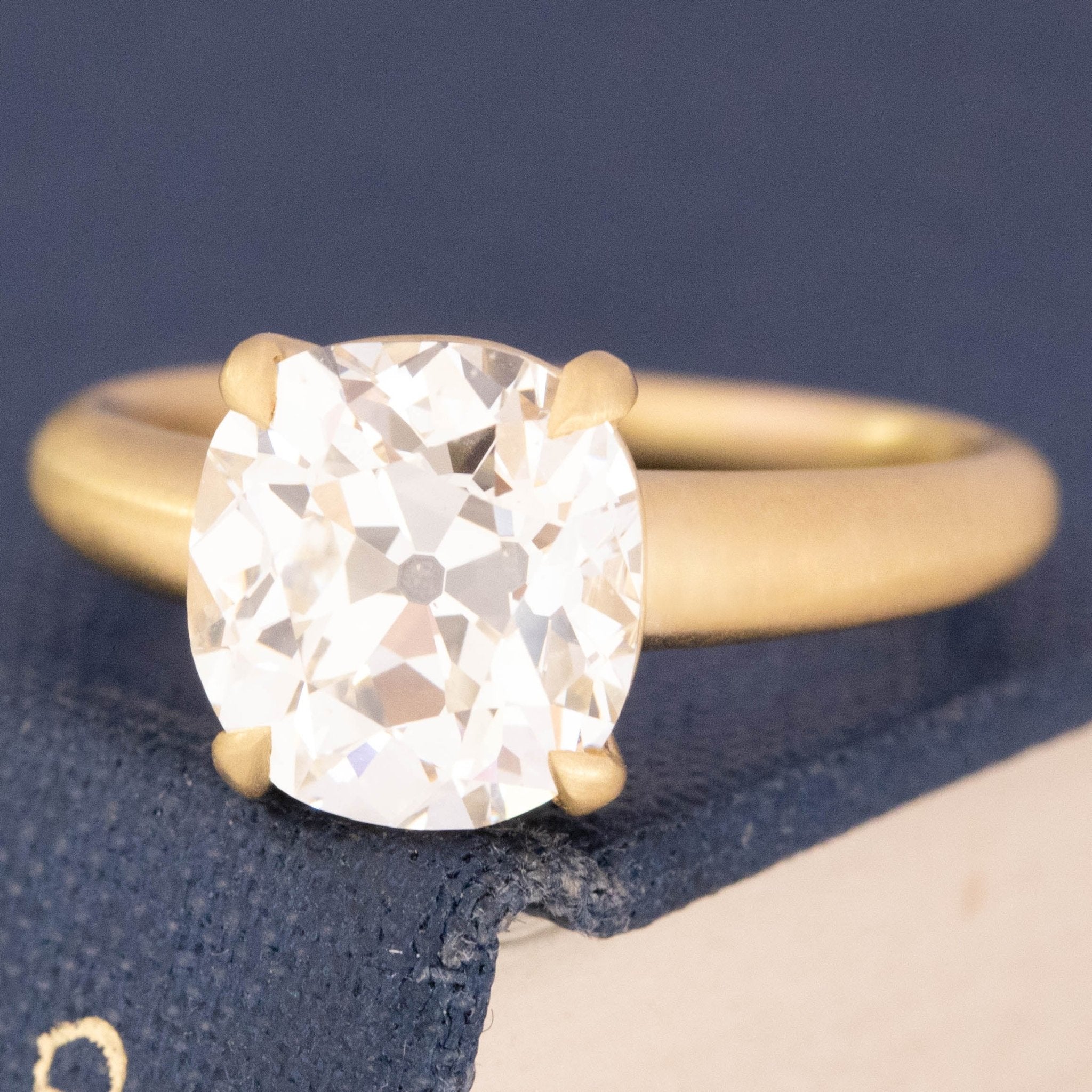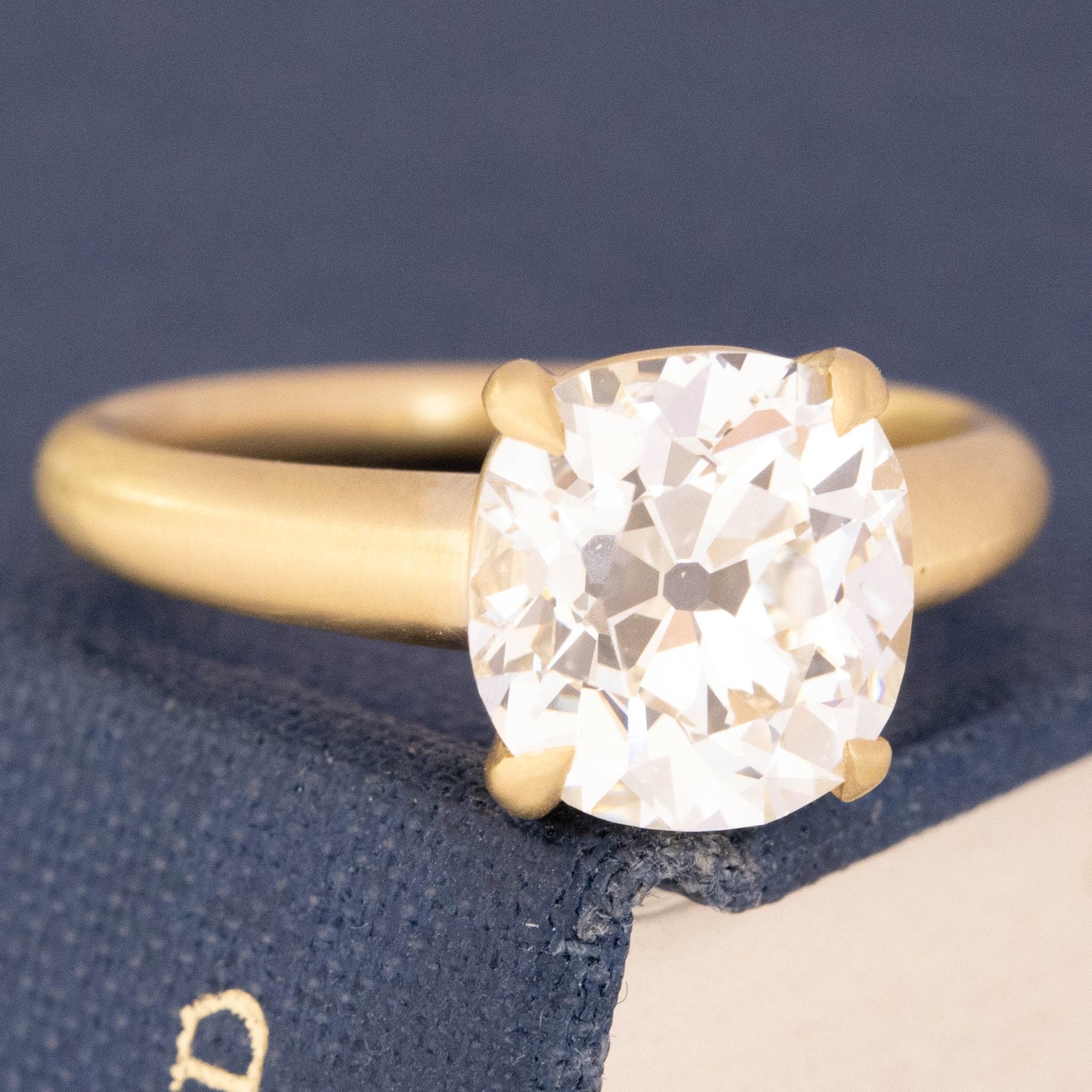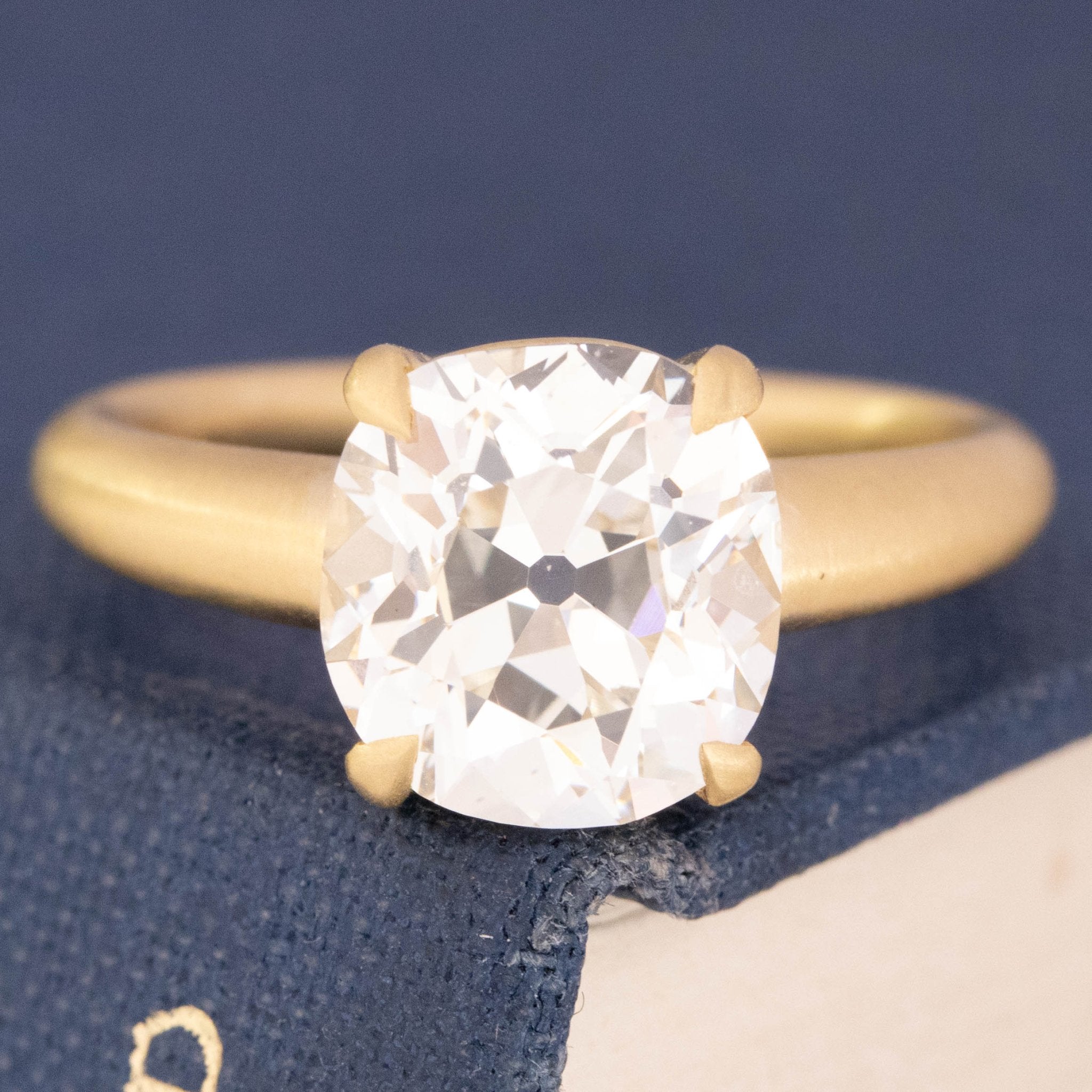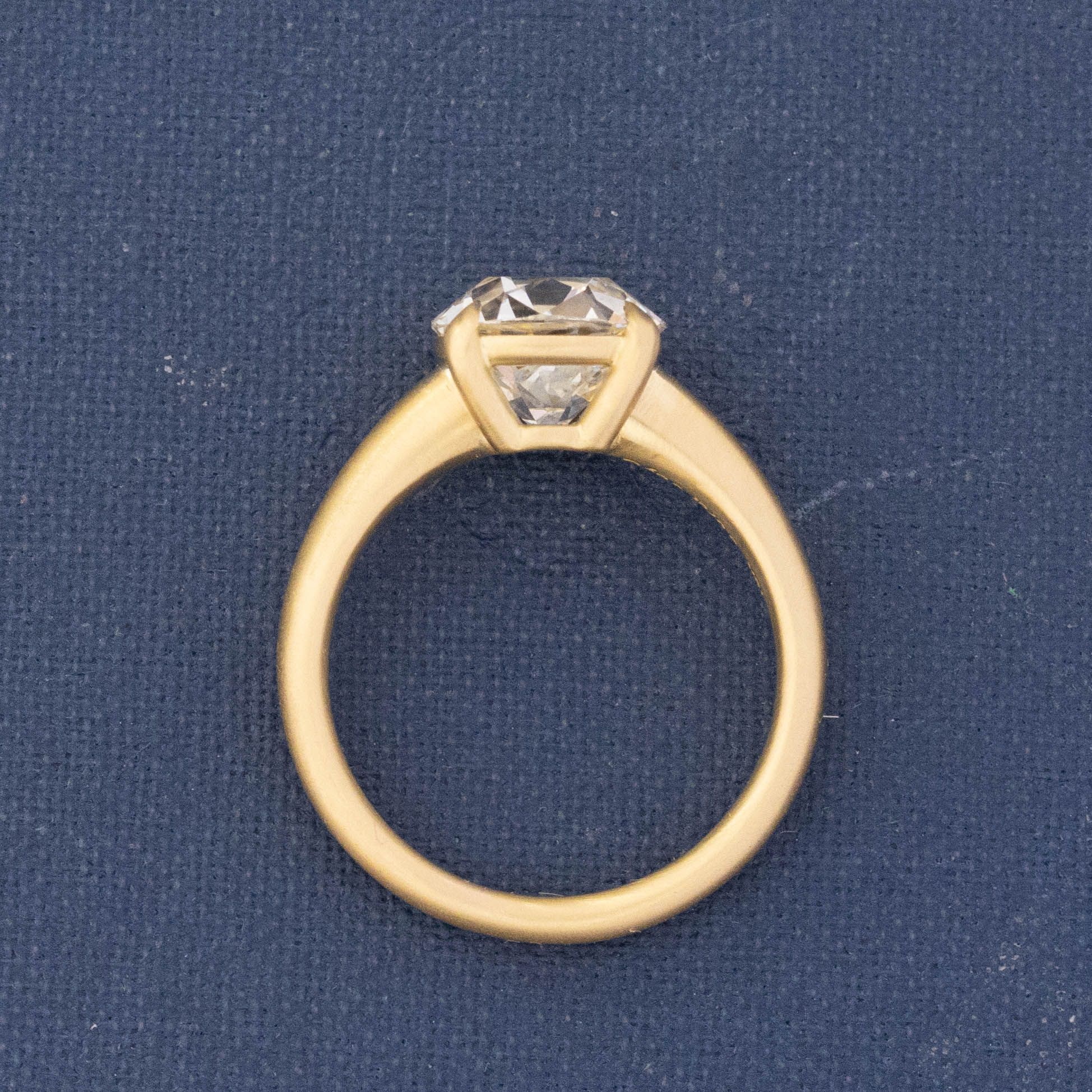 A beautiful 3ct antique old mine cut diamond, ever-so-slightly elongated in shape, with four prongs and a chubby full round shank. This diamond has a beautiful make - she’s got broad facets and the most charming open culet. The ring stacks well with other bands, and that satin finish is to die for.