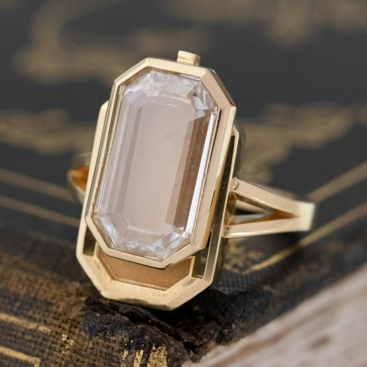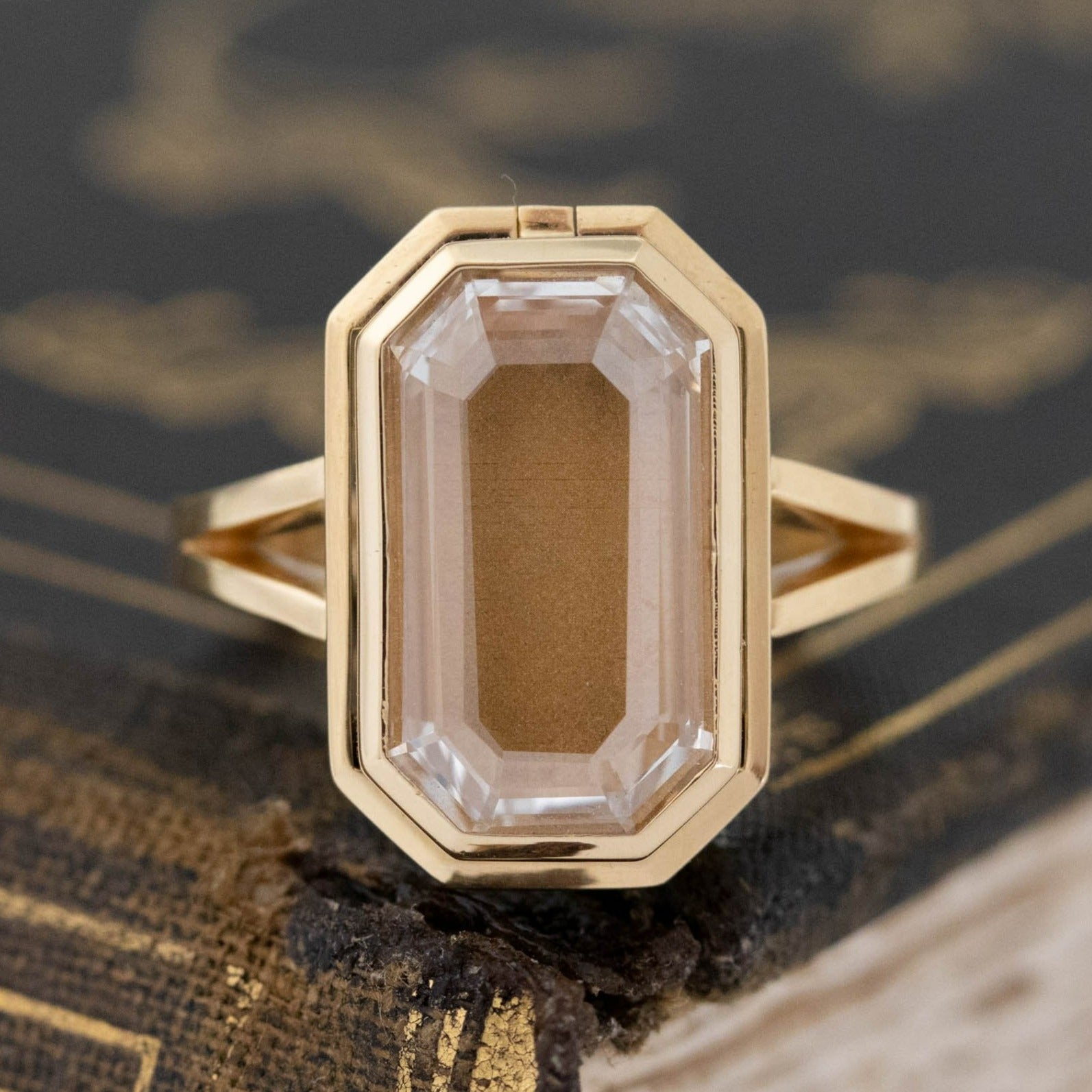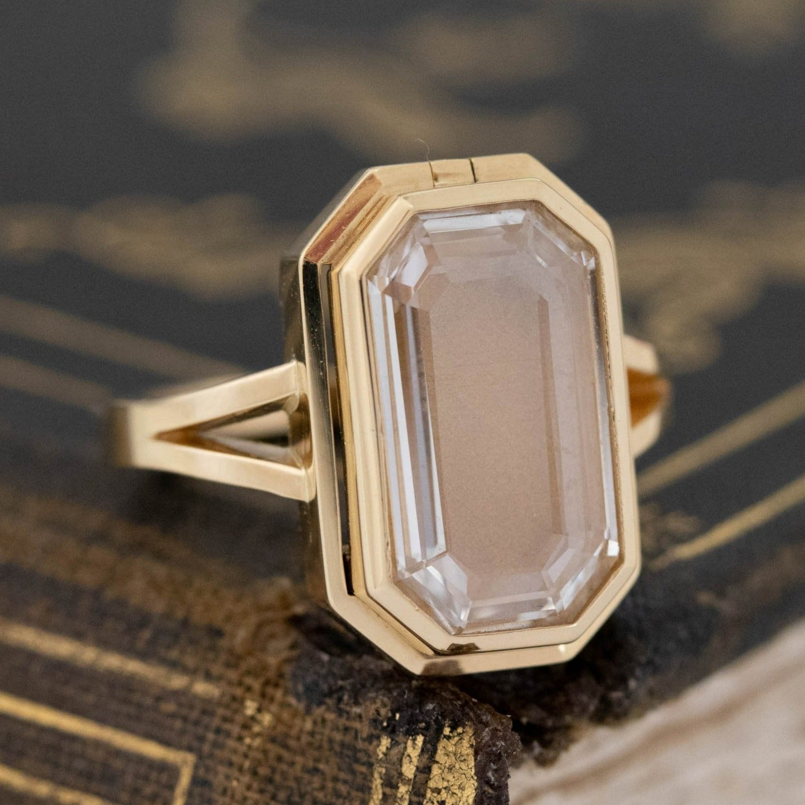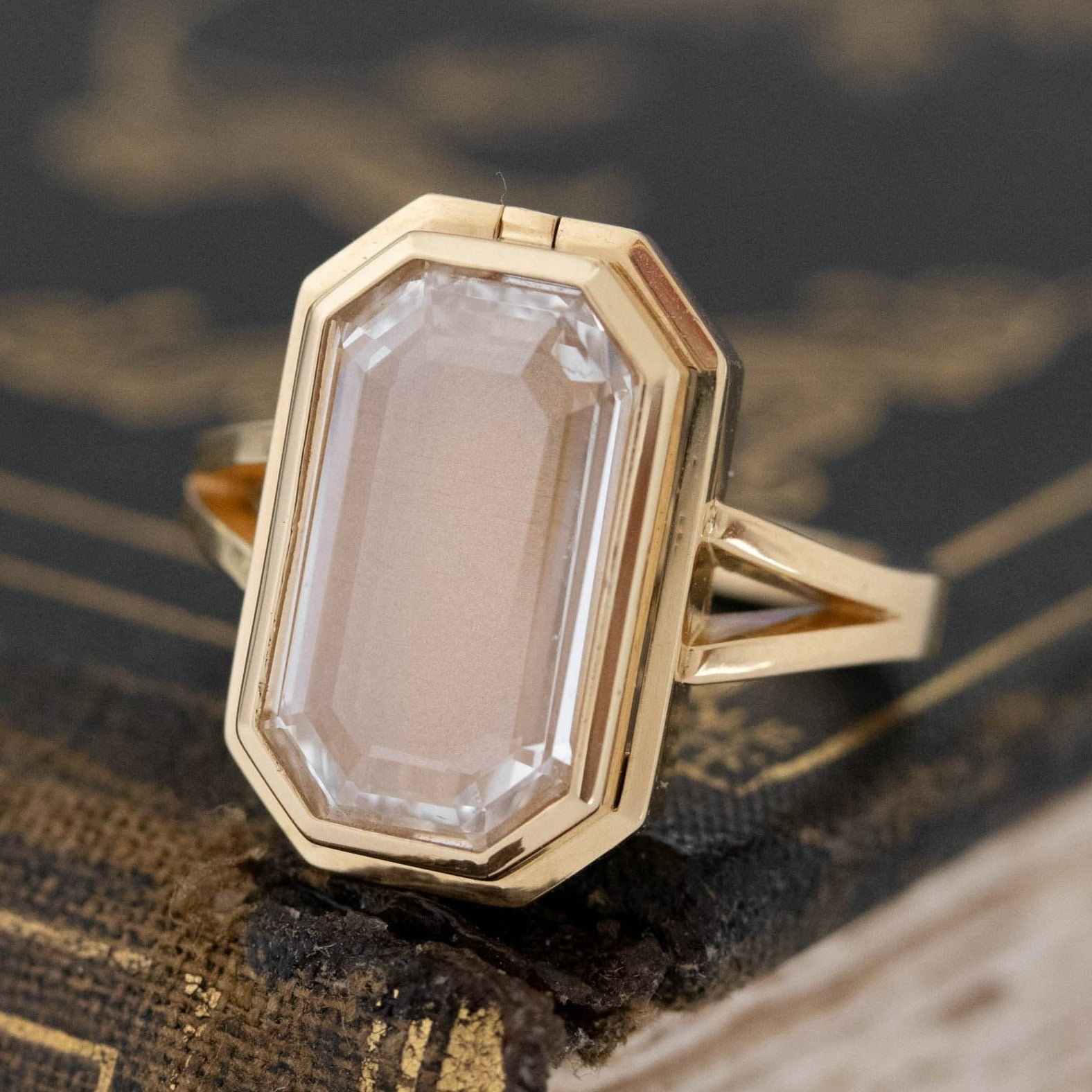 Antique locket rings come to us from the Georgian and Victorian eras. They were a popular style, most often with a metal top to enclose a photo or memento, with diamonds or enamel often taking center stage as far as what is visible to the wearer. Sometimes they were referred to as poison rings, so that one may put a pill or poisonous substance (yup, you heard right: poison!) and keep it on their ring to later inflict upon someone or themselves. Whether a small portrait was placed inside, or a flower, or a lock of hair, or even poison - it’s no surprise that these pieces became extremely sentimental, and we find that there are so few in the market today.