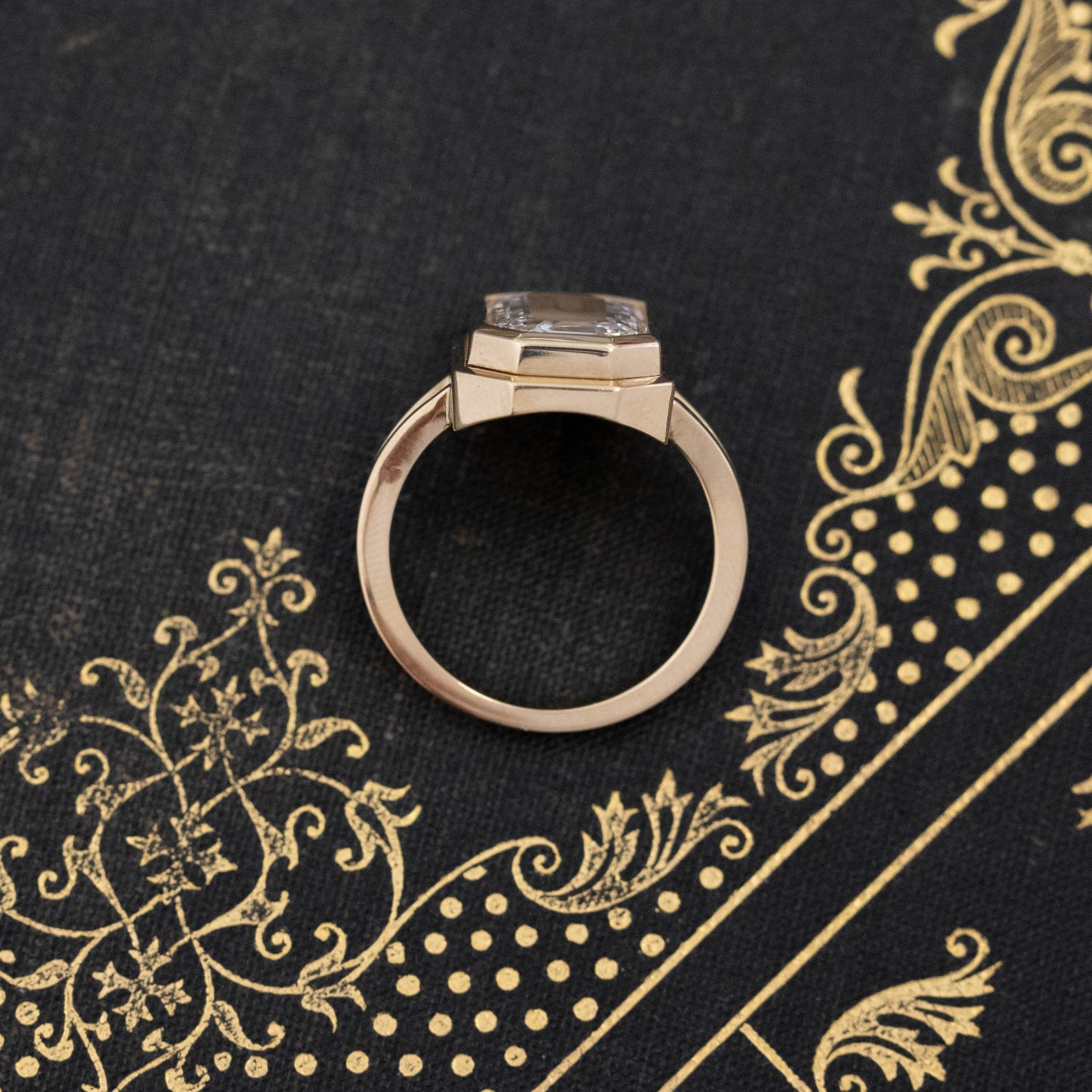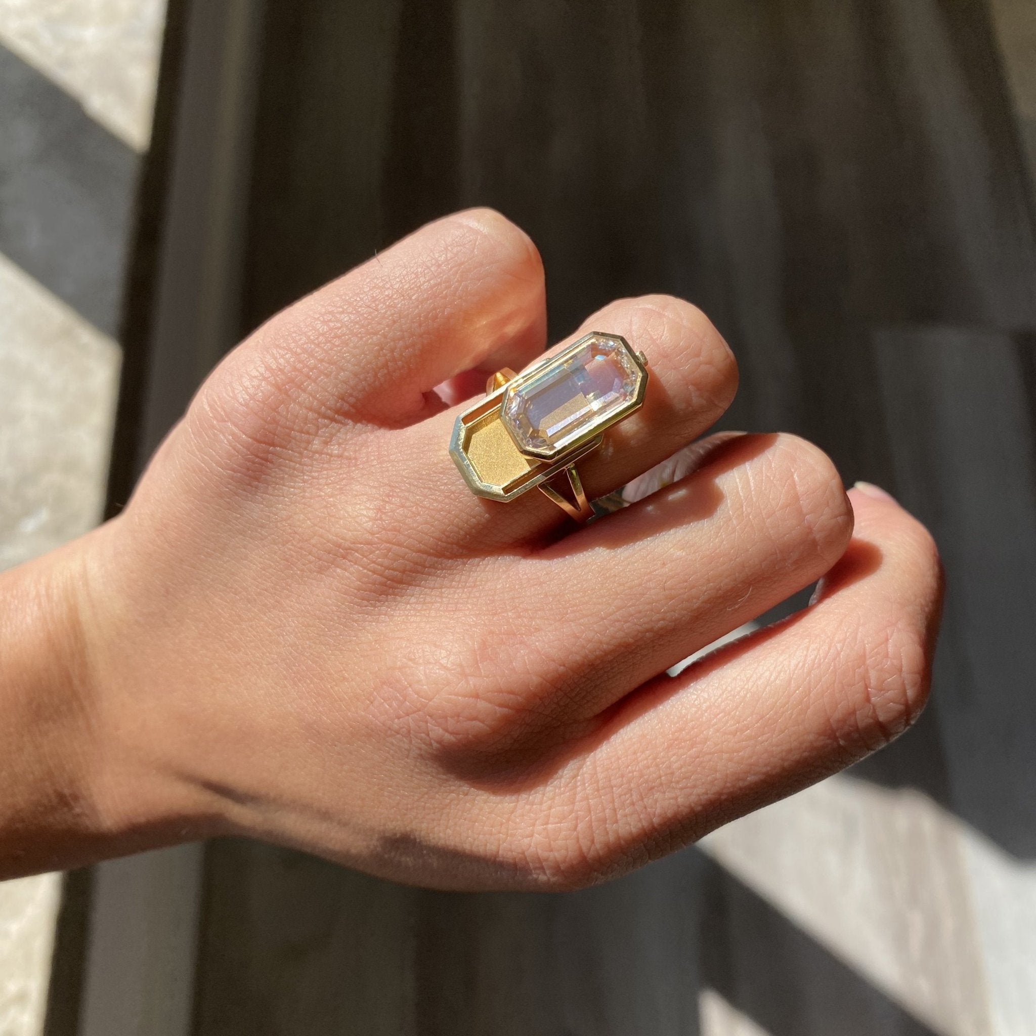 This unique ring is of our own design, and its quite the looker on the finger. The diamond is bezel set in a sliding mechanism that moves it up and down the ring - allowing for one to place their own personal memento in the locket component. The matte finished gold along the surface is prime for an engraving (if that’s your jam), but can also easily fit something like a small photo, a lock of hair, or perhaps a dried wedding flower. A diamond locket ring designed to be both functional and beautiful - we are absolutely in love.