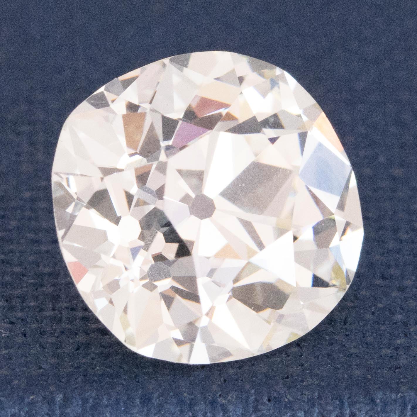 A chubby and fiery old mine cut diamond with delicious proportions and excellent spread! She's coming in hot at 3.11ct, and with a K color and VS1 clarity grading we find her to be an excellent candidate in your search for an antique diamond. The stone has a soft, pillowy shape and looks massive no matter the orientation you set her in. Plus a touch of kozibe effect which lends so much charm and old-cut goodness.