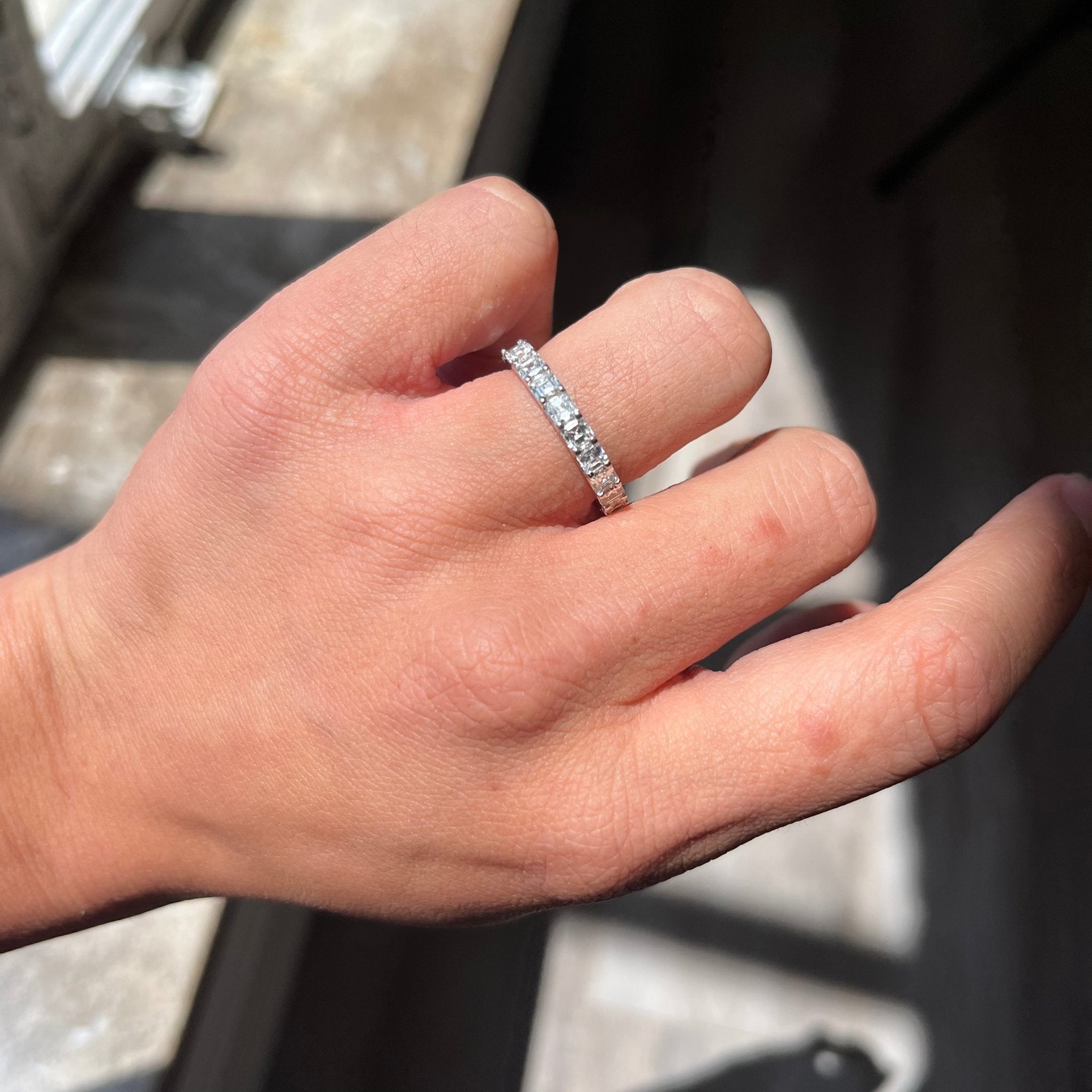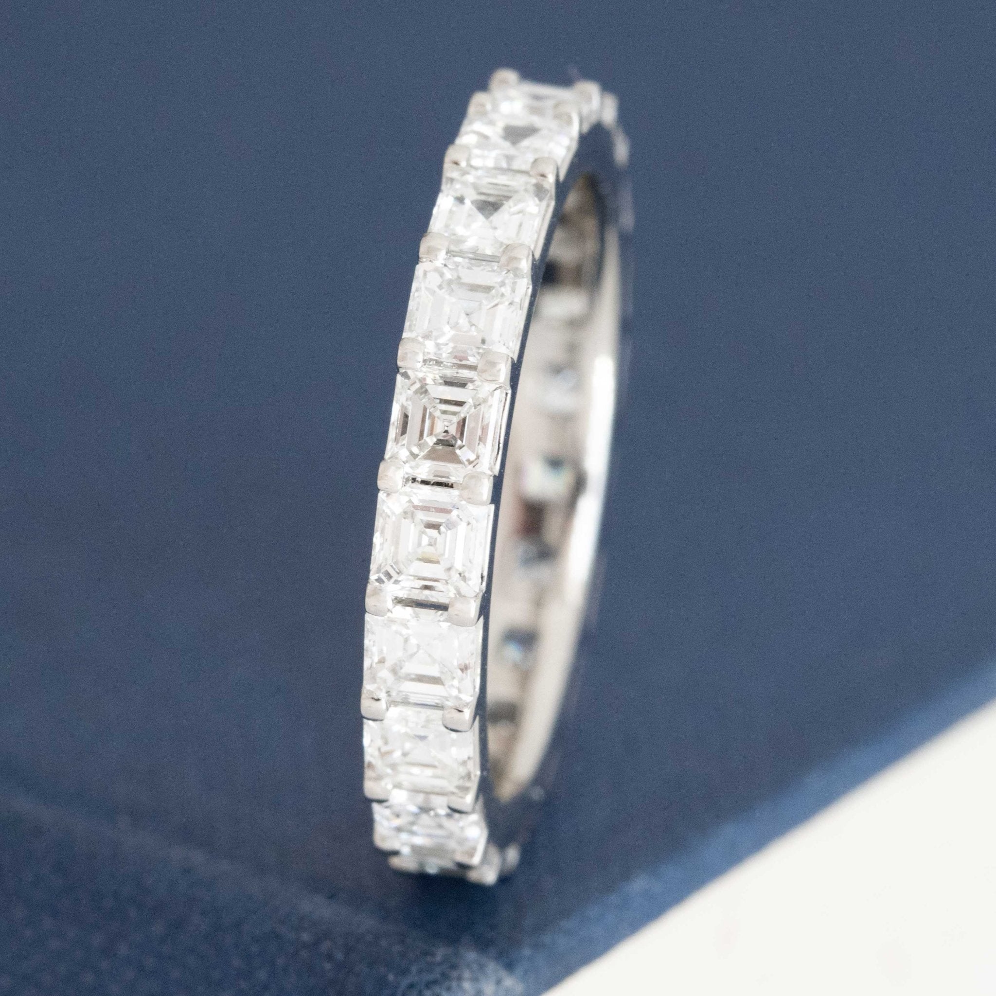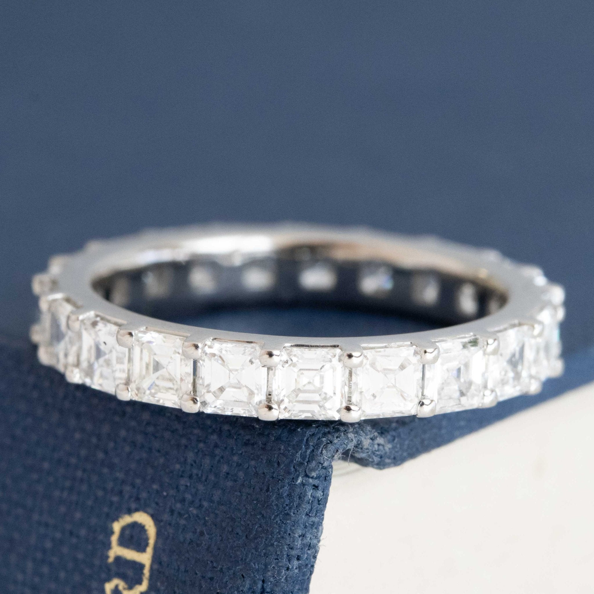 Exquisite band, set with beautiful and bright asscher cut diamonds. Crafted to be low profile so that it can stack nicely with another band or an engagement ring. The diamonds are beautifully cut with crisp facets - beyond elegant on the finger!