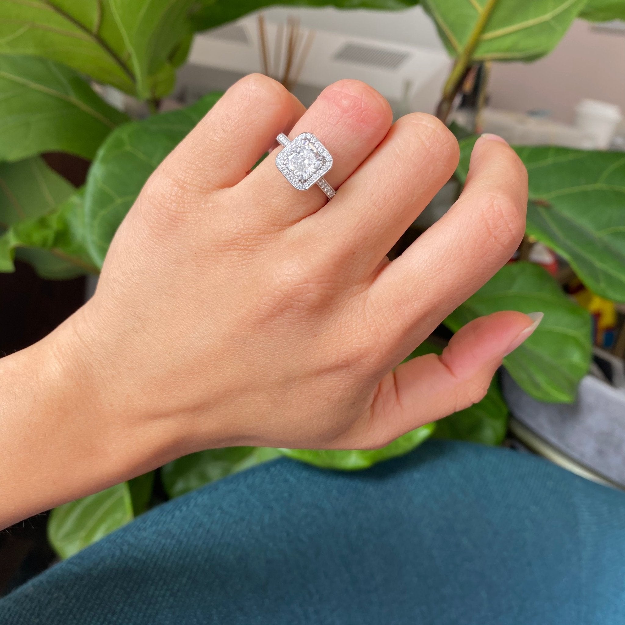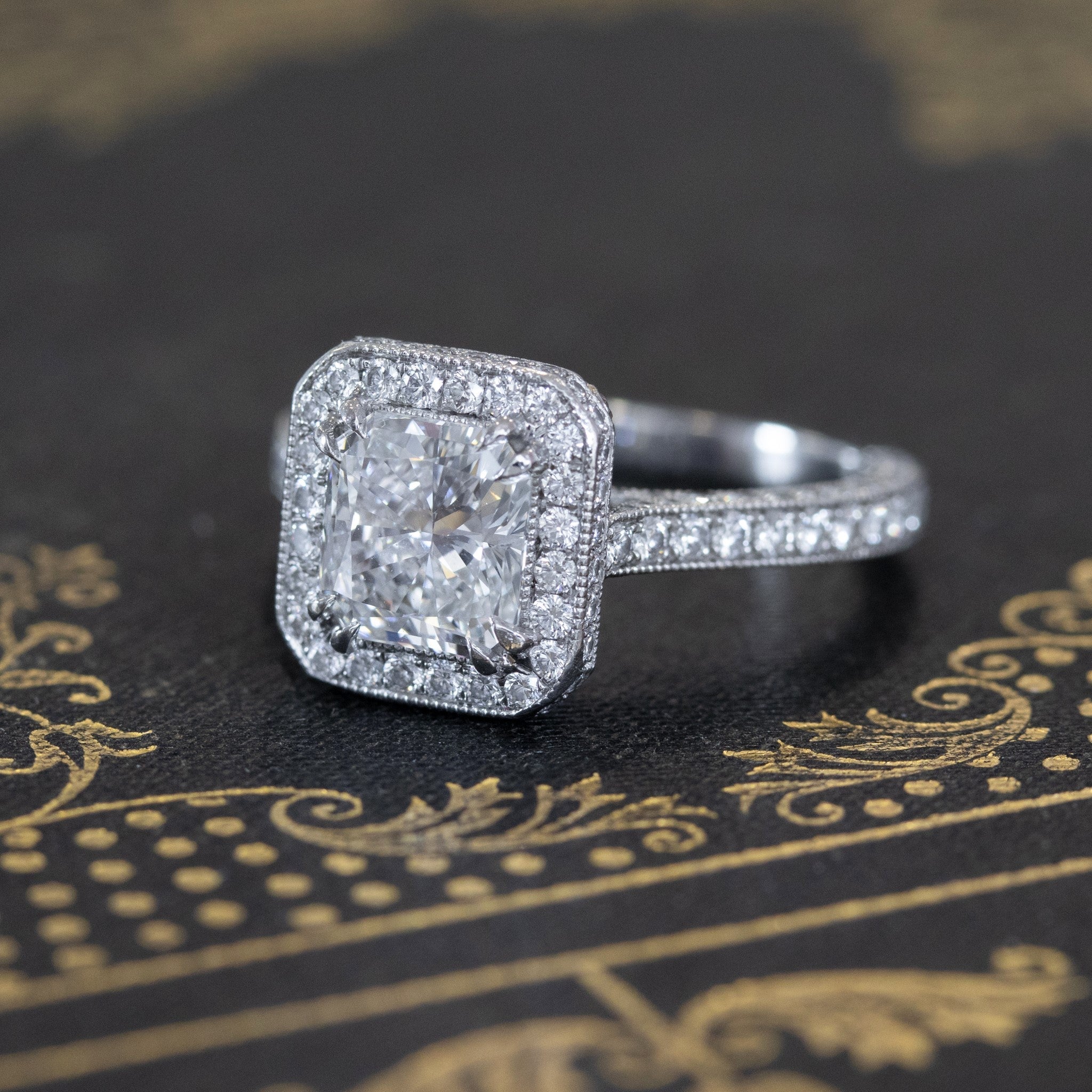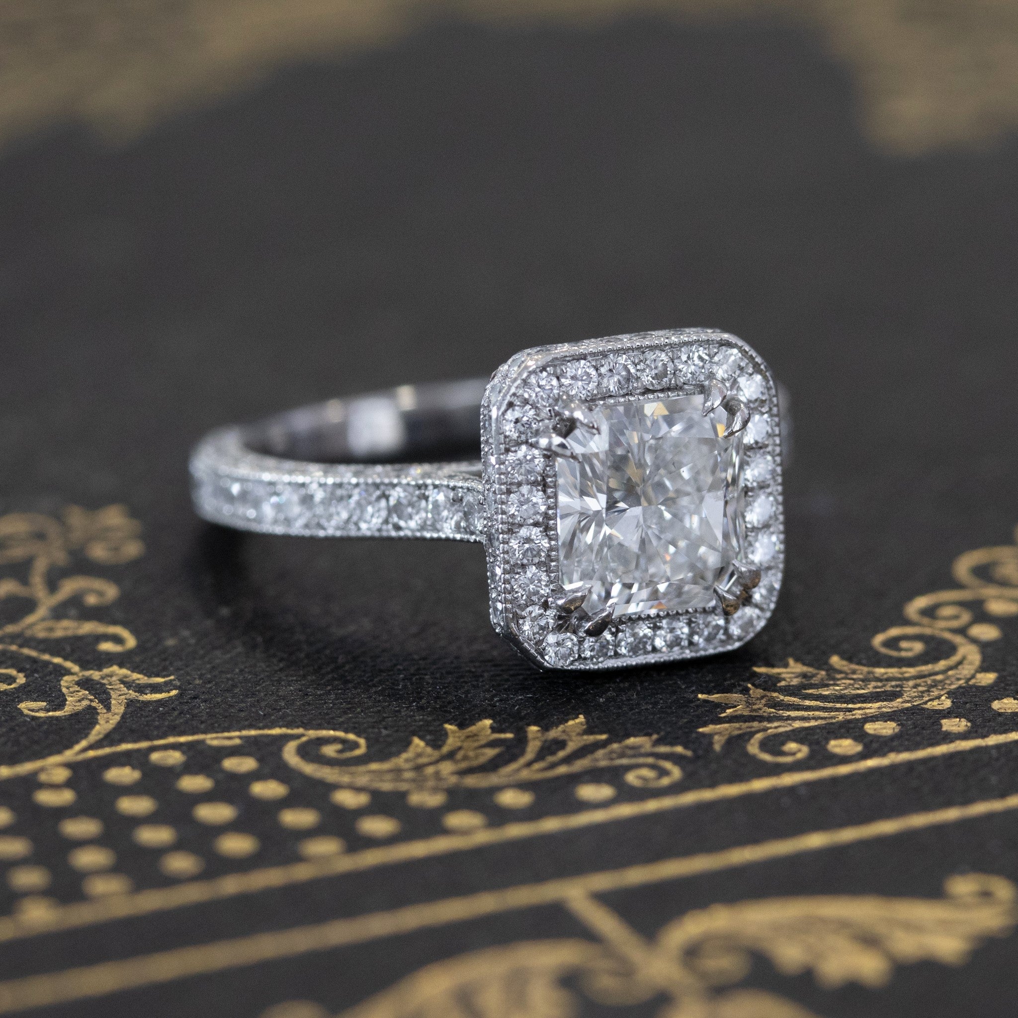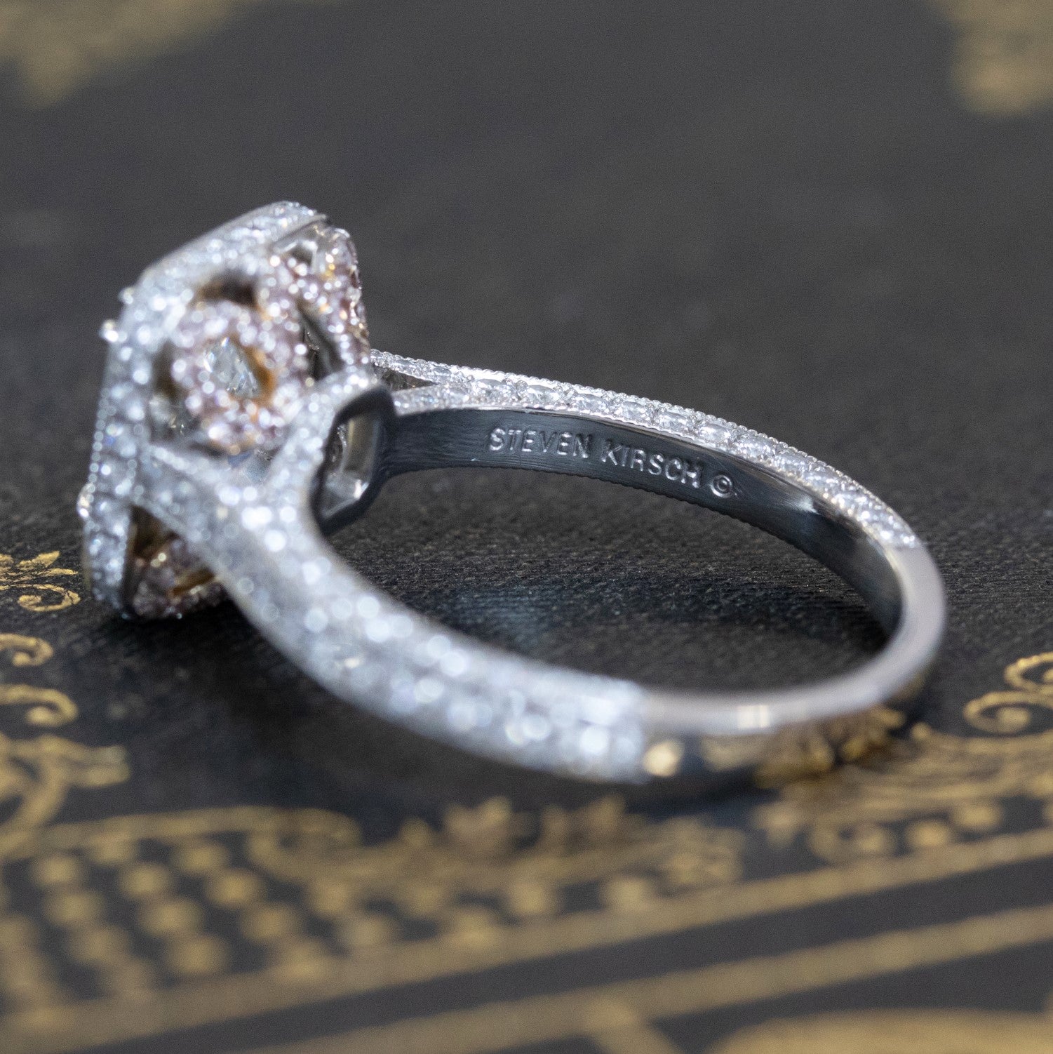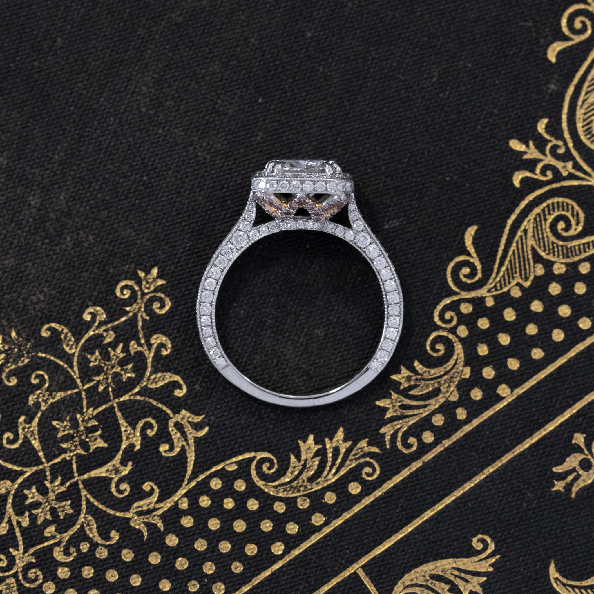 Still one of the most popular ring styles out there, this halo ring by jeweler Steven Kirsch went beyond by adding the most stunning gallery, studded with pink diamonds in a floral pattern. The central diamond, an icy 1.54ct radiant, throws off so much light and scintillation with every movement, truly dazzling! Stunning on the finger.