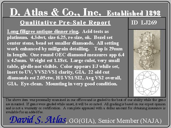 One of our favorite finds from our latest buying trip! A beautiful and uniquely-styled dinner ring with a very lively early old European cut diamond in the center. A truly fine example of the intricate and complex workmanship of the era. You will notice the diamond is almost always photographed with a kaleidoscope of colors all over it - it's hard to capture s single photo where it does not pick up color! The ring overall makes a bold statement on the finger, yet remains elegant and feminine. Be bold and different - wear her as an engagement!