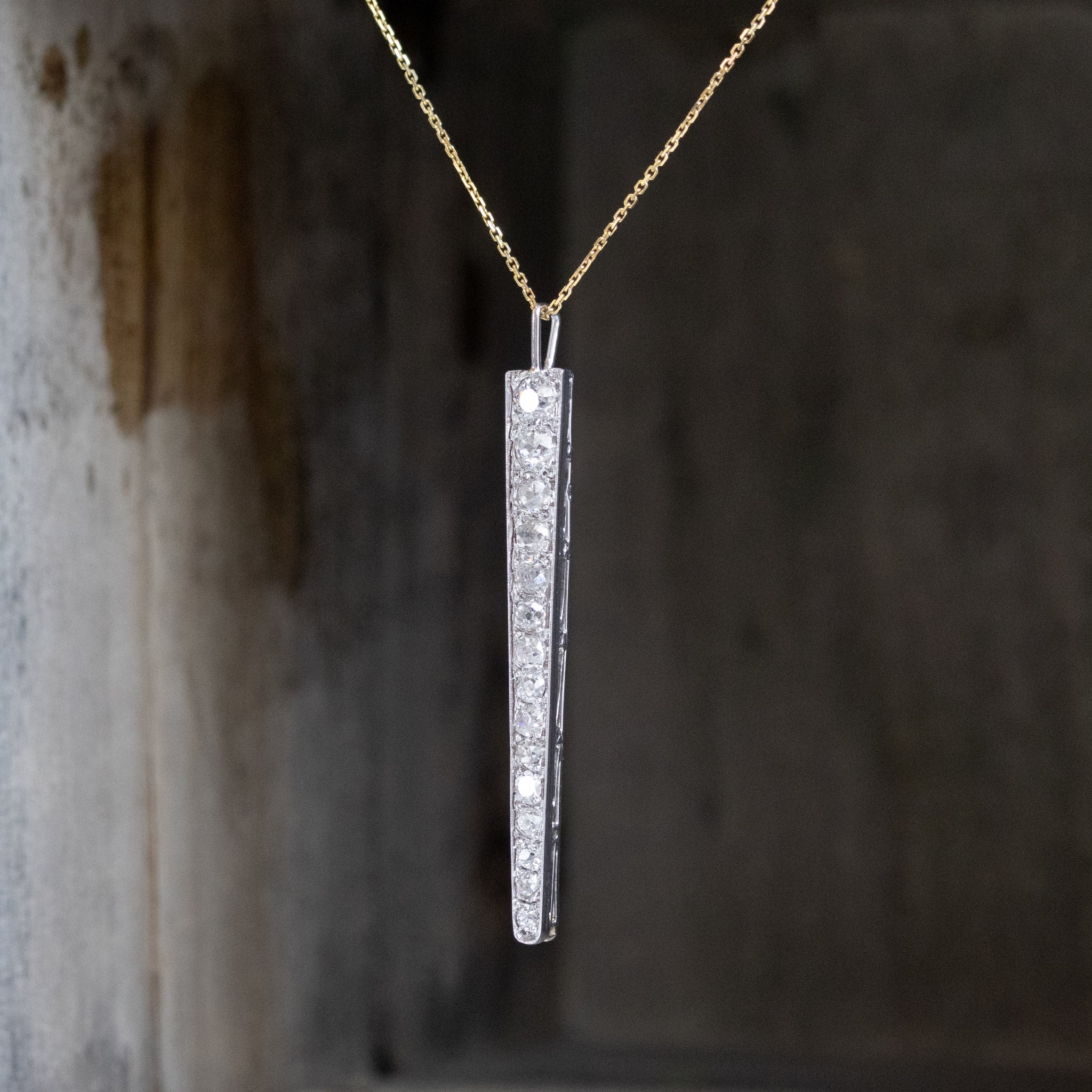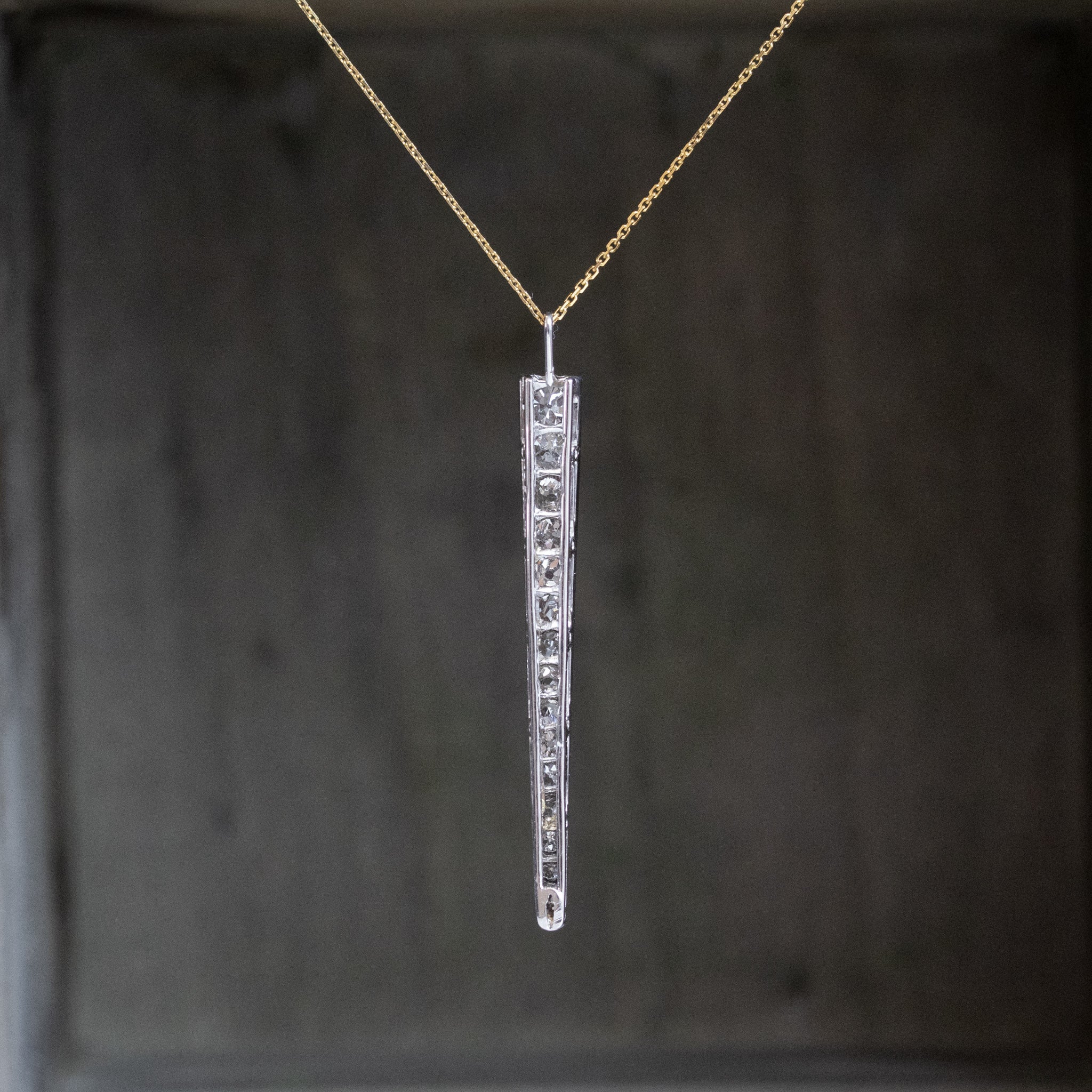 A recently rescued pair of diamond studded drops - perfect for a myriad of potential jewelry projects! These were rescued from a long bar pin with a missing central diamond. To breathe new life into this, we simply cut the pin in half and added rectangular bales on top. These are perfect as a long chain charm, or on a charm bracelet, or even earrings, with the addition of French wires or hooks.