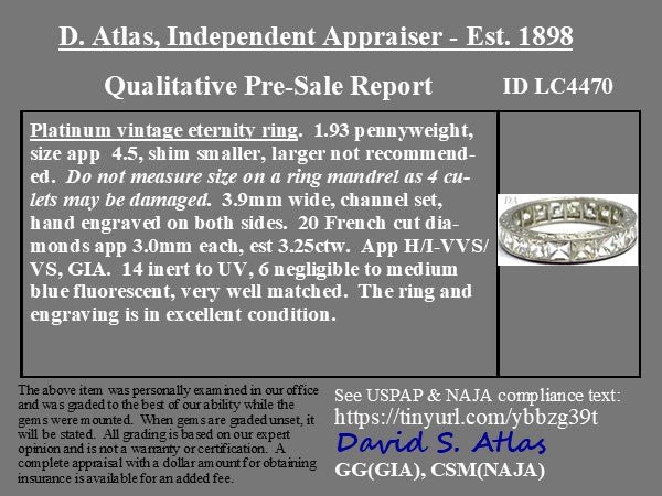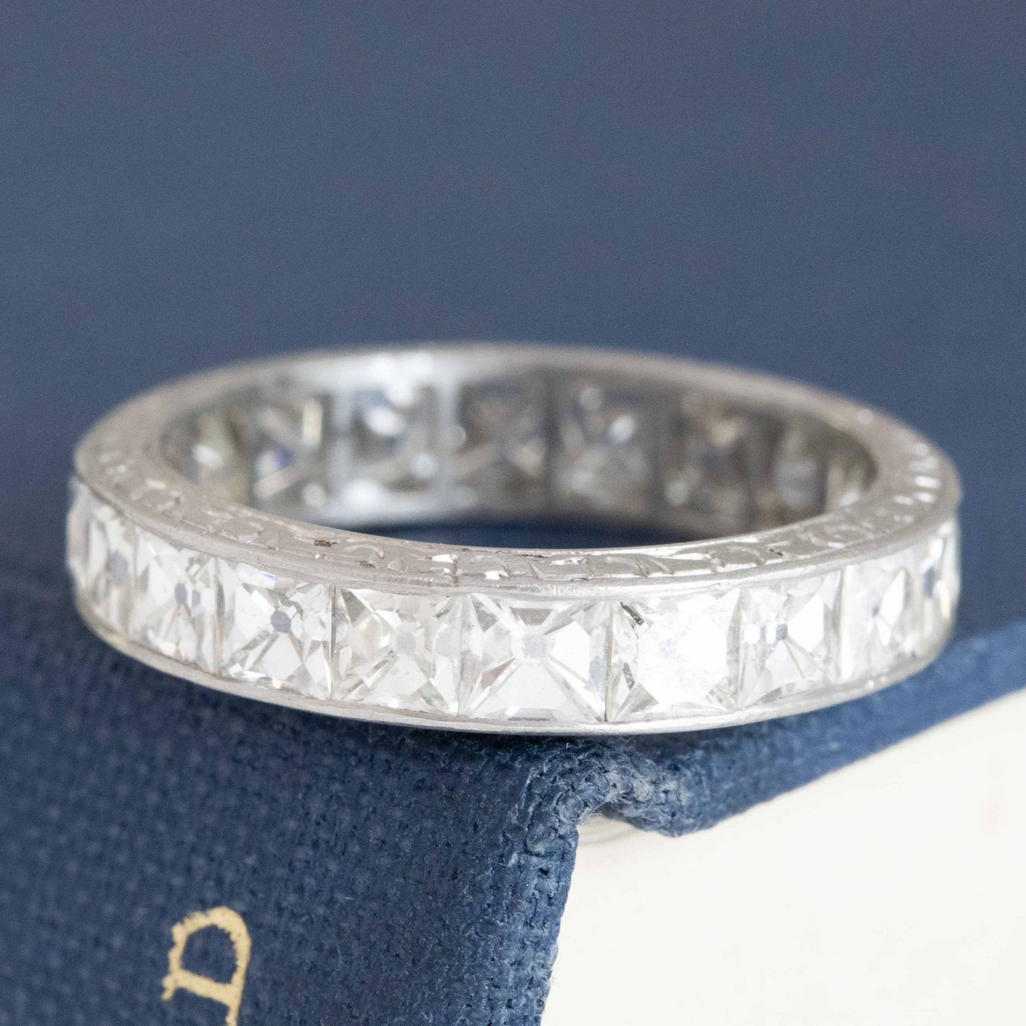 This Deco-era platinum band is the stuff antique jewel dreams are made of. 20 bright and chunky French cut diamonds with delicious faceting and wide open culets sit in a perfect platinum channel setting with engraved walls along the side. Not only are these pieces becoming increasingly difficult to find in this condition, but to find these original Deco French cut diamonds is quite the feat. She's a Cinderella size 4.75, beautiful when worn solo or stacked with your vintage ring collection.