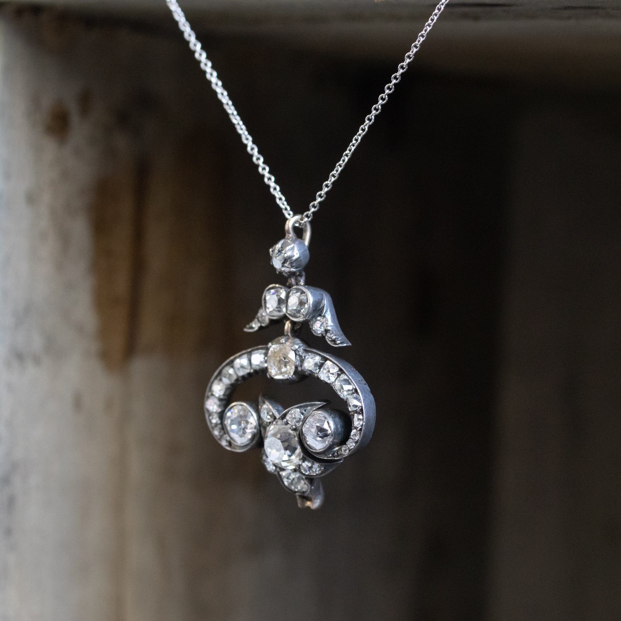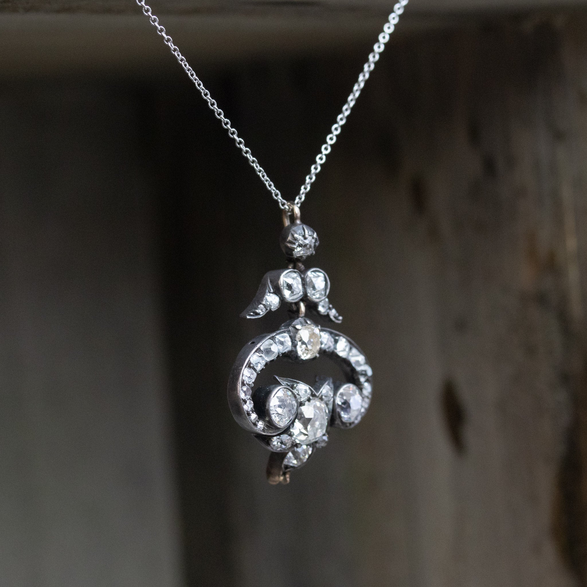 A charming and unique Victorian pendant highlights some major sparkle with old mine cut diamonds! The swirl motif draws your eyes to the three large, gorgeous old mine cut diamonds. This pendant lays elegantly on the décolletage, with an additional link at the bottom if you wanted to add more bling!