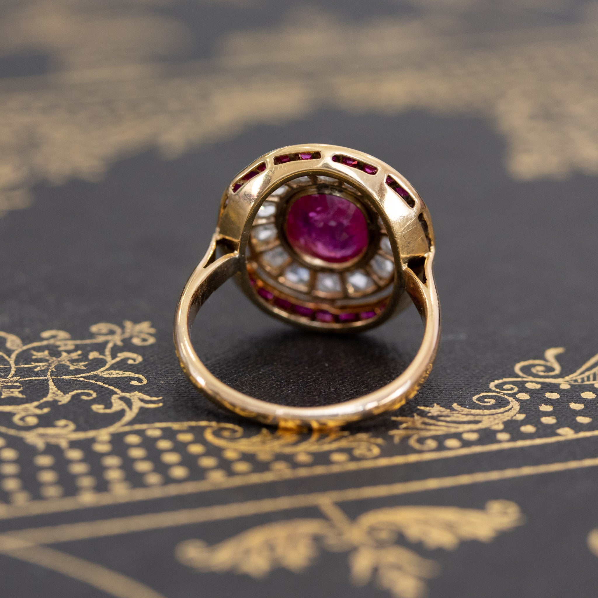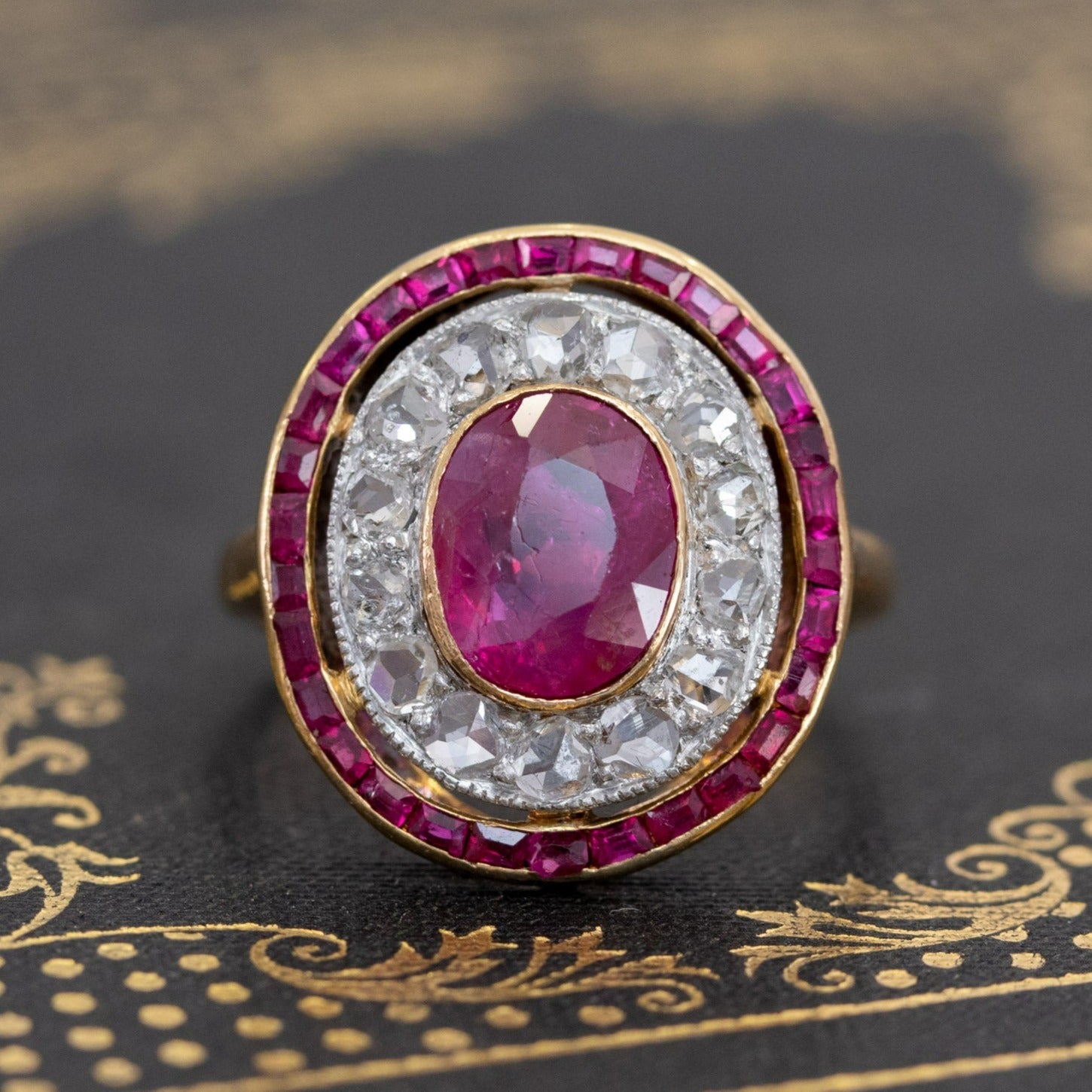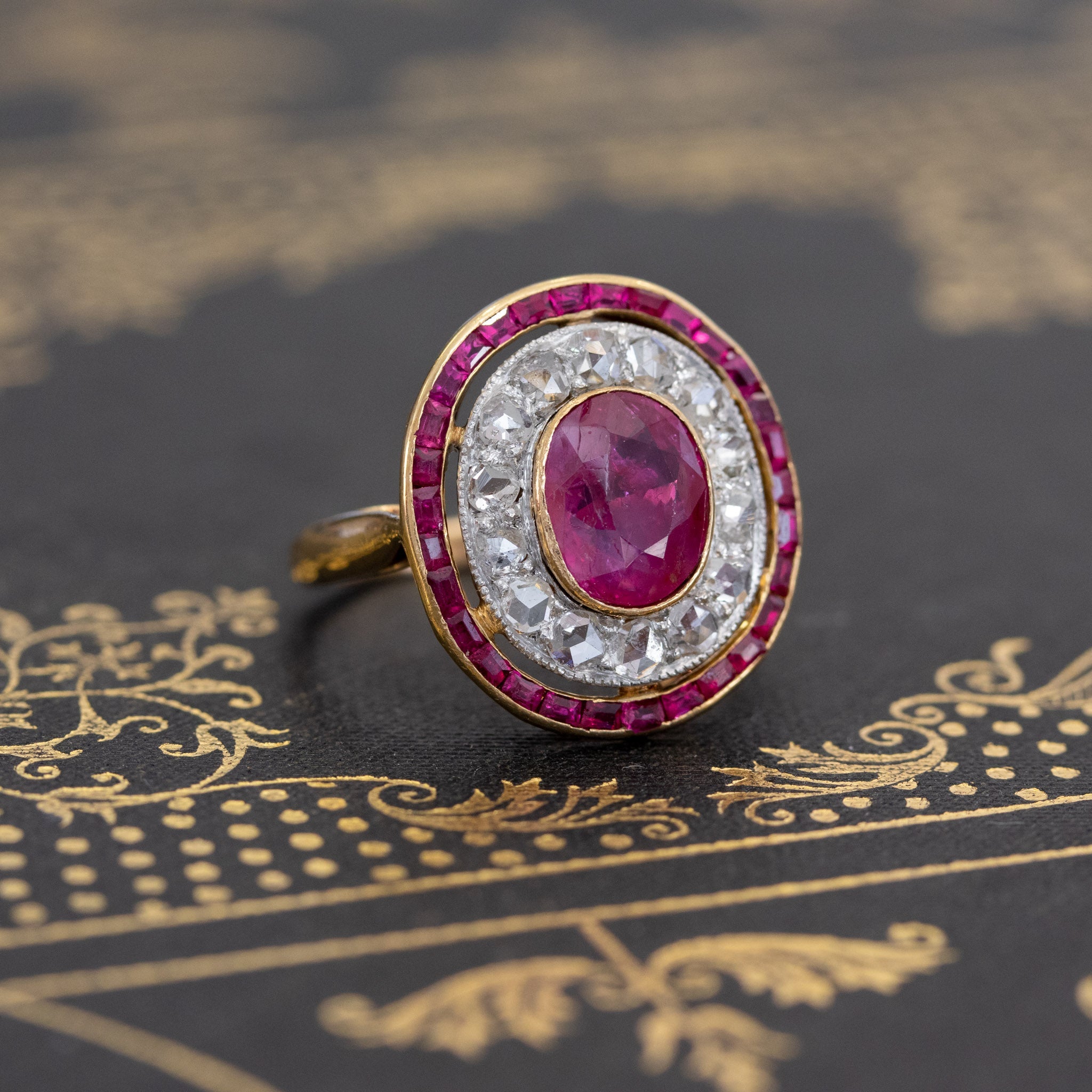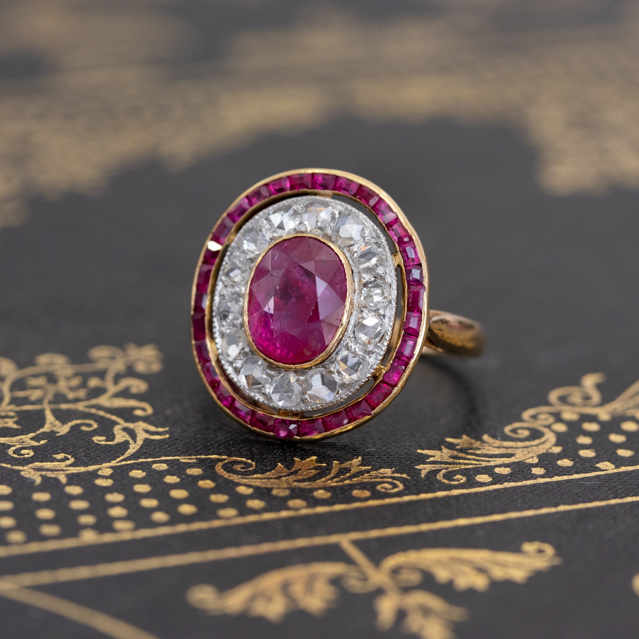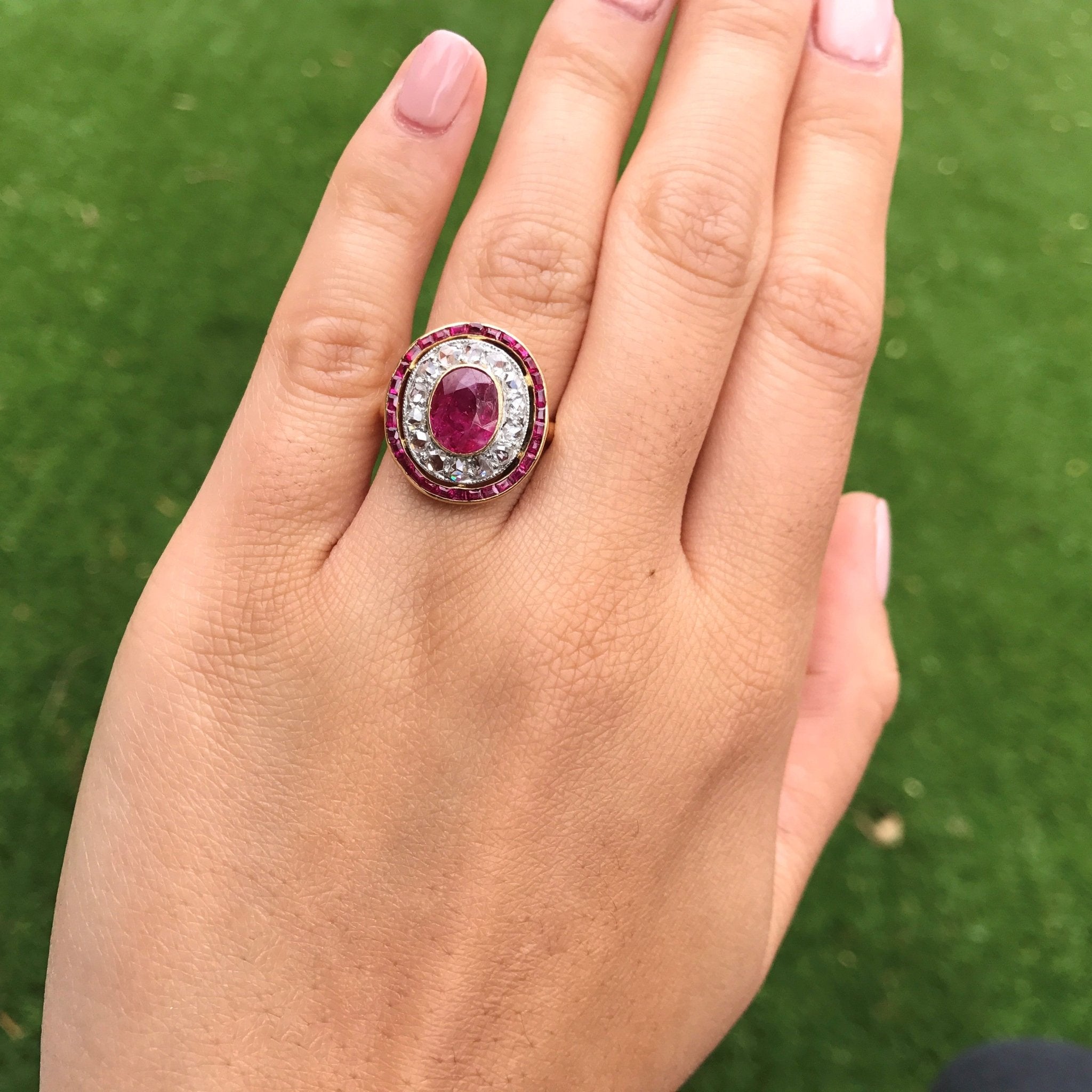 Talk about a target ring! I am loving everything about this ring - the vibrant reddish-pink ruby, the halo of rose cut diamonds, and the outer halo of calibre-cut rubies, perfectly matched to the center stone. Such a beautiful and unique ring! Of course, the fact that the center gem is of Burmese origin without the common heat treatment makes it even more special (and valuable) in our eyes. The ring is very regal and sits so elegantly low on the finger.