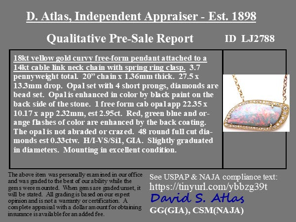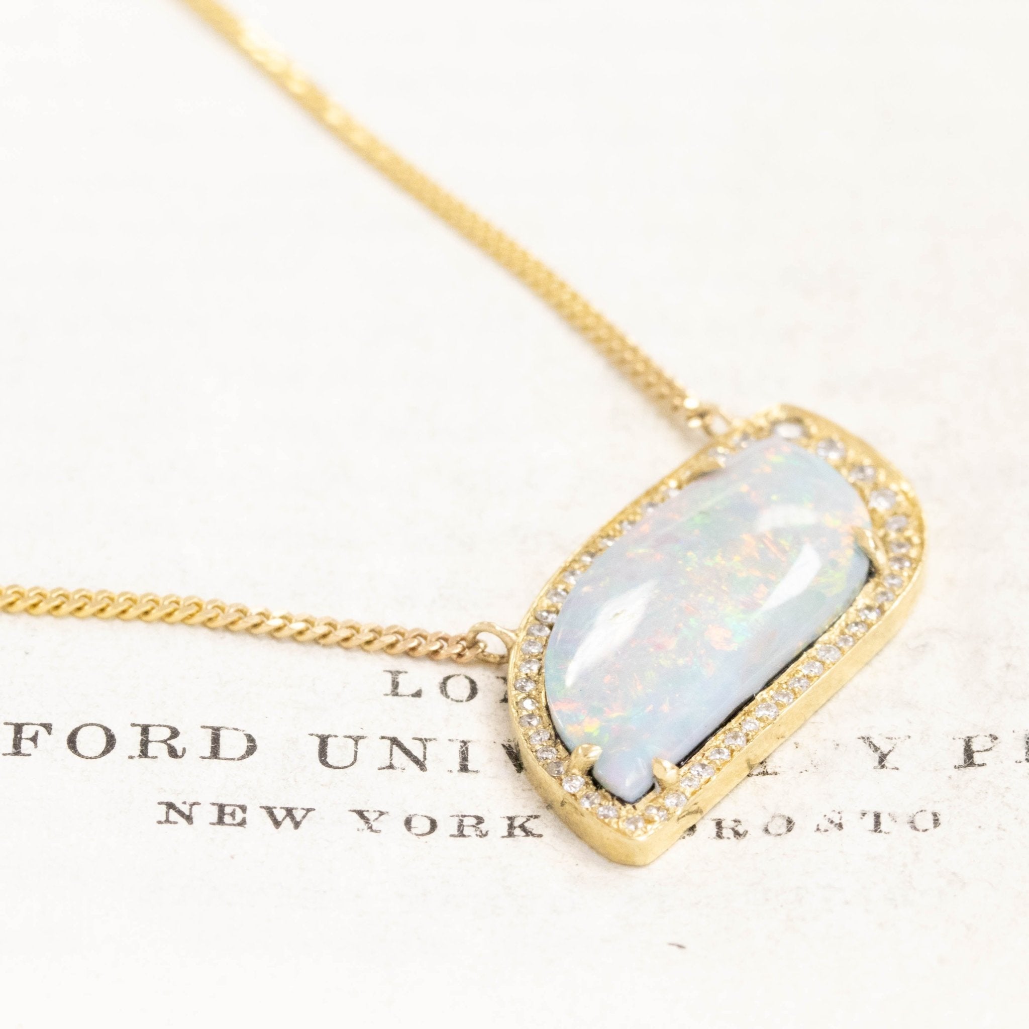 This freeform opal pendant is the perfect piece of jewelry for those looking for something that is anything but traditional! A sweet and colorful opal sits in a diamond halo set in 18kt yellow gold. We love the length on the chain, 18” to be exact, that makes it perfect for layering and stacking! The perfect bold pendant, if you ask us.