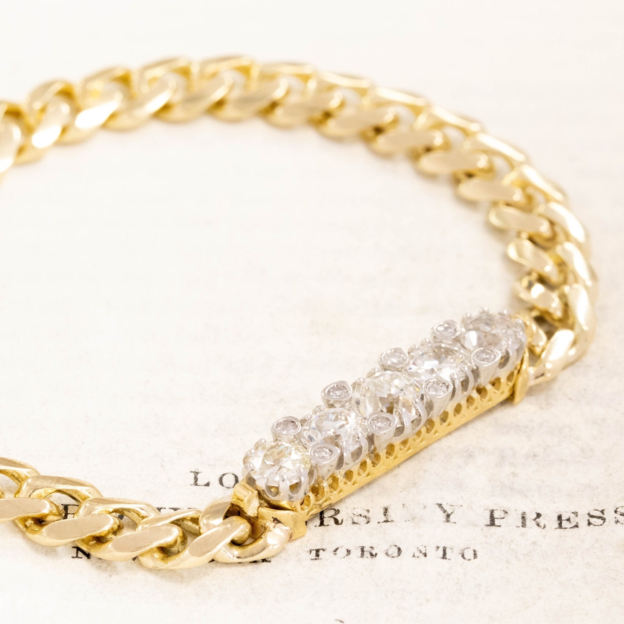 Grace has a personal piece she'd worn for over a decade now - a Victorian gold curb link with a diamond-studded clasp that is more ornamental than it is functional, which folks frequently offer to buy off her wrists. So, using a vintage curb link and recycled antique diamonds, we decided to make one of our own! However, we also upped the ante and made it a convertible bracelet/necklace duo.