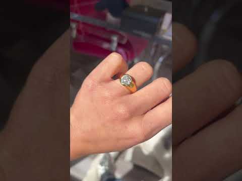 A chunky monkey of an old mine cut diamond sitting in an equally chunky, high karat half bezel setting! Combining our favorite aspects of both bezel and flush-set gold and diamond rings, we know this 3.39ct deserved something as sumptuous and perfect as 22kt. She wears beautifully buttery, and will certainly age and patina in the best way as time passes. The center stone has rustic facets with big rainbow flashes and delicious kozibe effect.