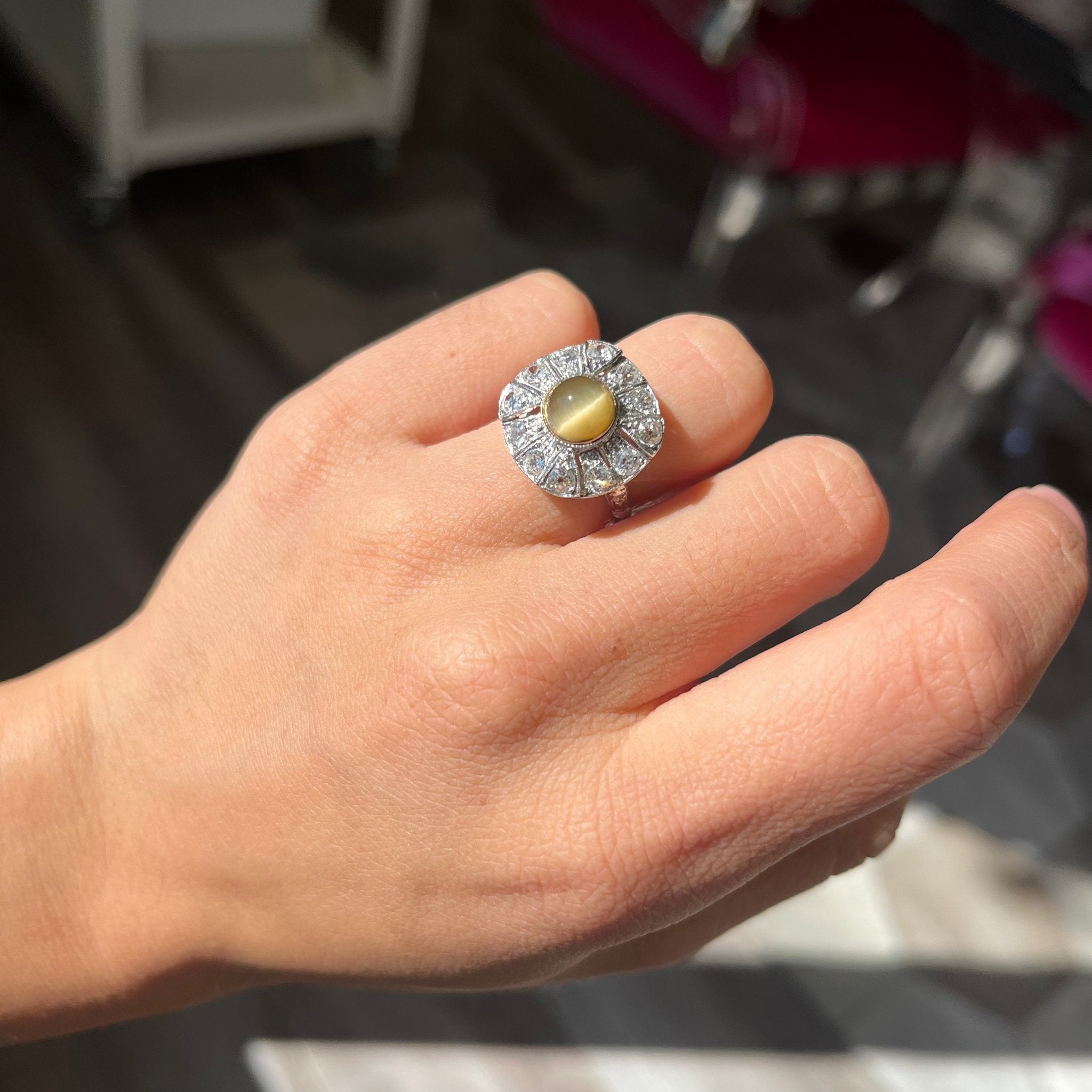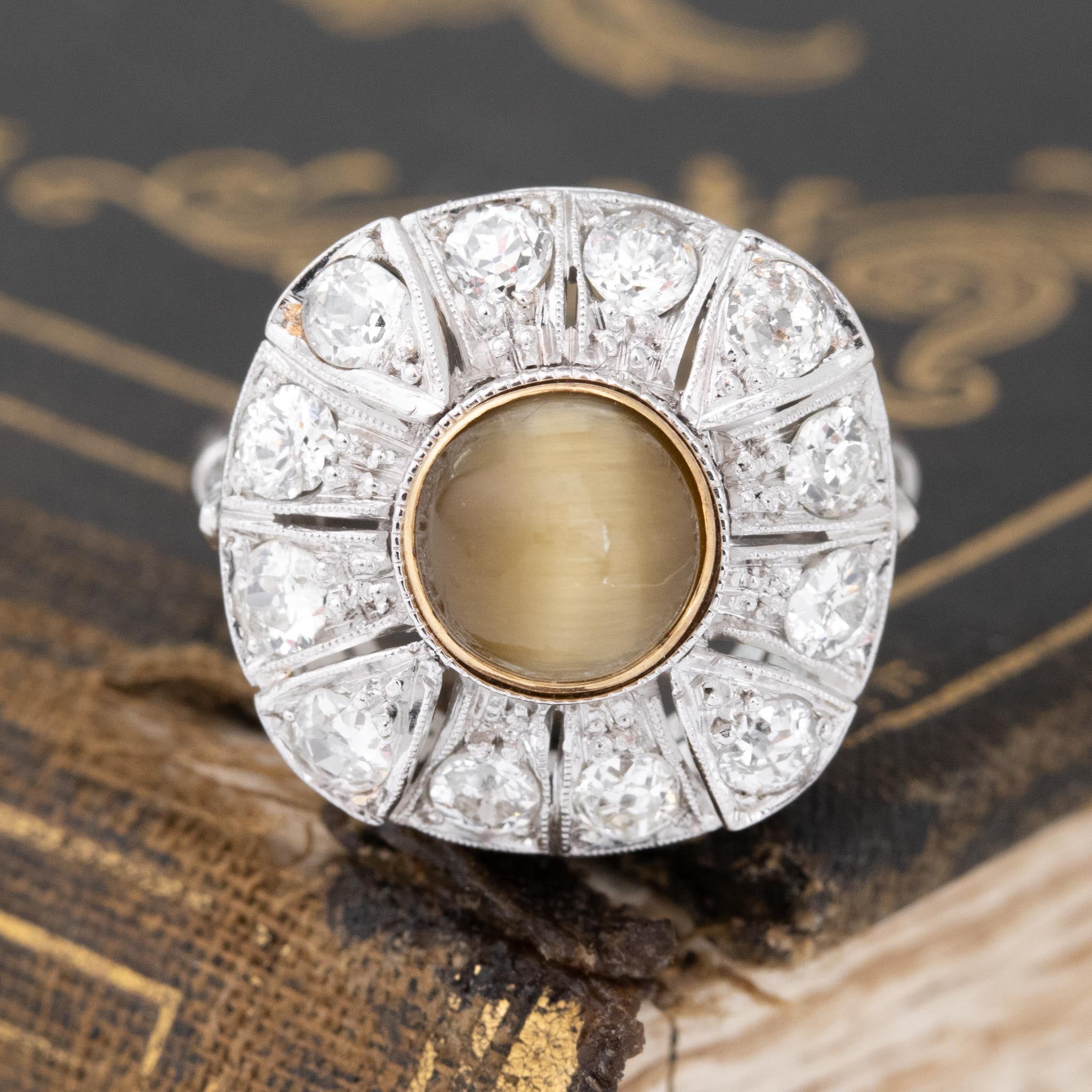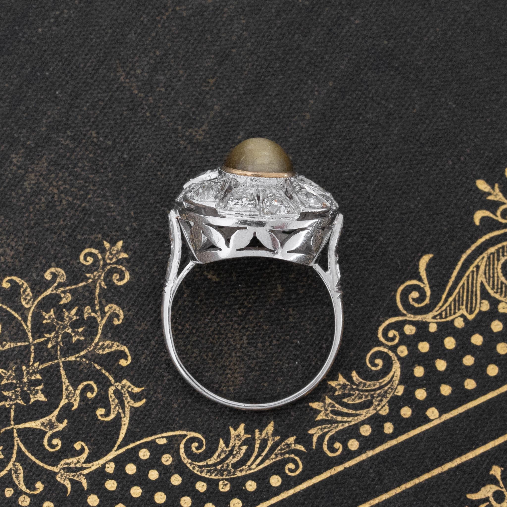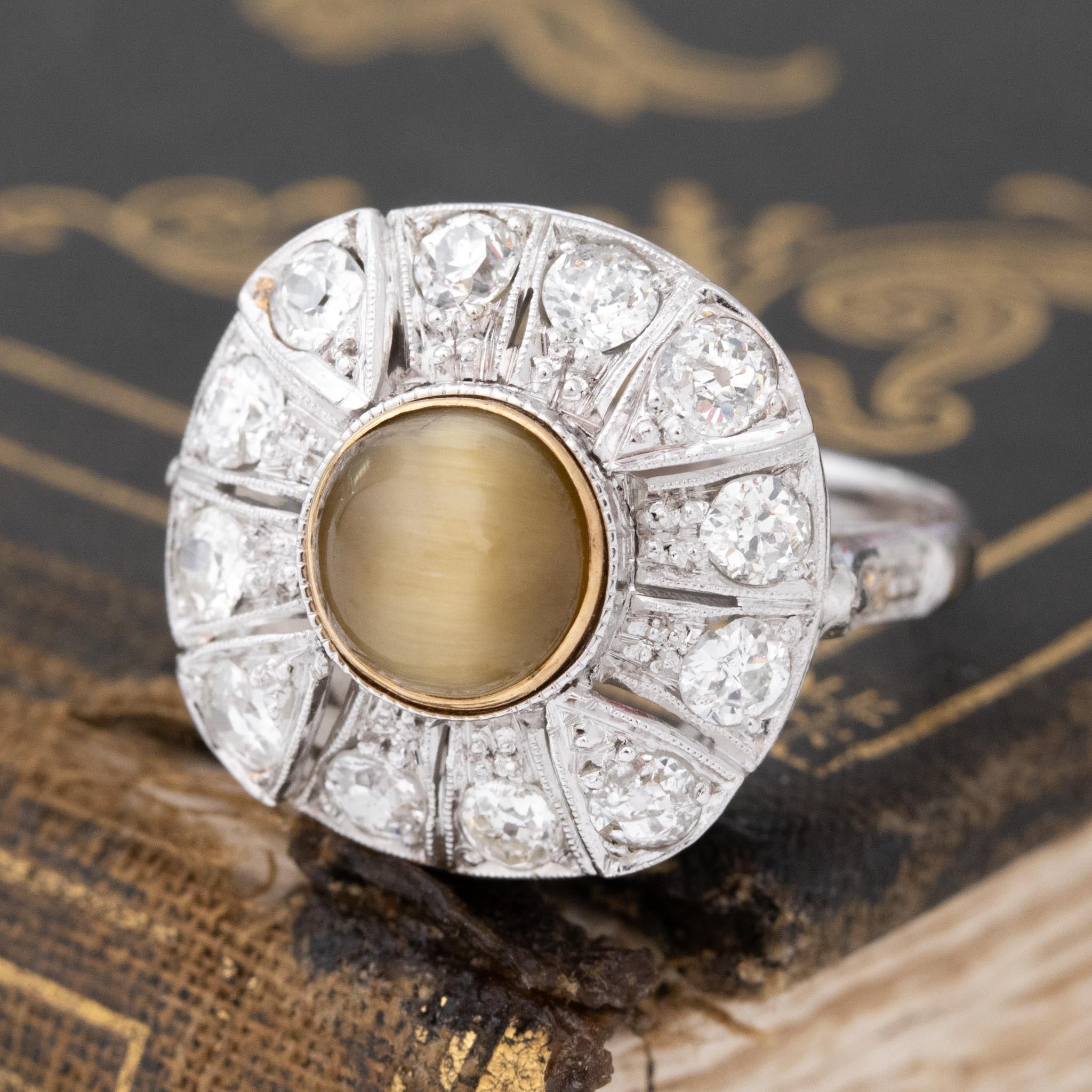 Great art deco revival ring, set with a cat's eye chrysoberyl amid a surround of chunk old cut diamonds. We think she makes for the perfect right hand ring!