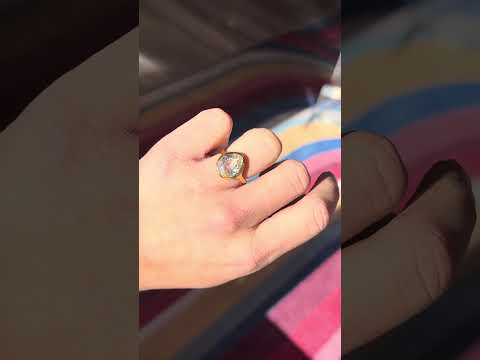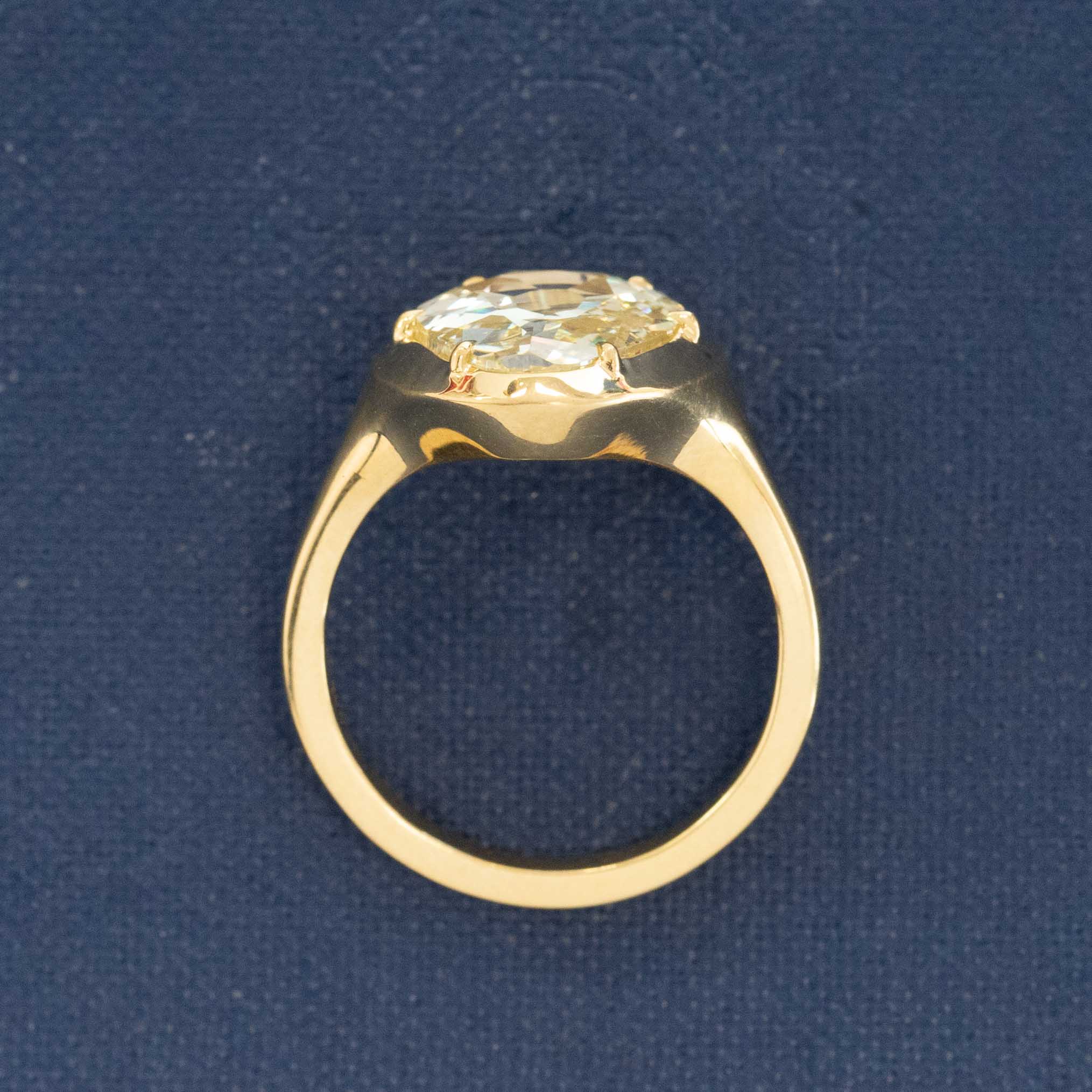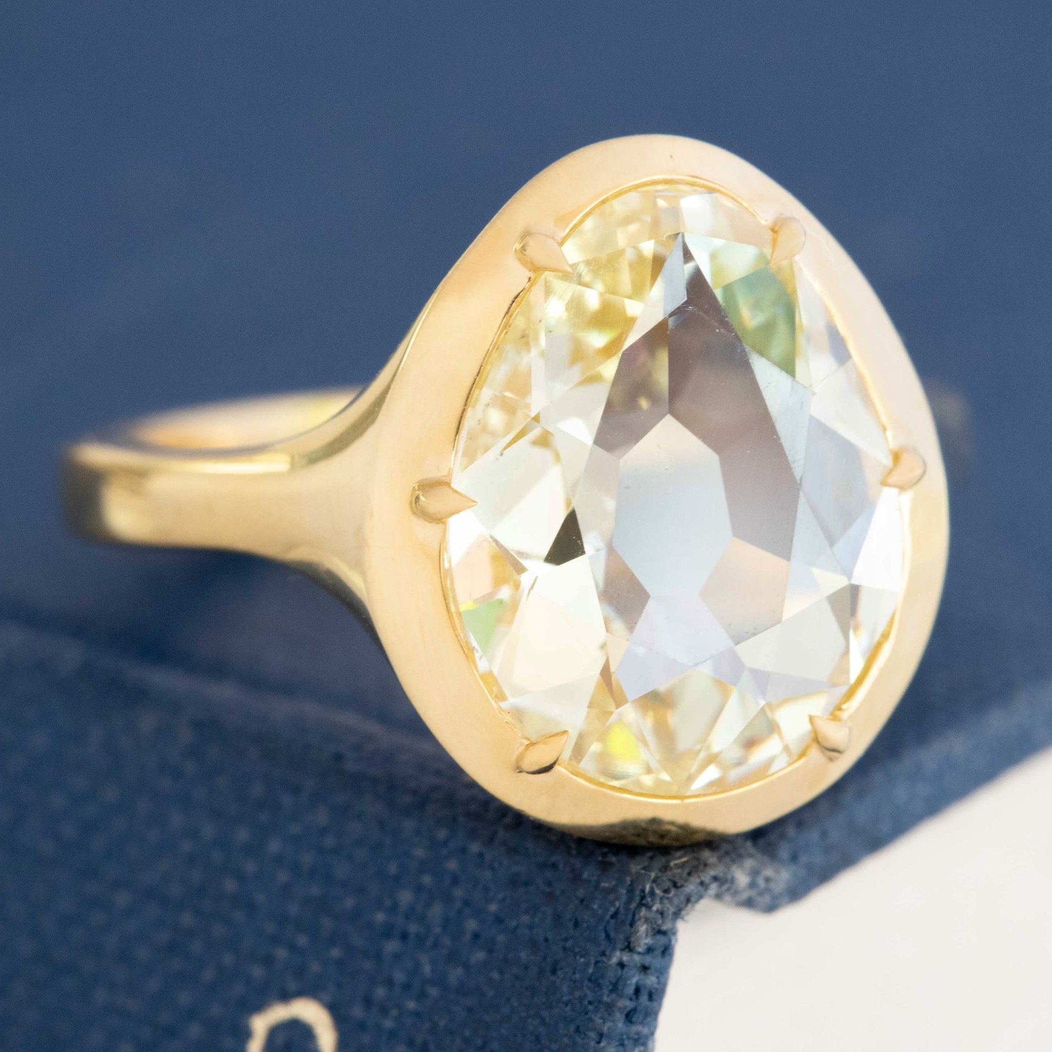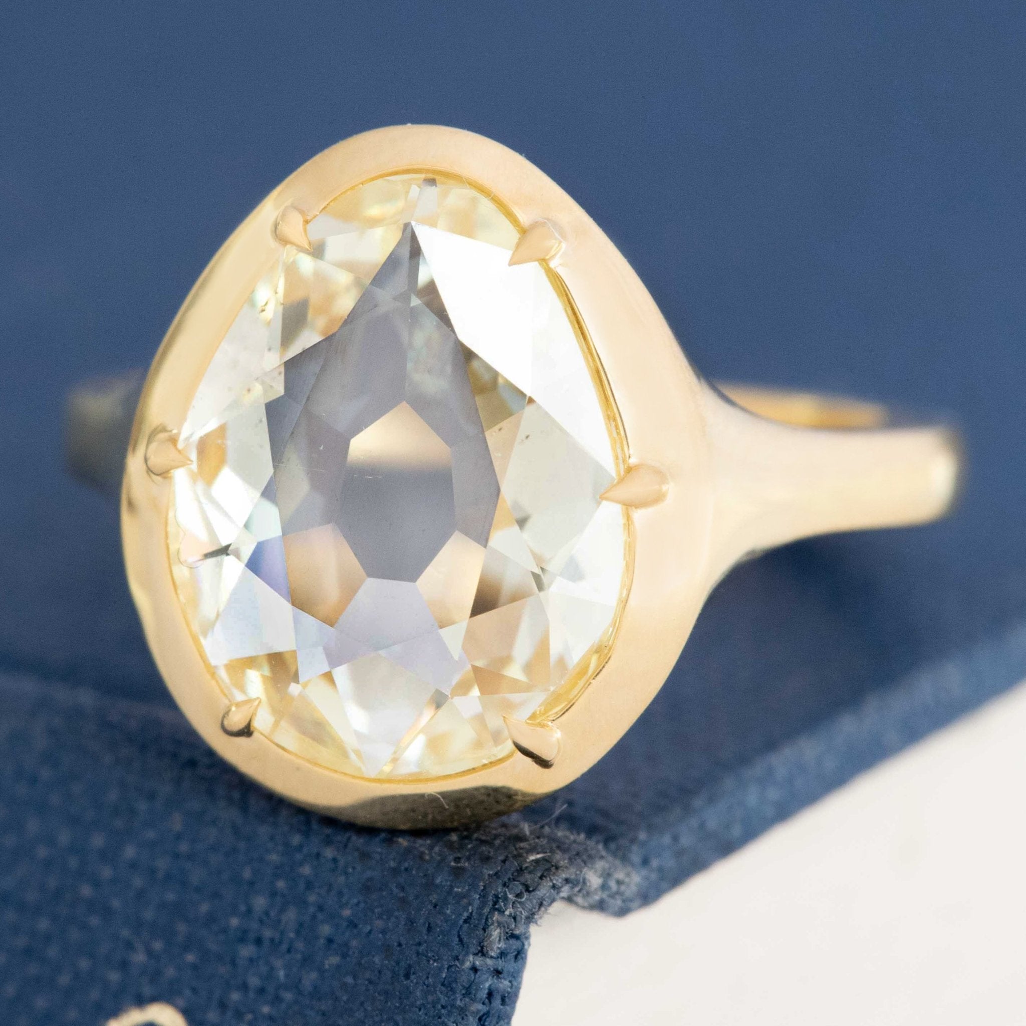 This beautiful pear-shaped rose-cut diamond has an incredibly beautiful shape - a rounded tip and a chubby tummy, plus she looks like a full 5cts! We set her in this rich 20kt yellow gold mounting to help showcase her pretty light yellow color, too. Low set on the finger - she is unique and truly one of a kind.