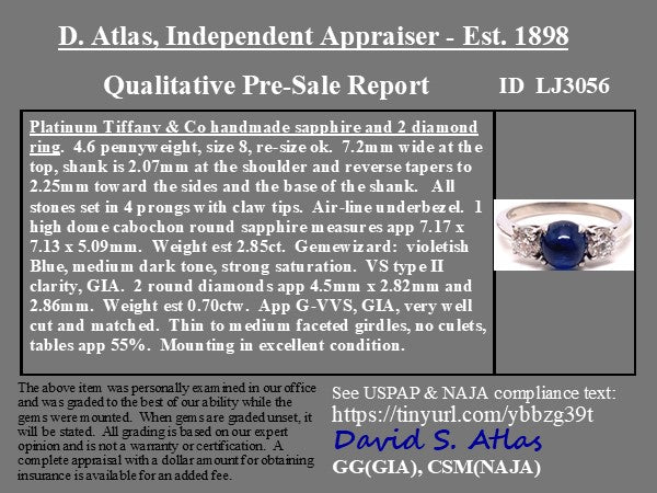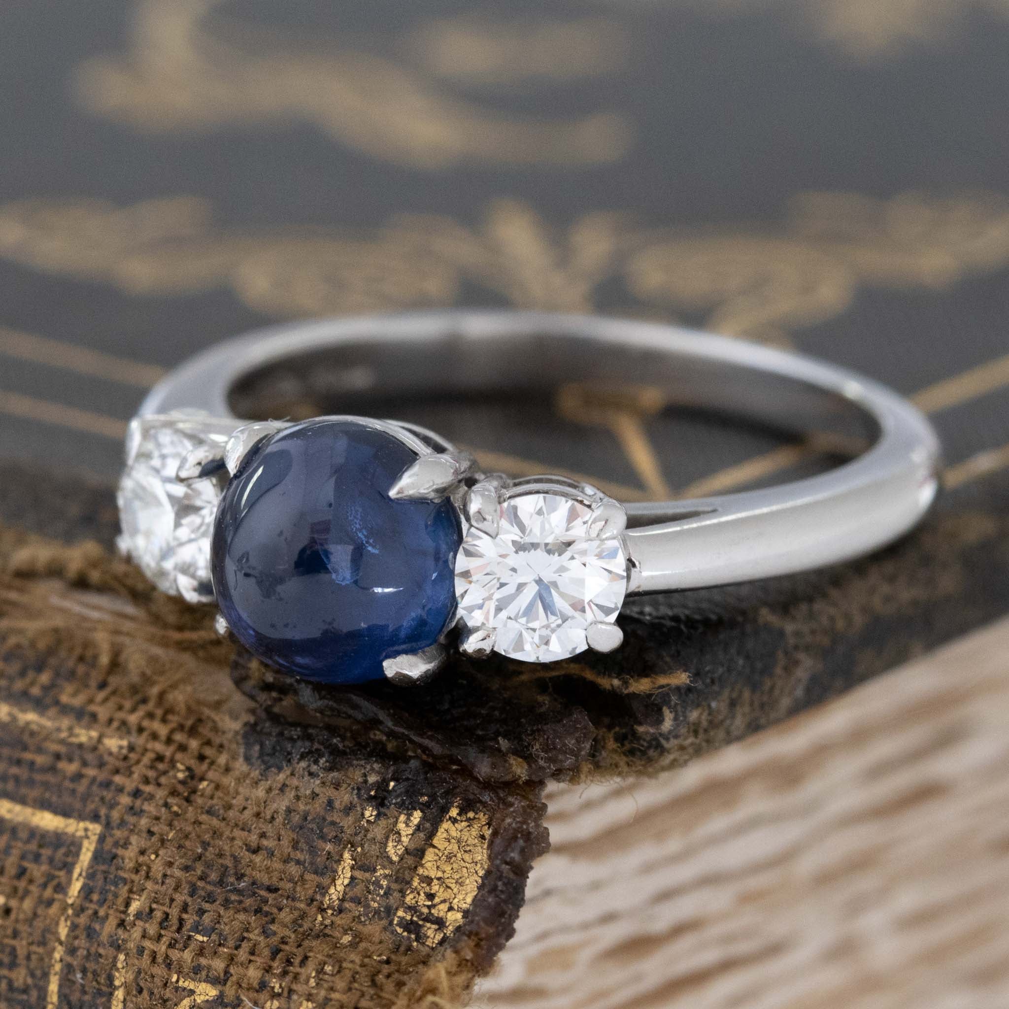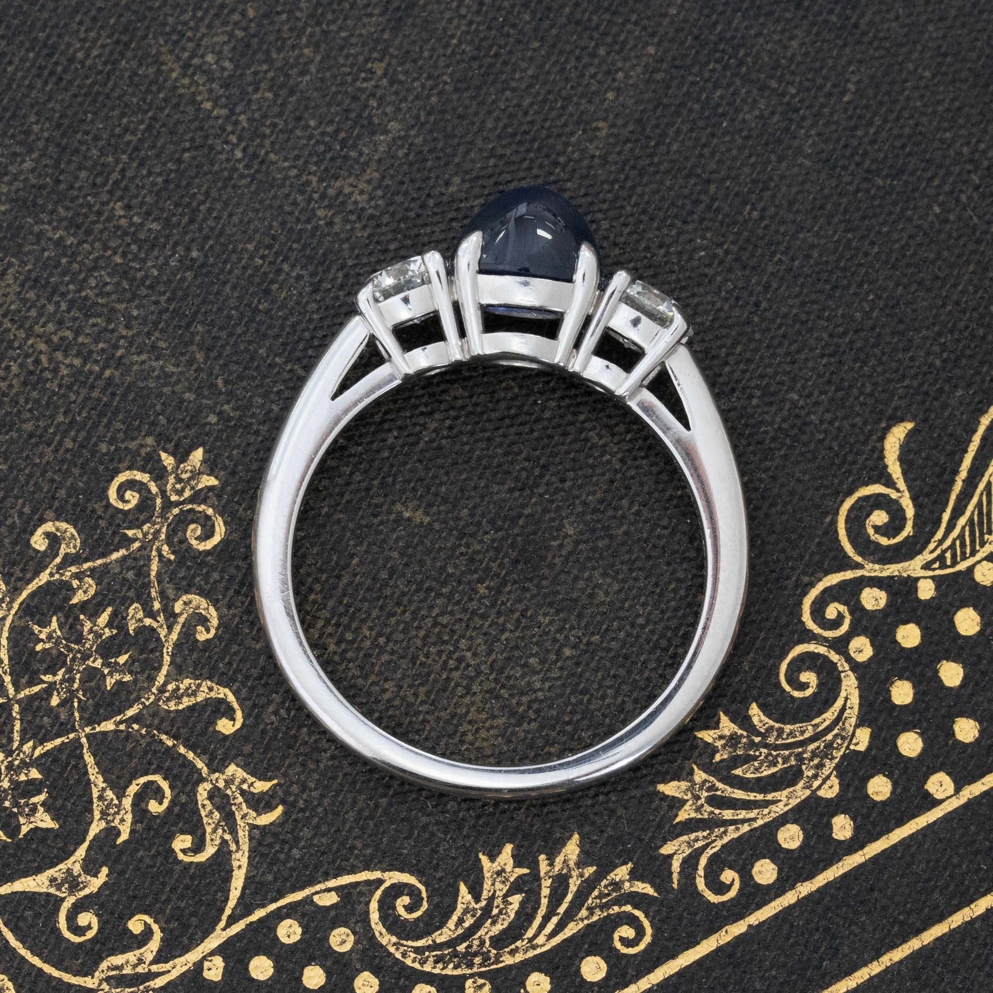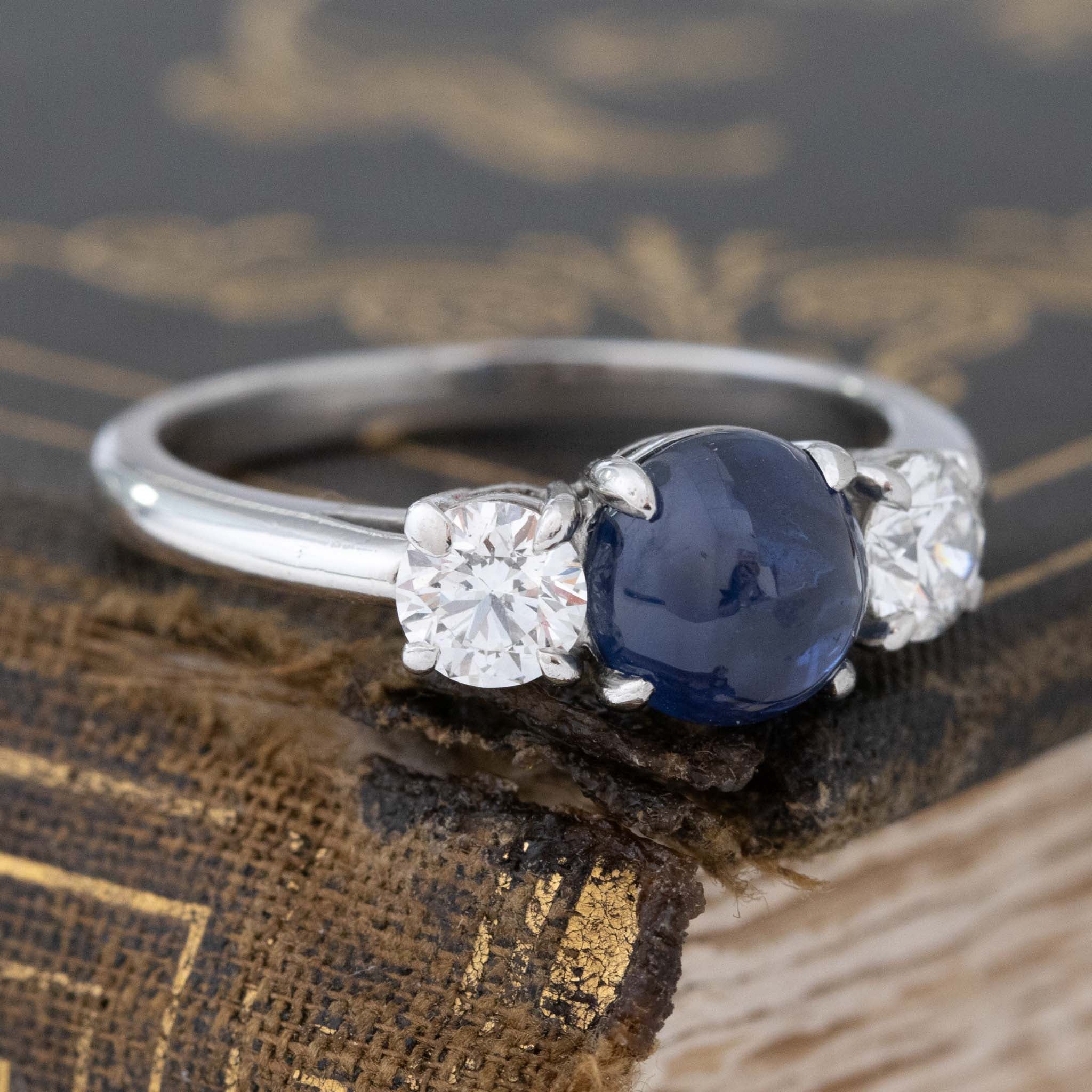 As elegant and as timeless as can be! And the fact this this beaut is from jewelry house Tiffany & Co is simply the icing on the cake. The cabochon sapphire has killer color to it - a rich, deep blue with so much life without being inky or too dark. Just beautifully saturated, and pops stunningly well against the icy white diamonds flanking it. One of our rarer finds, and would make for a wonderful engagement ring, or right hand ring. A true classic!