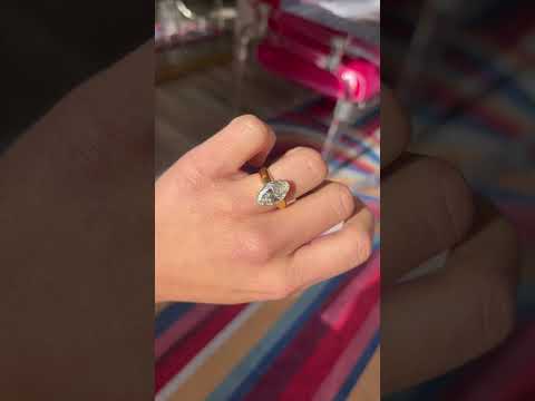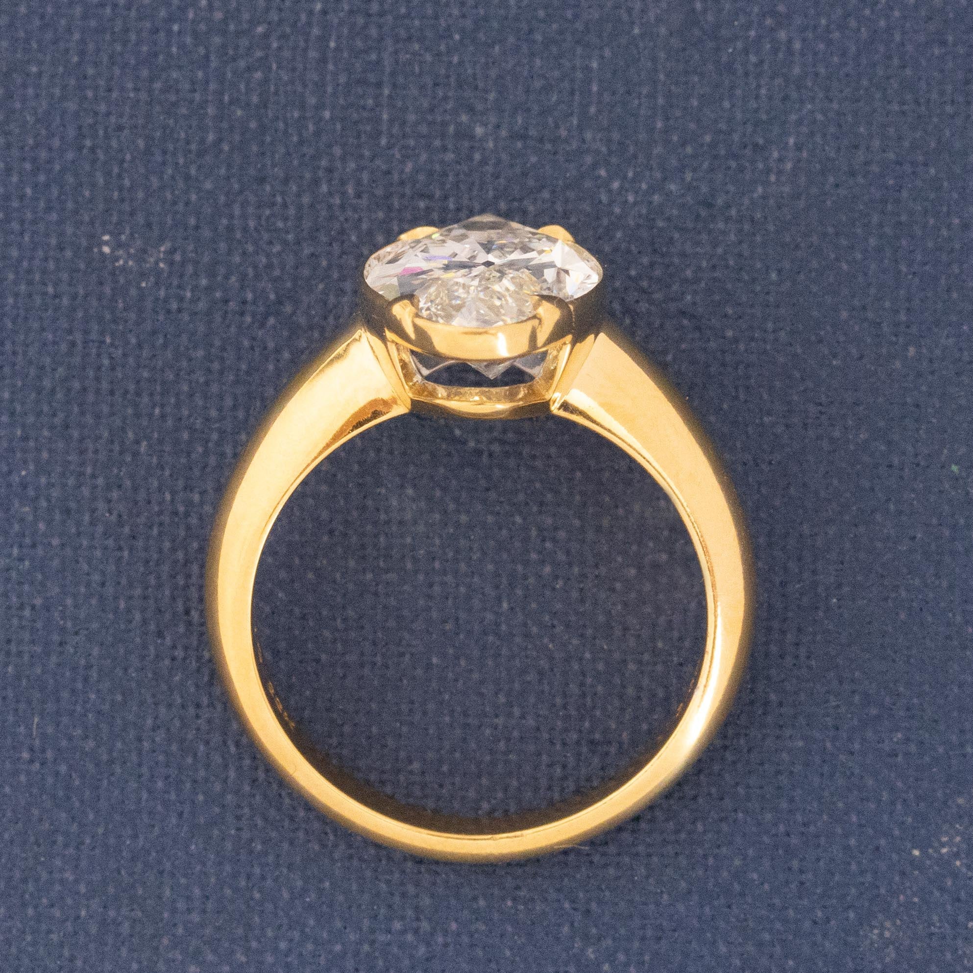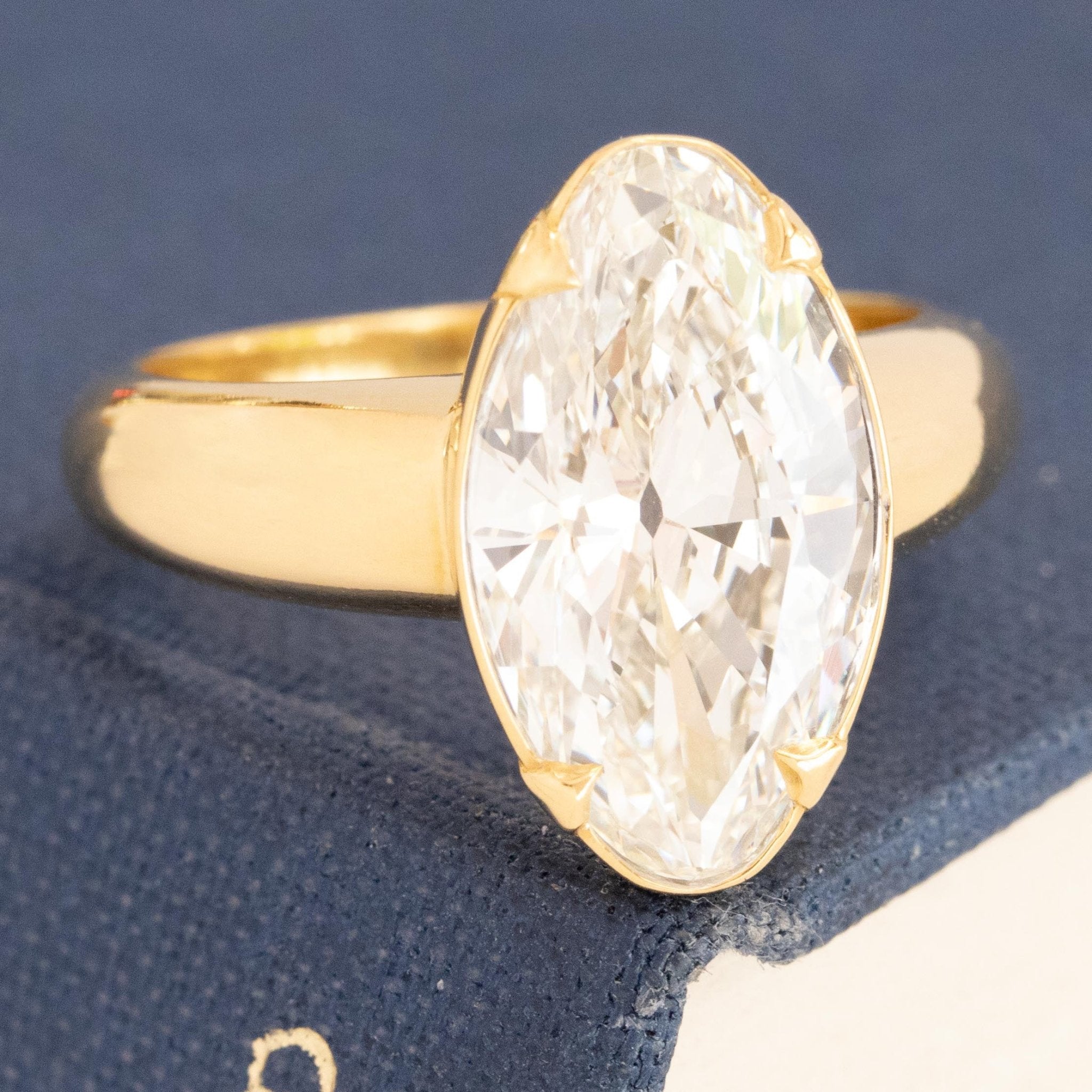 An absolutely divine moval cut diamond - the perfect halfway point between oval and marquise. We set this baby in the North/South orientation in a thin gold frame with four fold-over prongs hugging her. The shank is slightly domed and wider, so she wears comfortably and feels like butter on the finger. The shank tapers down ever-so-slightly, giving you a sumptuous look from center stone to setting. She's divine in this high carat setting and looks waay bigger than her carat weight.