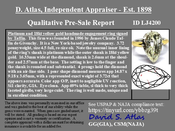 3.72ct Pear Cut Diamond Solitaire by Taffin