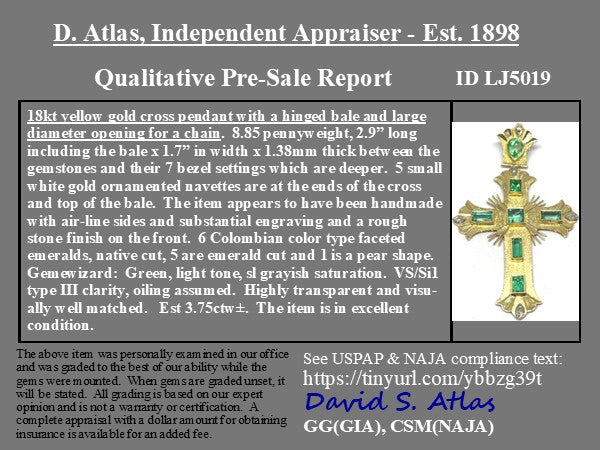 A vintage Renaissance Revival gold and emerald cross pendant with texture, form, and a beautiful presence when worn. It has subtle two-tone details in the metal and plenty of romantic swoops and forms - plus, who can resist the color contrast between gold and emeralds?