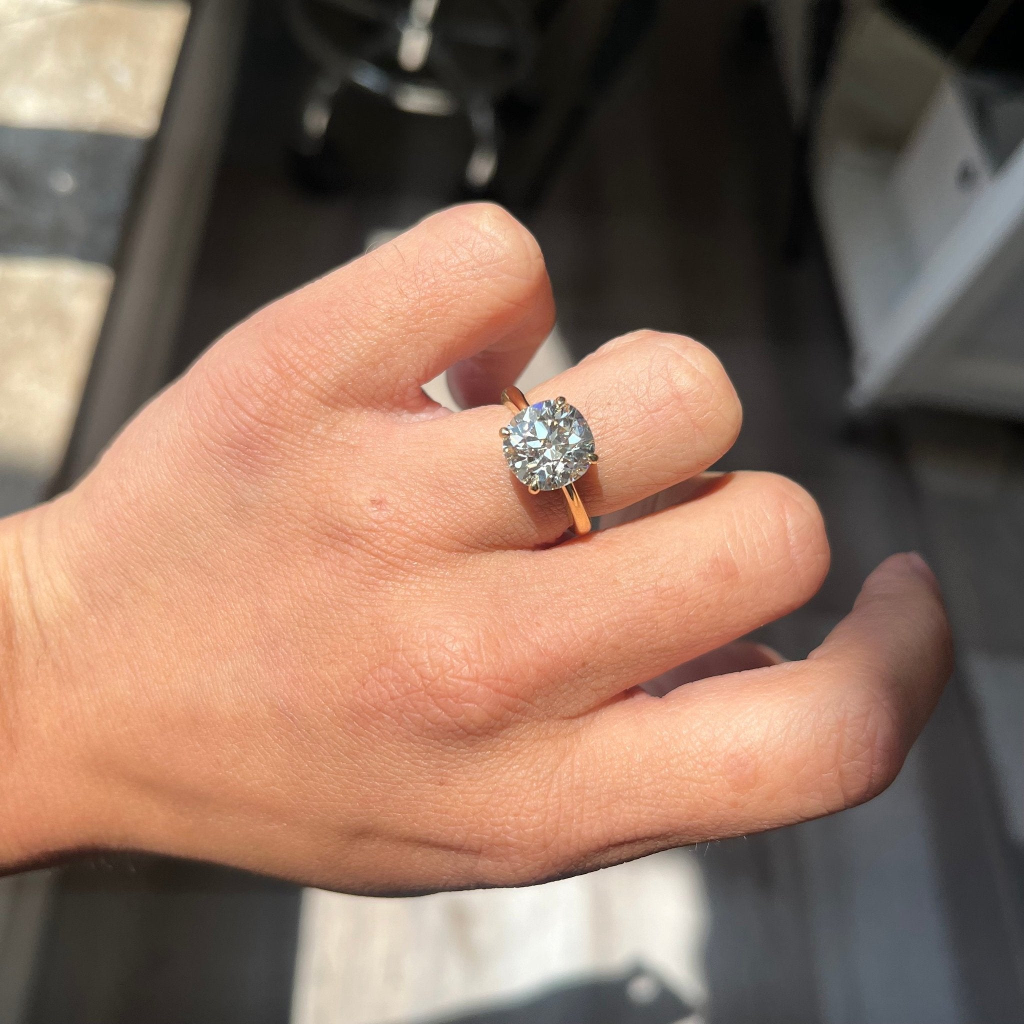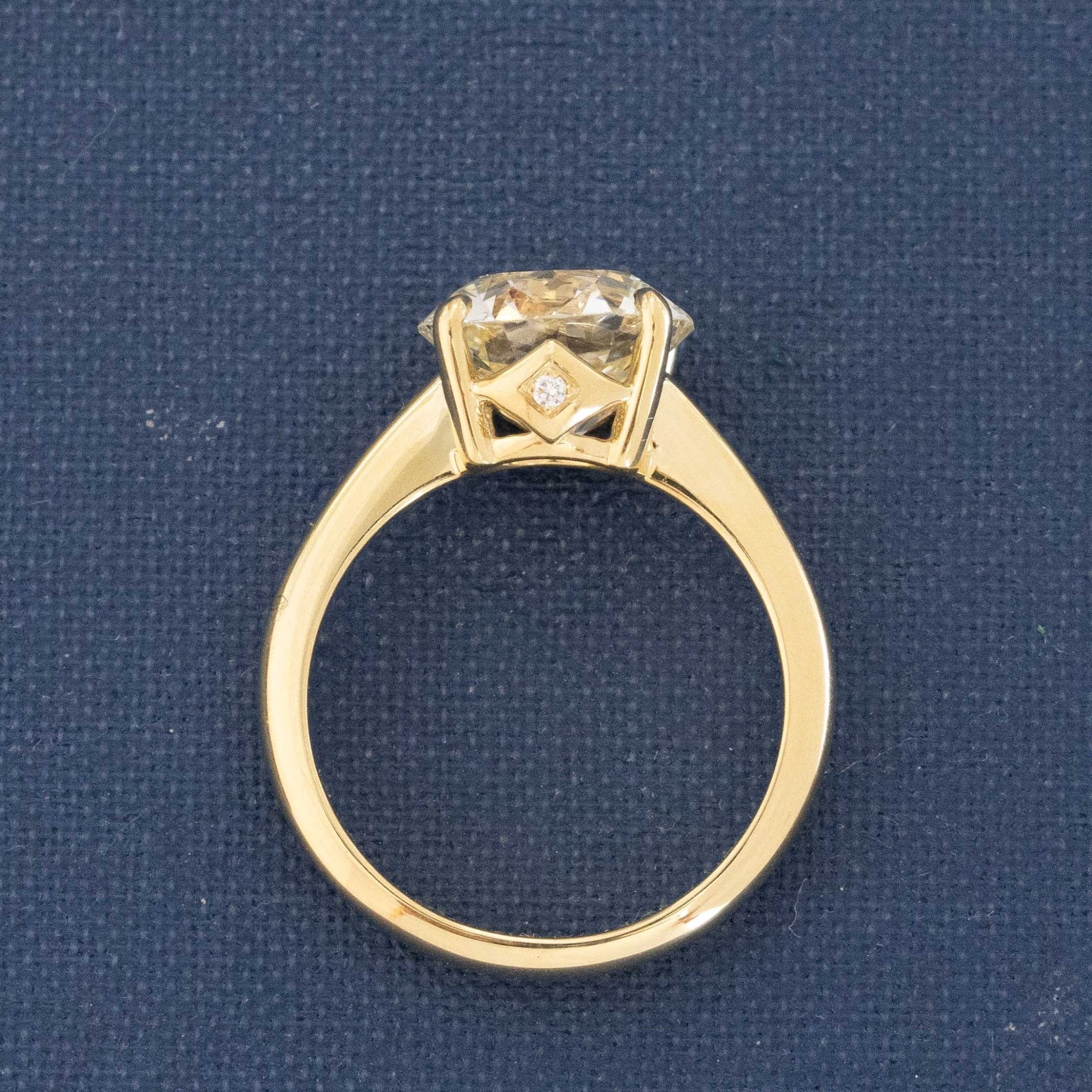 An incredibly pretty old mine cut diamond with classic looks - a soft square shape with chunky facets which pick up light and colors from her surroundings! And with a 62% depth, you get a 4ct look without the 4ct price tag to boot! Beyond charming, highly prismatic and white facing diamond. Set in a timeless four-prong mounting with diamond accents along the gallery - perfect for stacking, too!