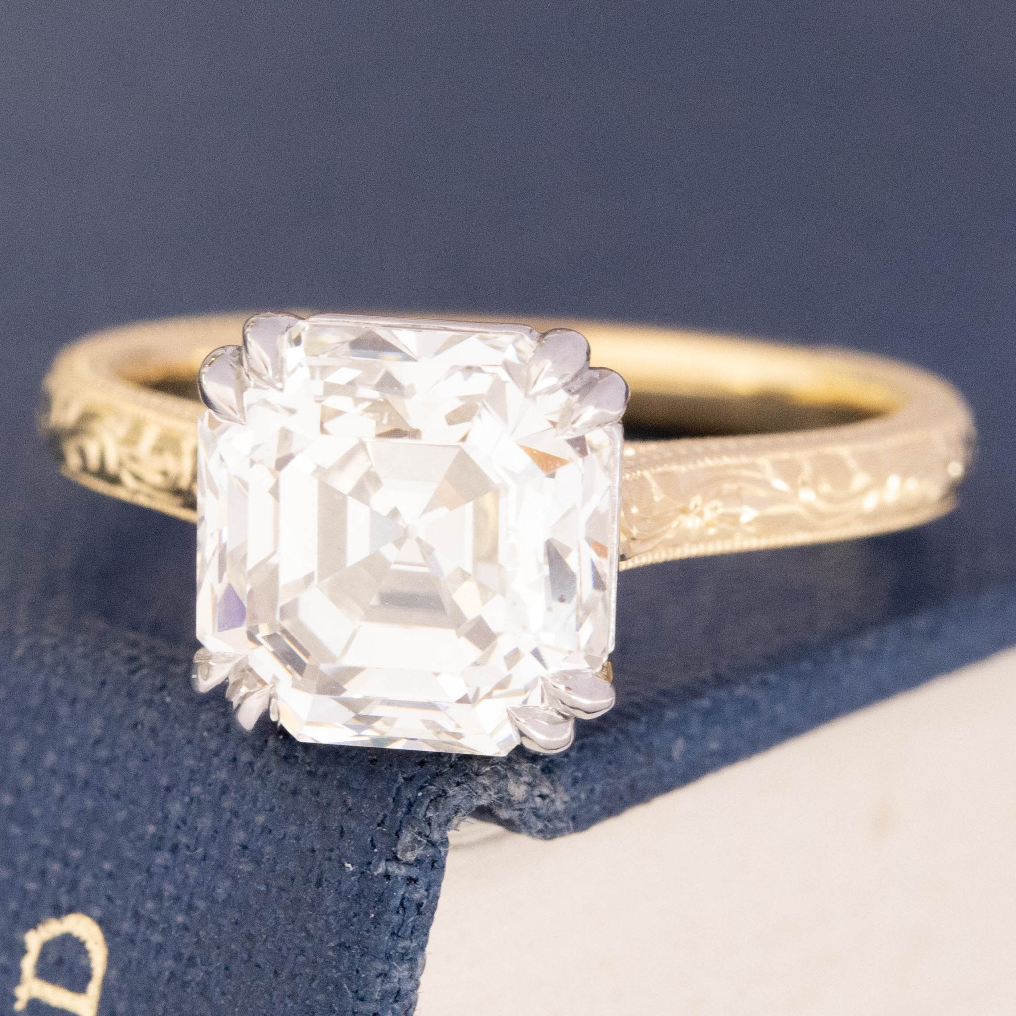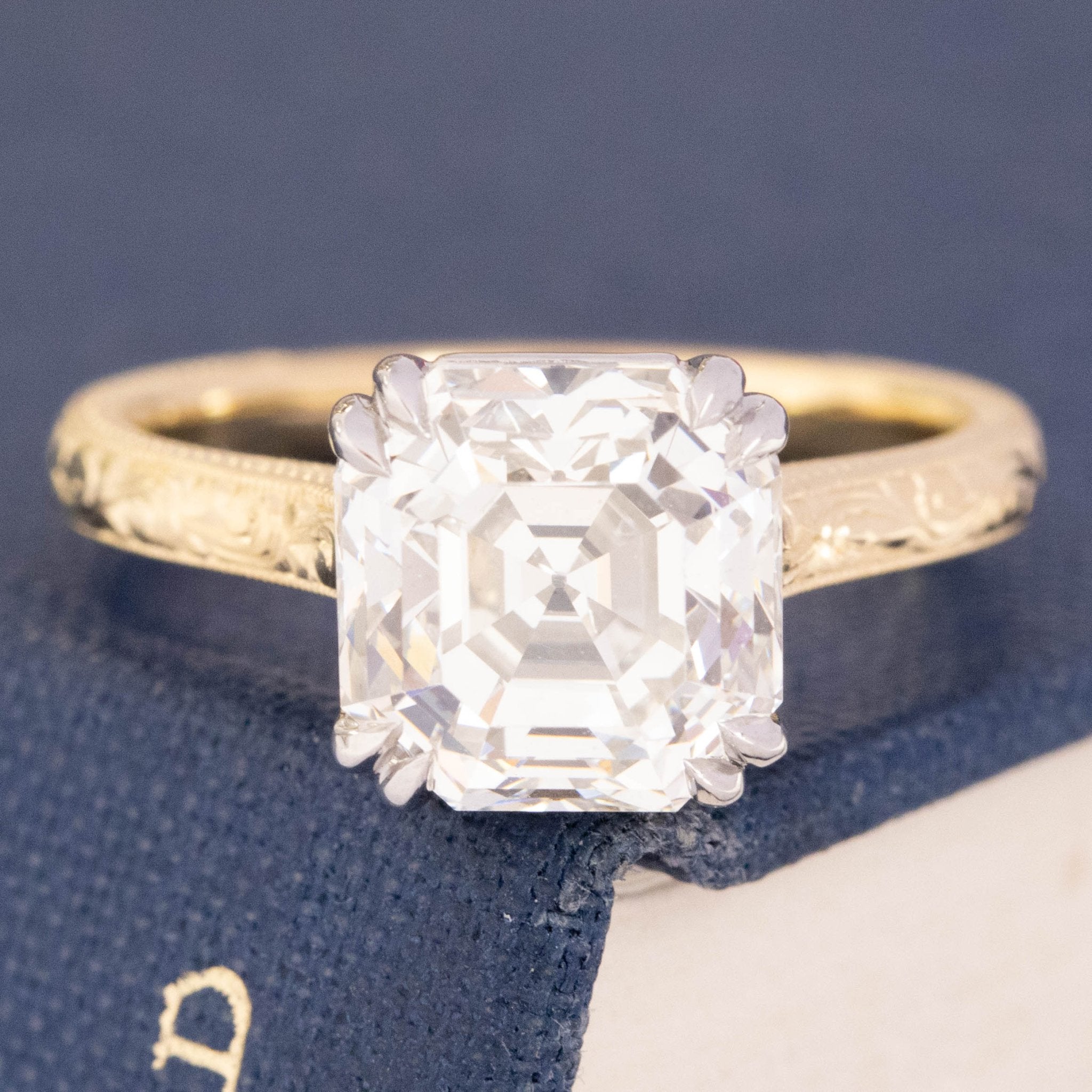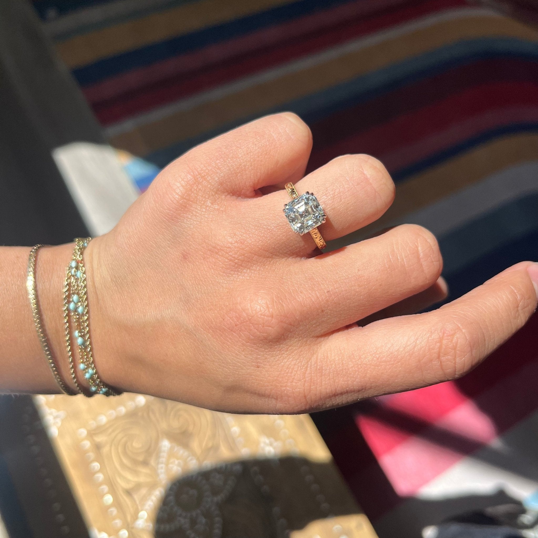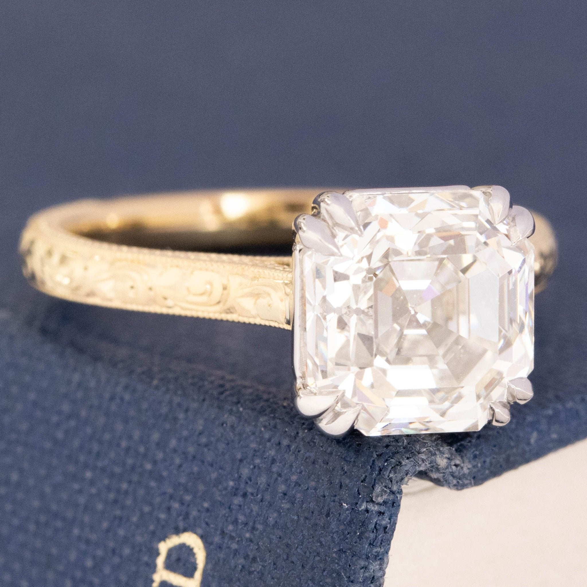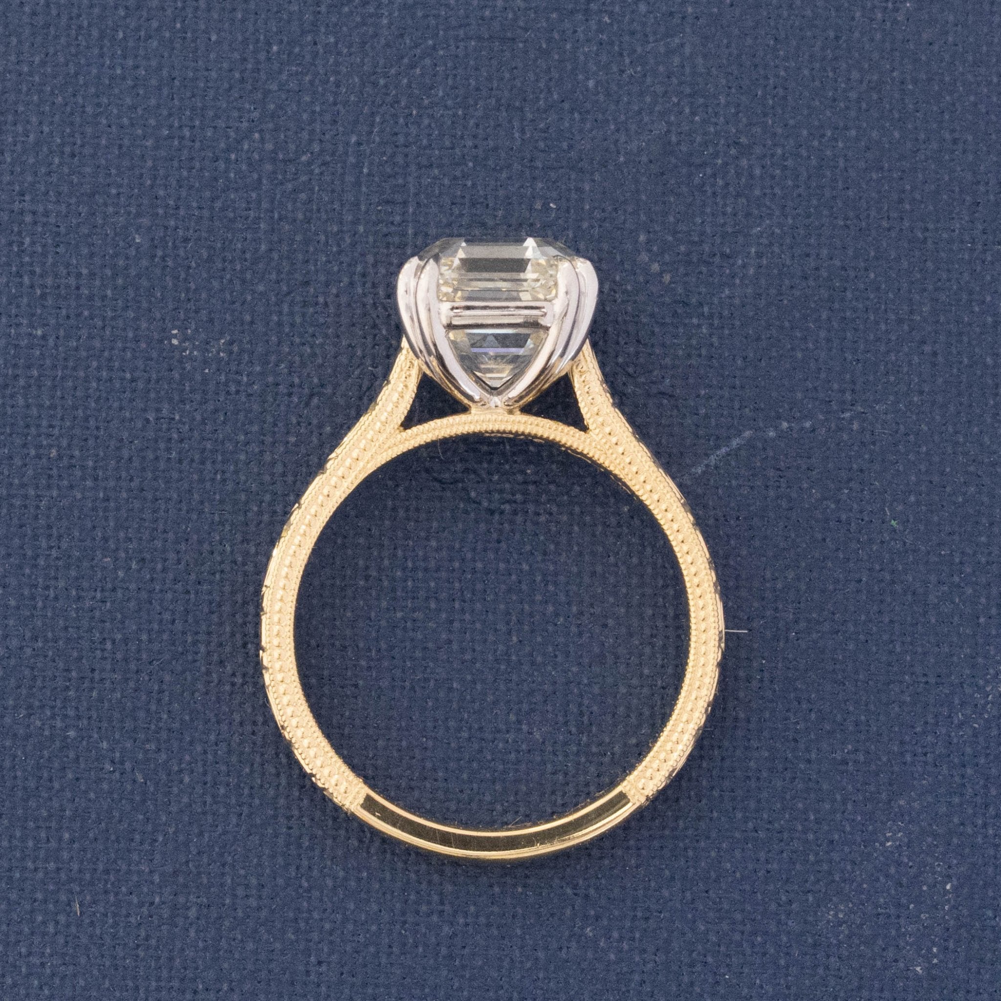 The diamond is exquisite and in this setting, she simply came alive! Super bright, with a whisper of warmth, the solitaire is very understated yet present. Gorgeous hand engraving along the shank. Will stack beautifully with a band as well!