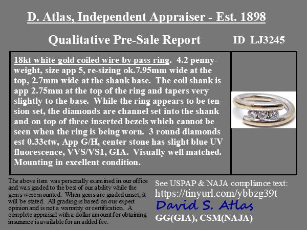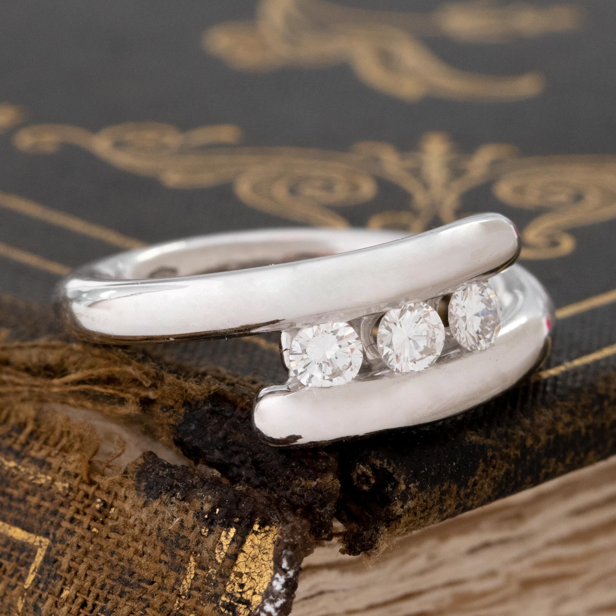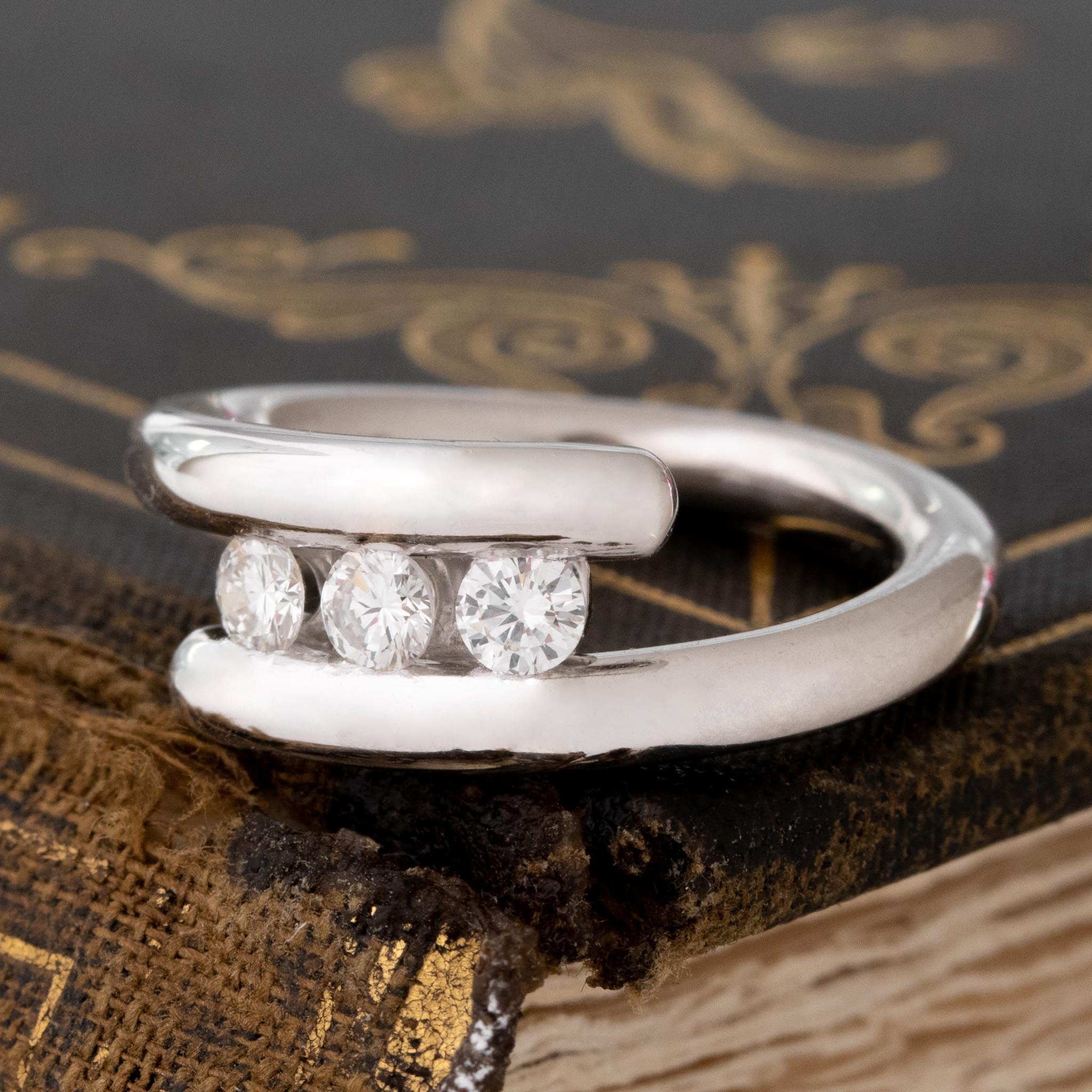 Pretty rad (and un!) bypass band, set with 3 matched round brilliant diamonds. Super cool on the finger and a totally different look!