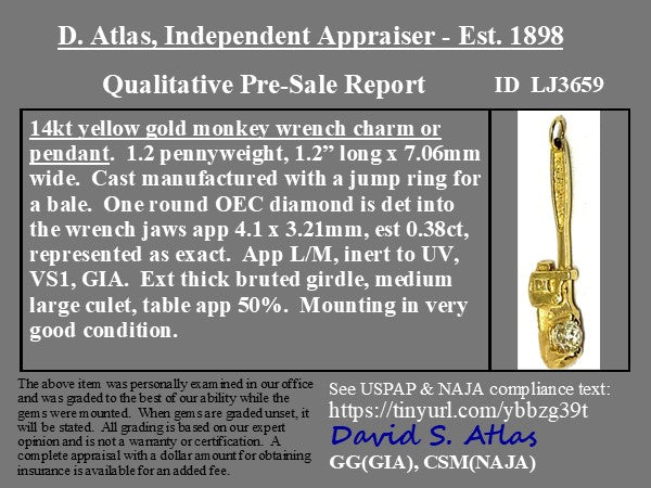 Our jeweler worked a bit of magic and was able to set the stone perfectly along the mouth of the wrench, adding a perfect little sparkly moment. Whether hung on a chain or charm bracelet, this monkey wrench is a great tool to keep with you everywhere you go.