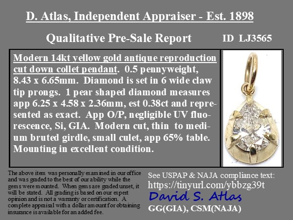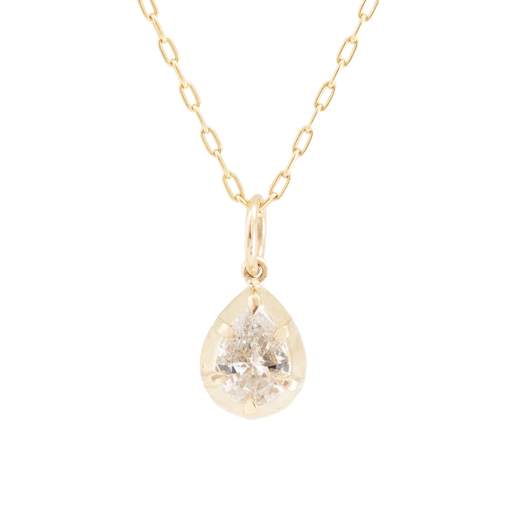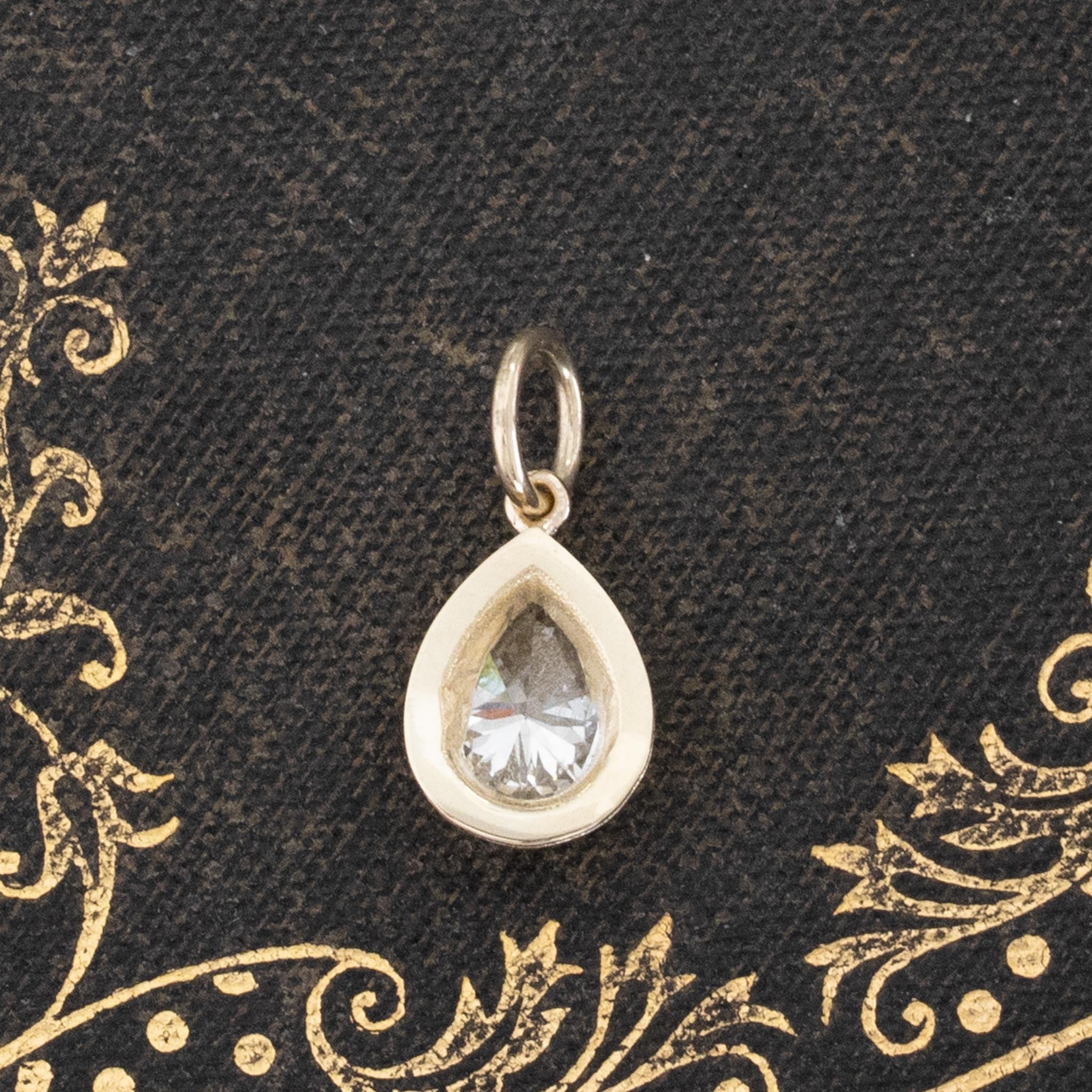 Coming from a parcel of vintage reclaimed diamonds, we set this pear shaped diamond in one of our favorite styles - the collet setting in yellow gold. The perfect diamond charm for your necklace or bracelet! Antique inspired and the most charming.