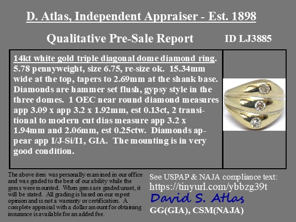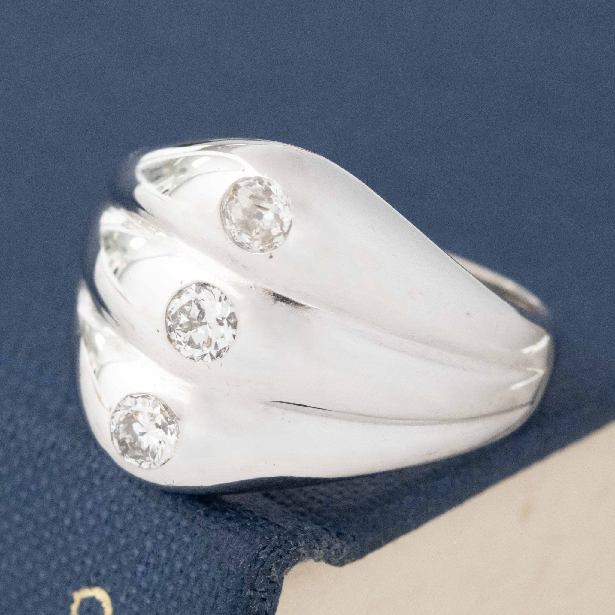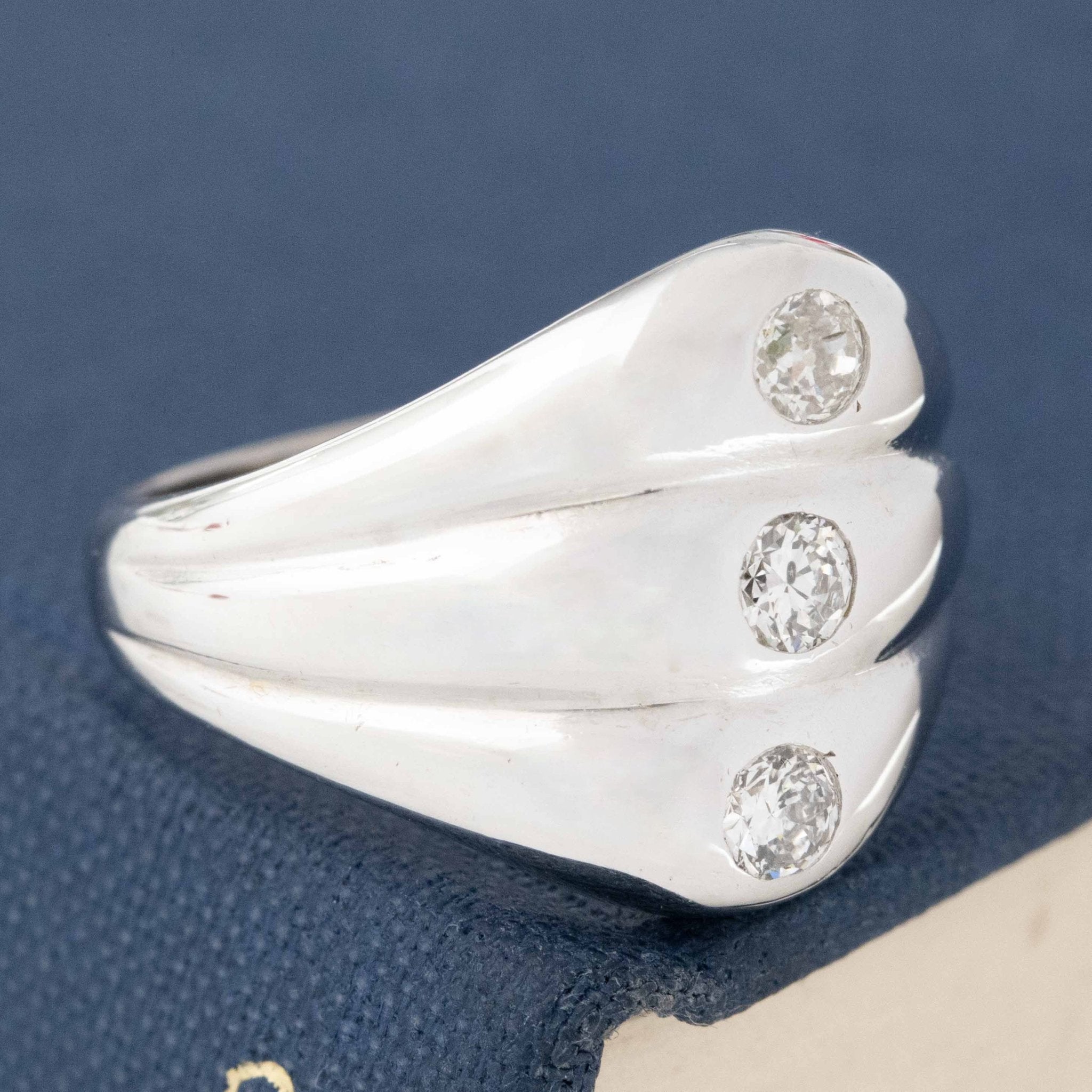 The only thing better than one old cut diamond is three! Especially when flush-set in a delicious triple row dome ring such as this one. We don’t often find these chunky old dome rings in white metals, so finding this 14kt white gold baby was a treat for sure. Perfect for those who love the big, bold chunky look but in a white metal - the three old cuts which sit flush in the ring are prismatic and bright, adding just the right amount of sparkle in the sun. Comfortable to wear and smooth like butter.
