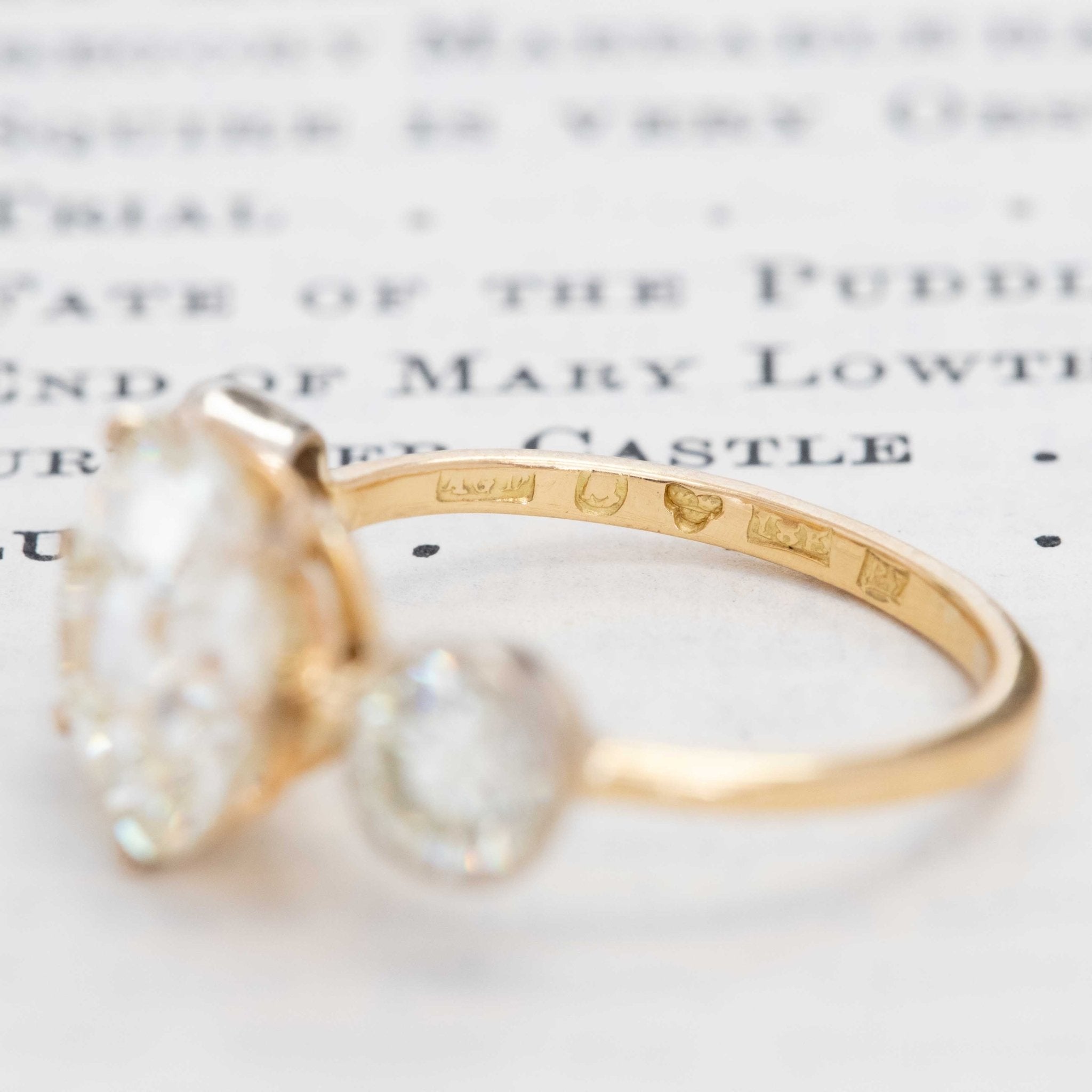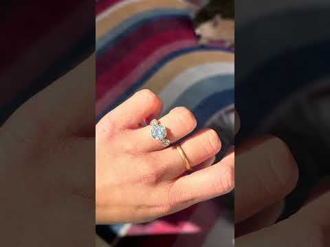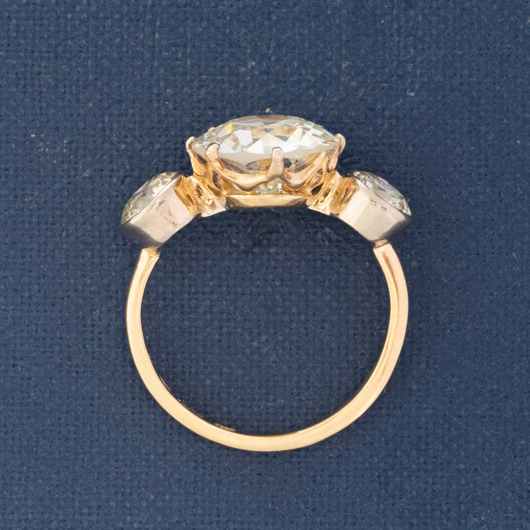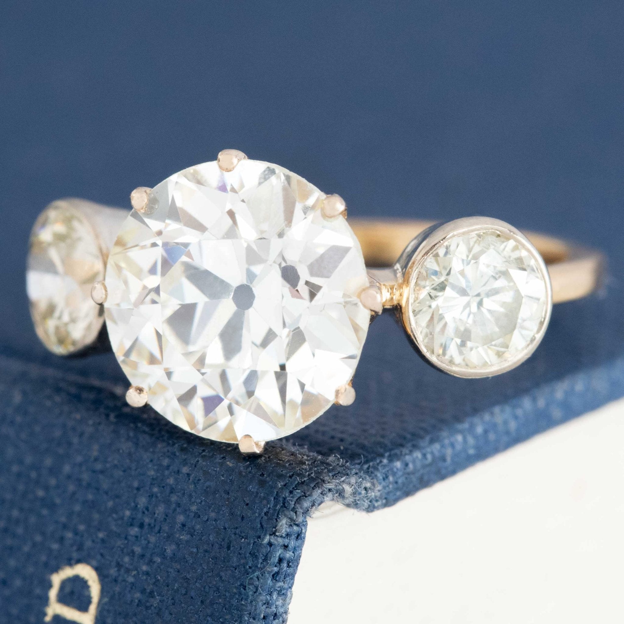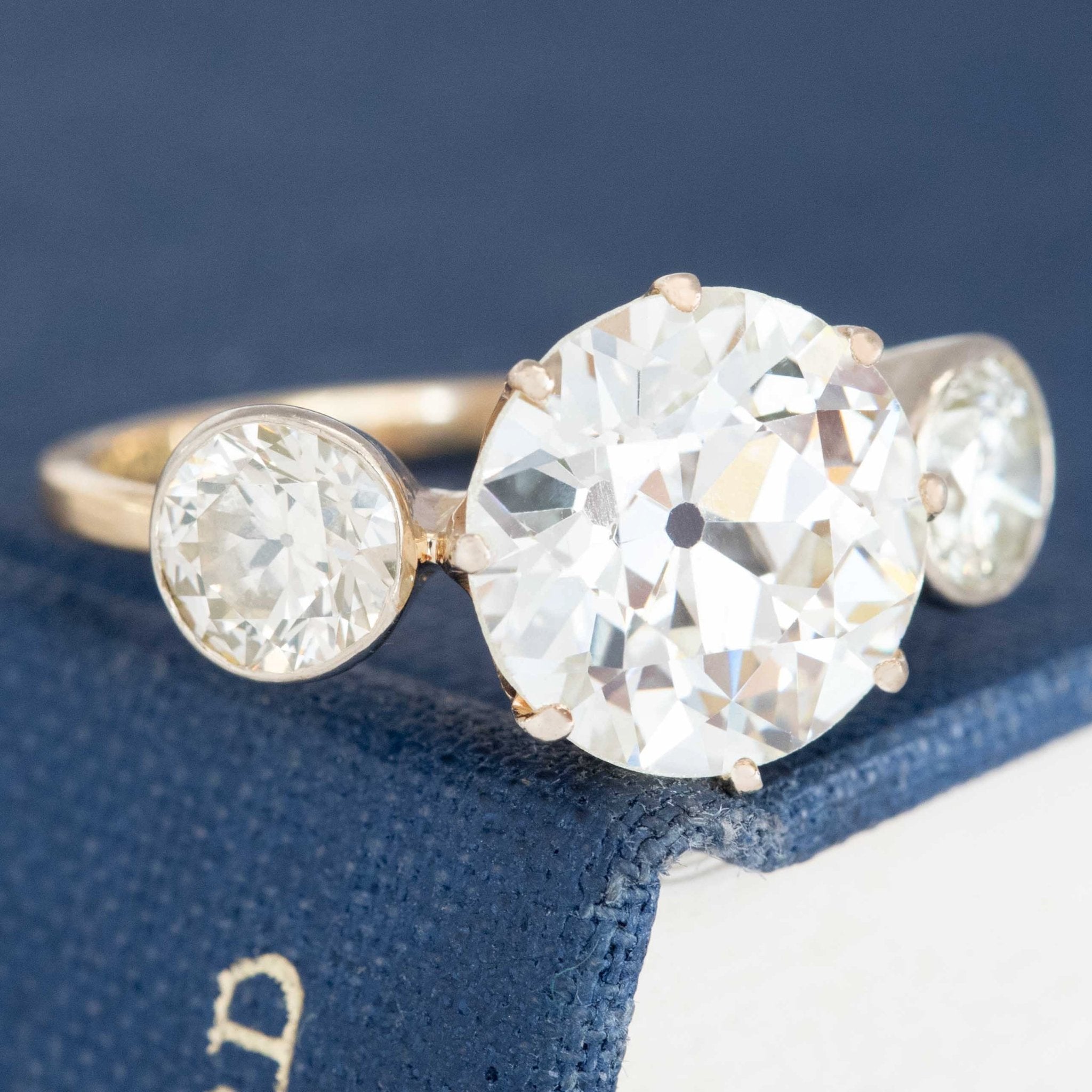 This trilogy ring with 3 Old European cut diamonds is an absolute stunner, with the loveliest proportions and spread across the top of the finger. The center is a 3.45ct N VS1, with a much whiter face-up than its graded color. We love the two bezel-set OEC’s that sit on its’ shoulders, adding a dual-setting-style element to the prong-set center stone. Not to mention, the mounting is also antique! She’s fully loaded with hallmarks including an 18kt stamp and a French ram’s head, confirming this is gold.