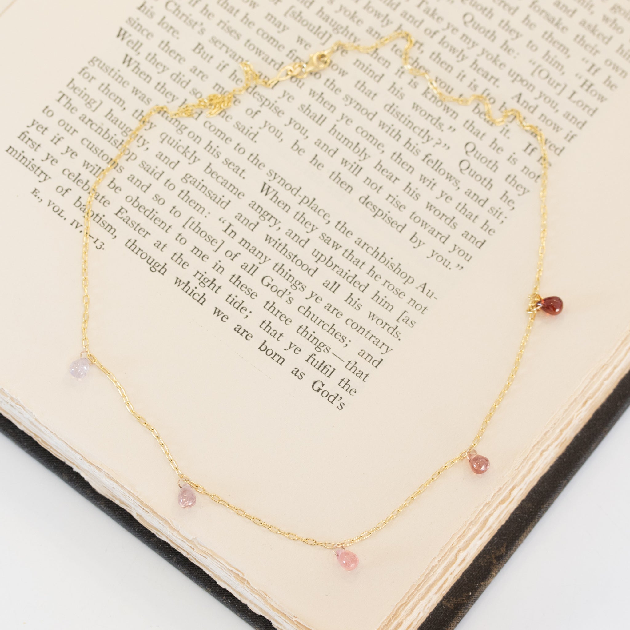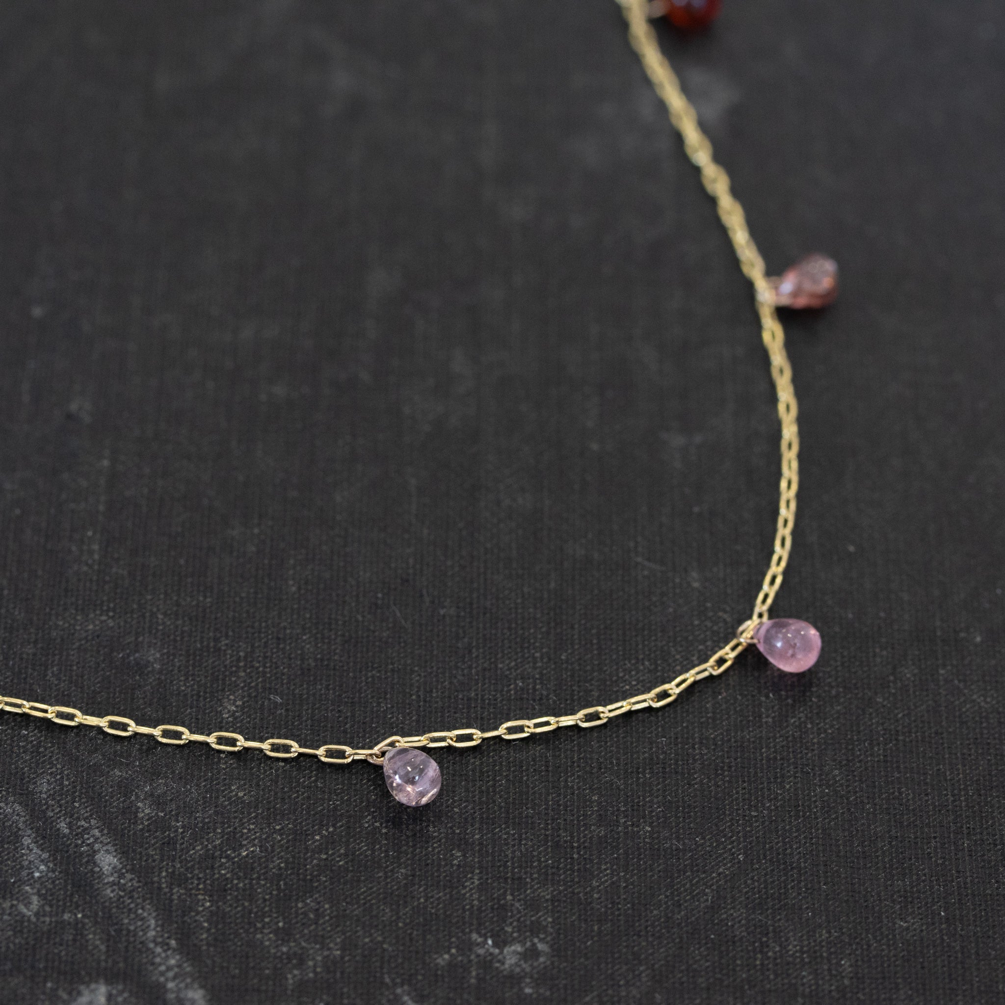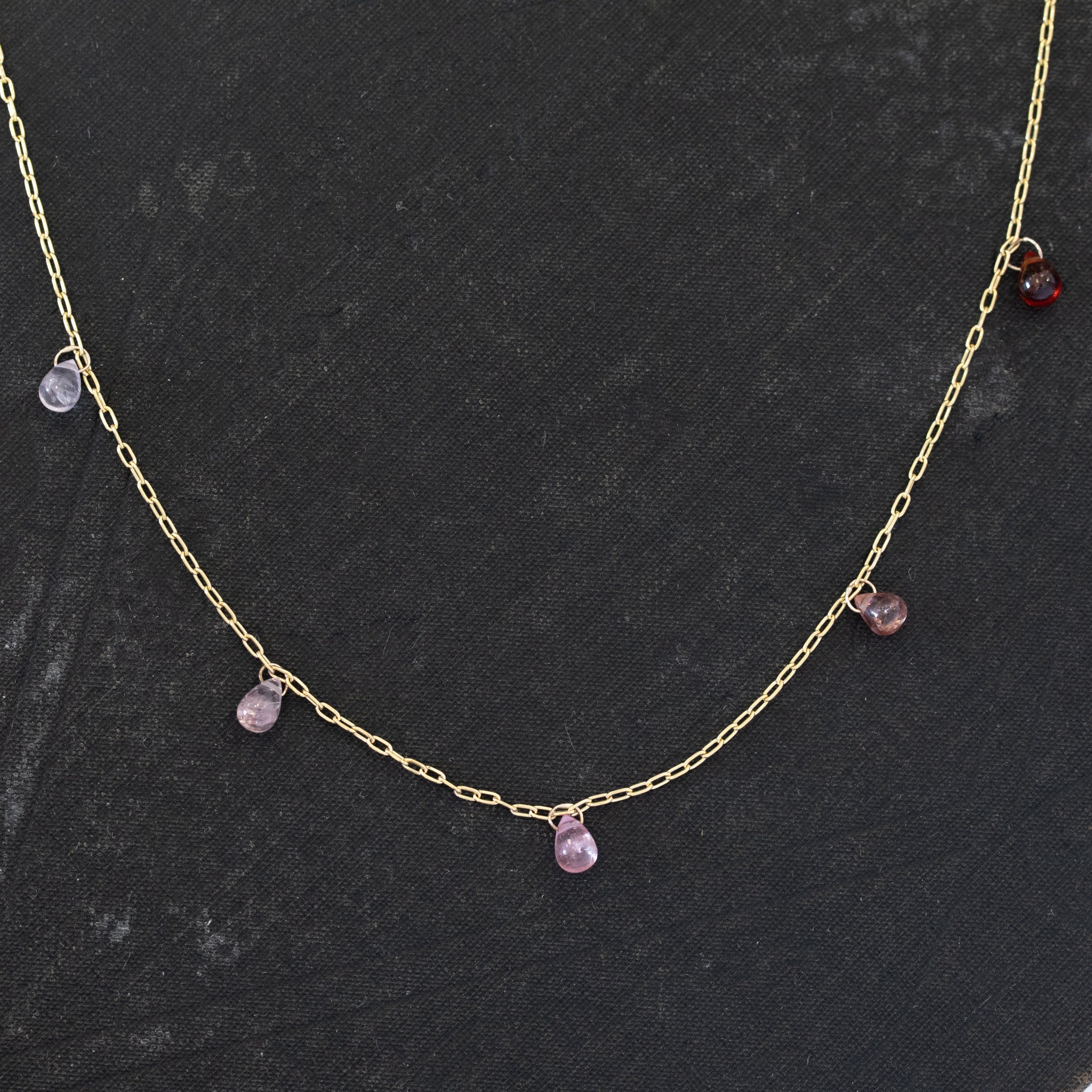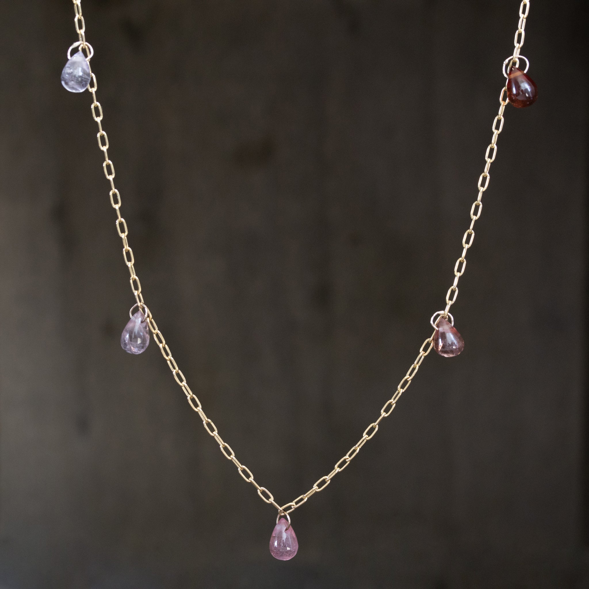 We recently purchased a 200ctw+ parcel of these no-heat spinels in all colors of the rainbow because we just adore their deeply saturated colors. Too adorable and charming for words! And the perfect jewel to add a pop of neutral color to your wardrobe! This necklace is set with a graduating (in hue and color) line of pink to reddish spinles - candy colors for your decolletage!