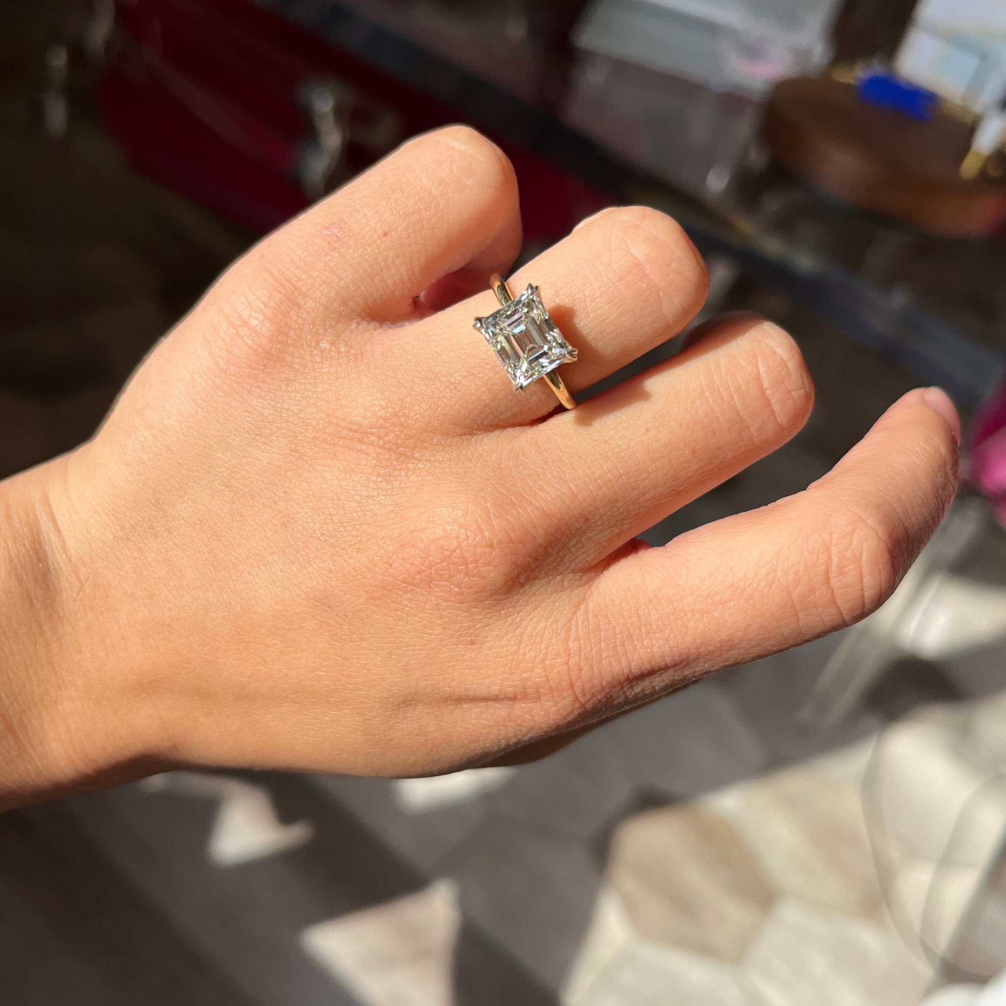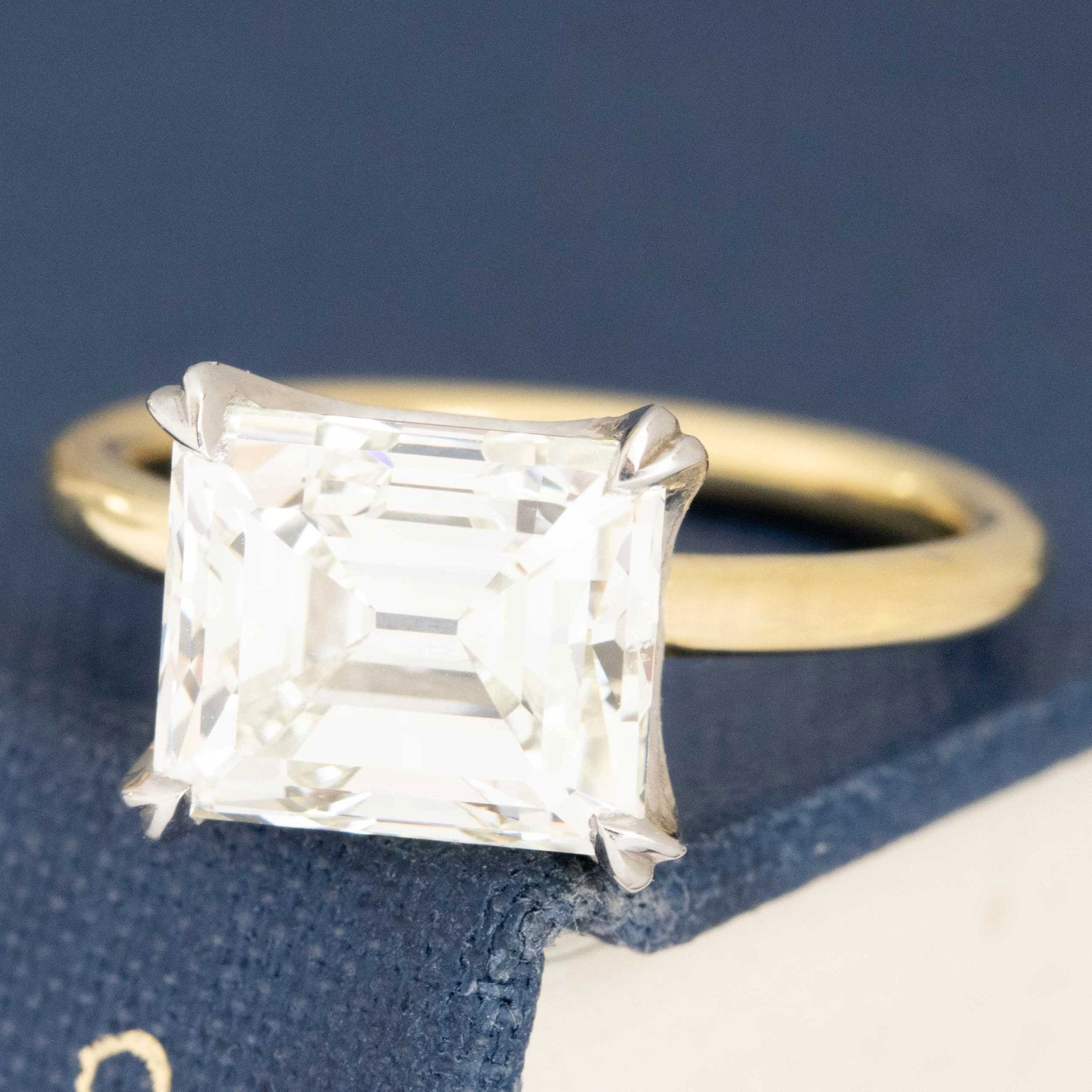 The perfect juxtaposition of the old and the new! This antique emerald cut is a stunner of a stone, and set in this simple and sleek 4 prong solitaire with split prongs, the result is a gorgeous ring that is elegant and timeless, yet also modern and very current in its vibe. Just so eye-catching on the finger! The style will allow for a wedding band to also sit flush next to the ring.