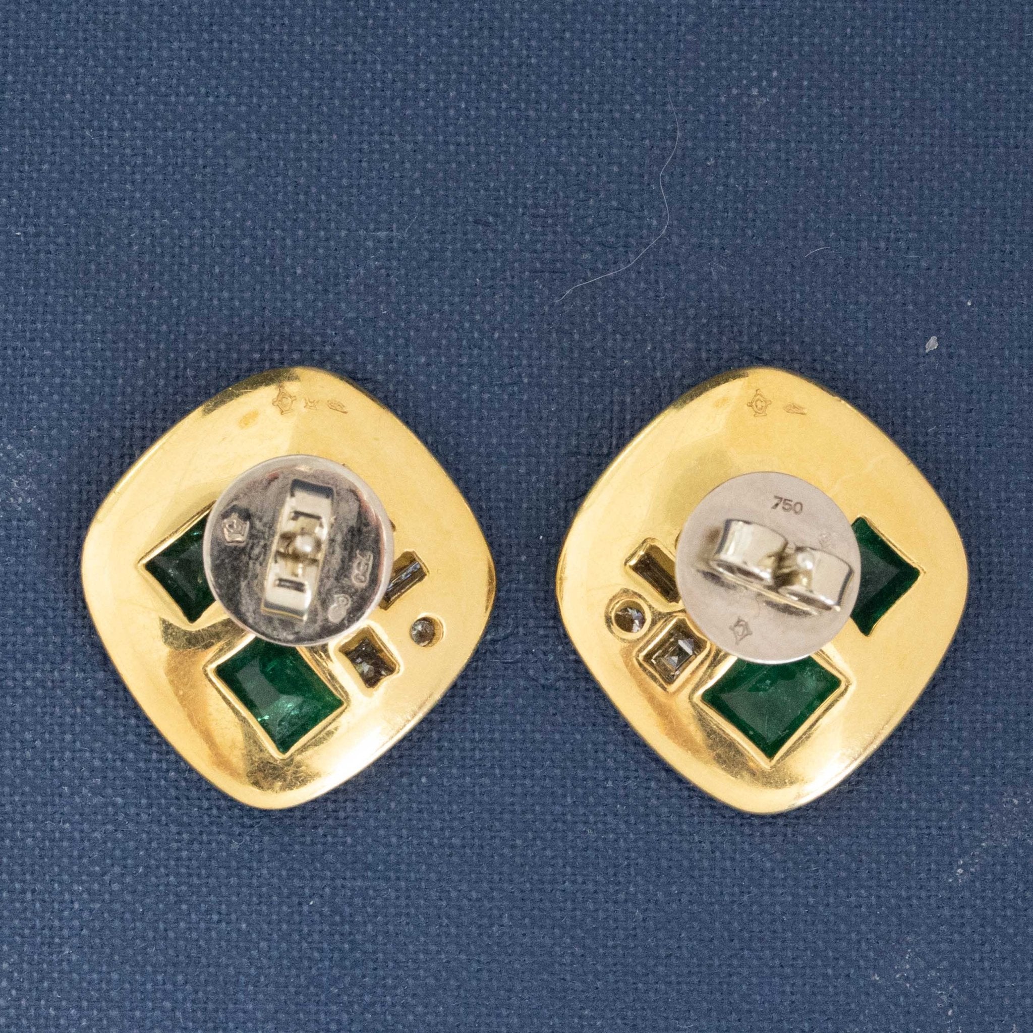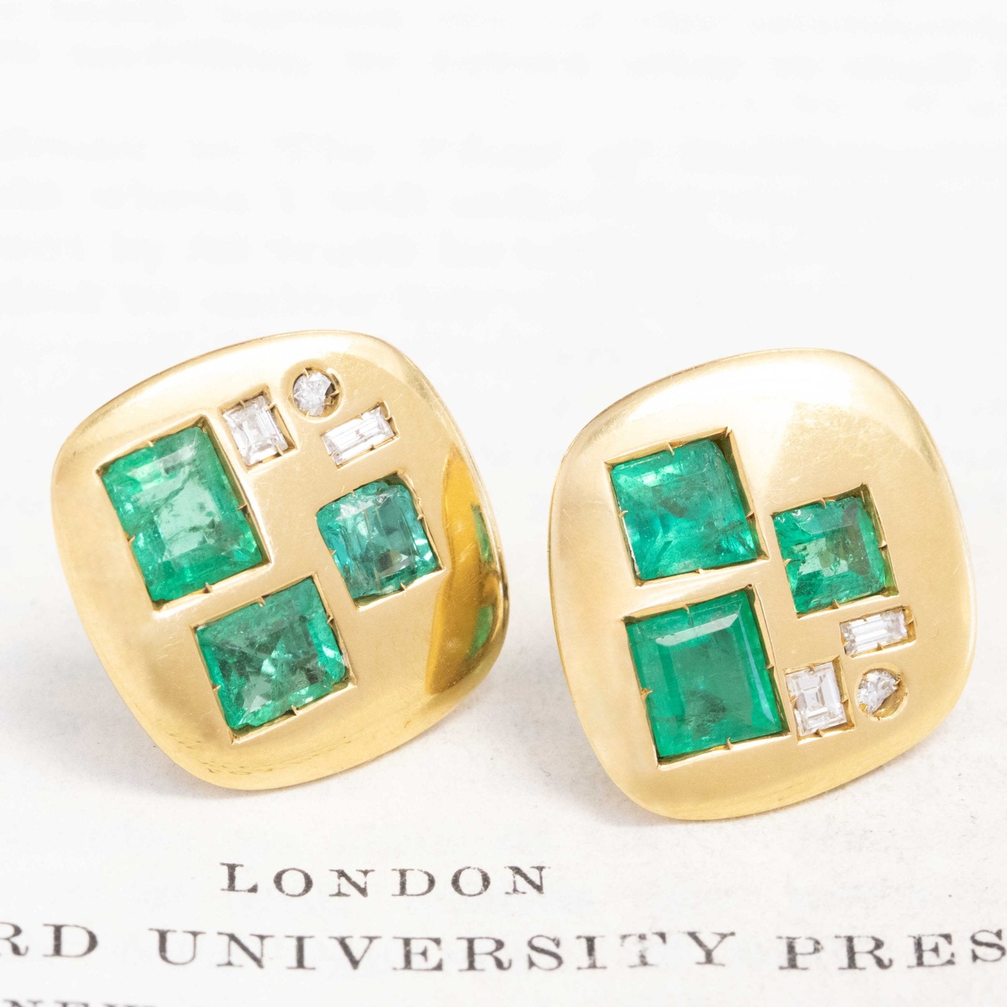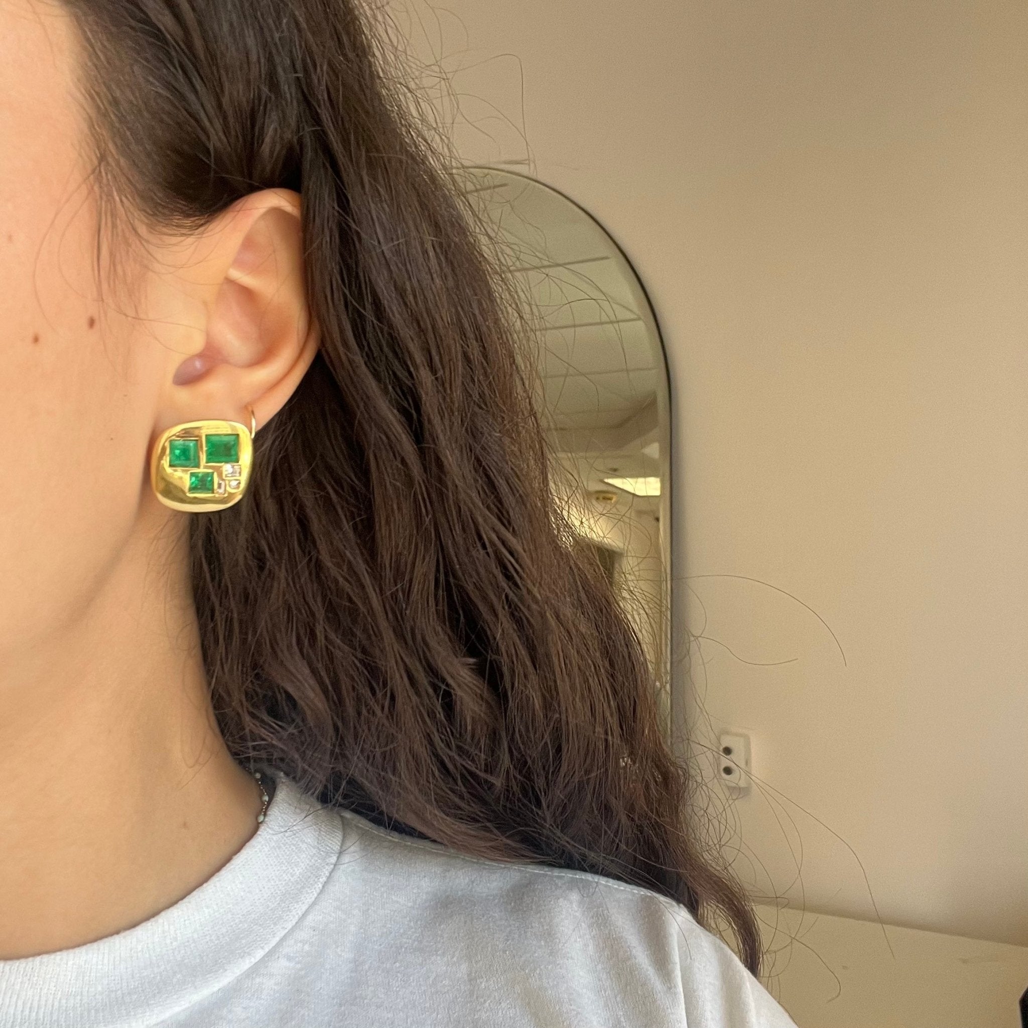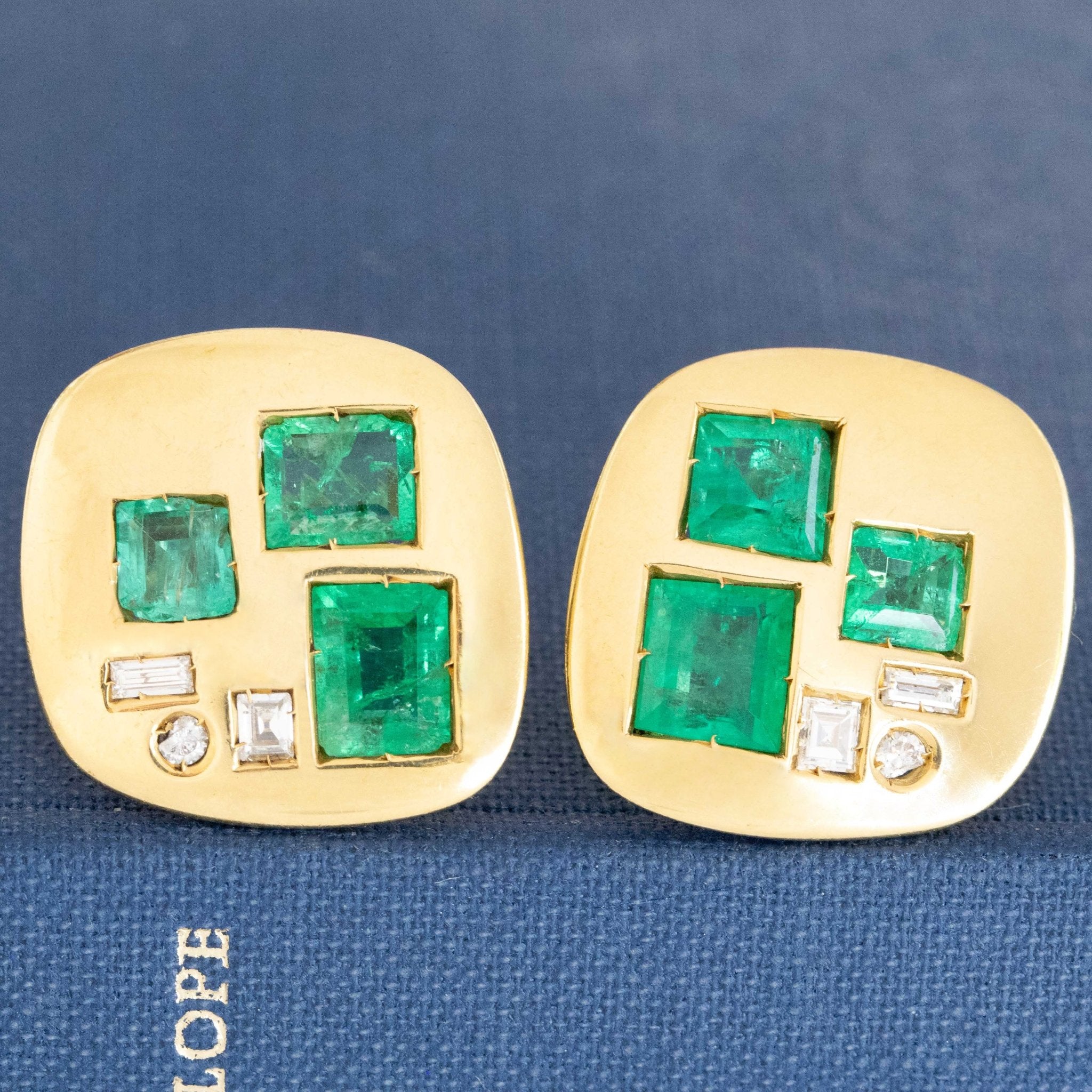 A really cool "scatter" situation, giving big Mod vibes in warm yellow gold! Delicious step cut green emeralds and bright diamonds sitting flush in cushiony discs of gold, a pair which you gives you big and bold from every angle. Its the best of the 60s/70s!