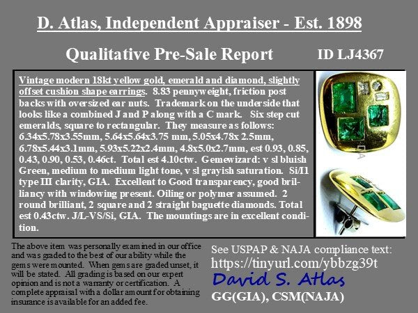 Emeralds are medium to medium light tone, SI/I1 type III clarity, GIA standards.