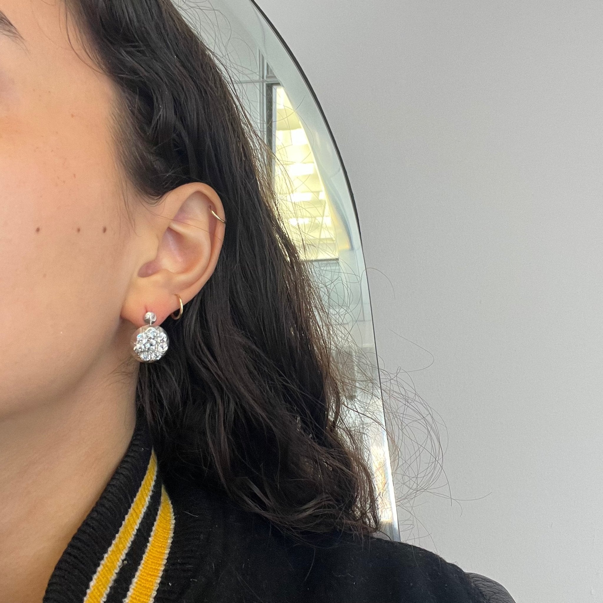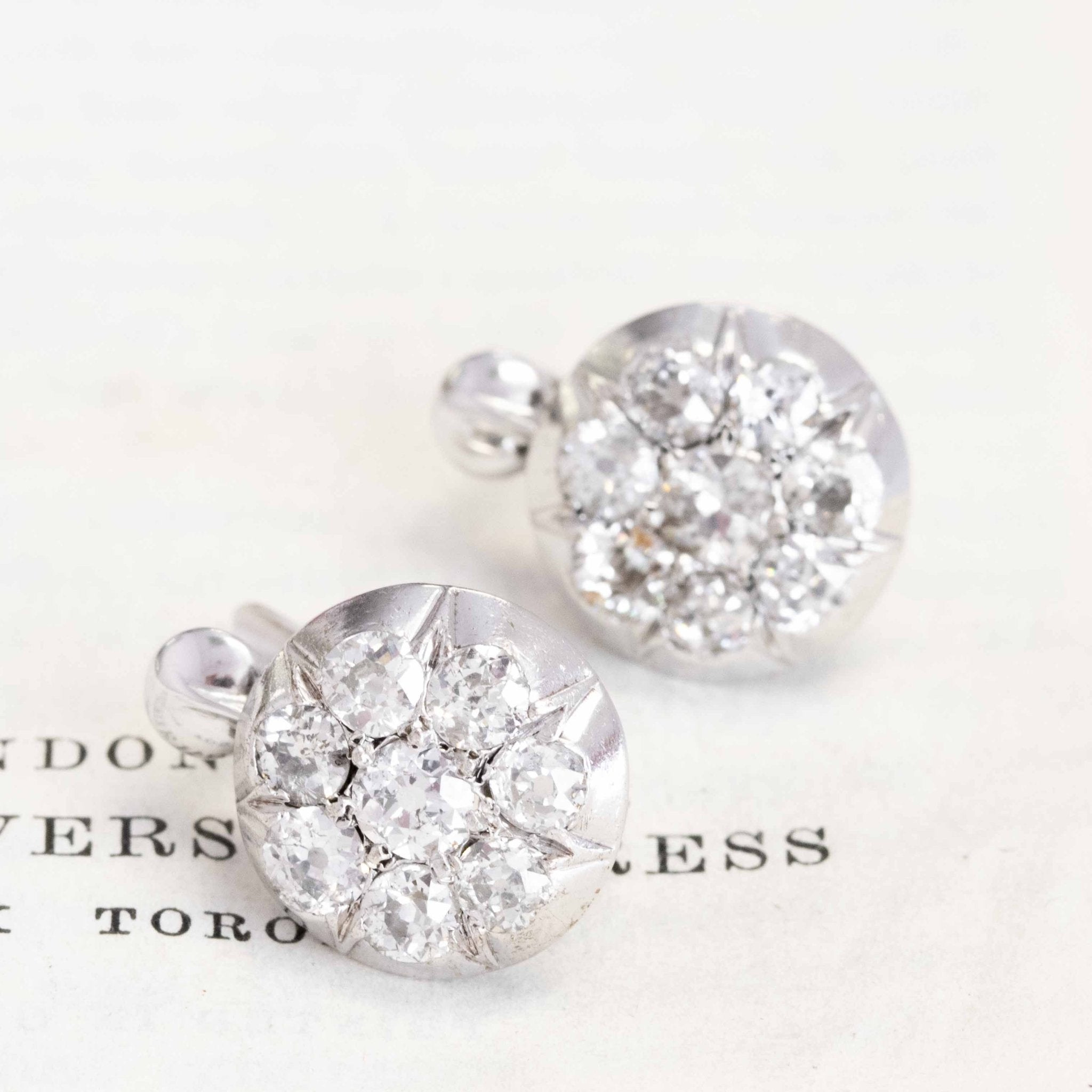 Imagine these gorgeous antique cluster earrings like tiny galaxies on your ears! In their original collet settings, the diamond twinkle like mad, catching the light with every movement. The diamonds are all chunky little monkeys with teeny tiny tables, full of personality.
