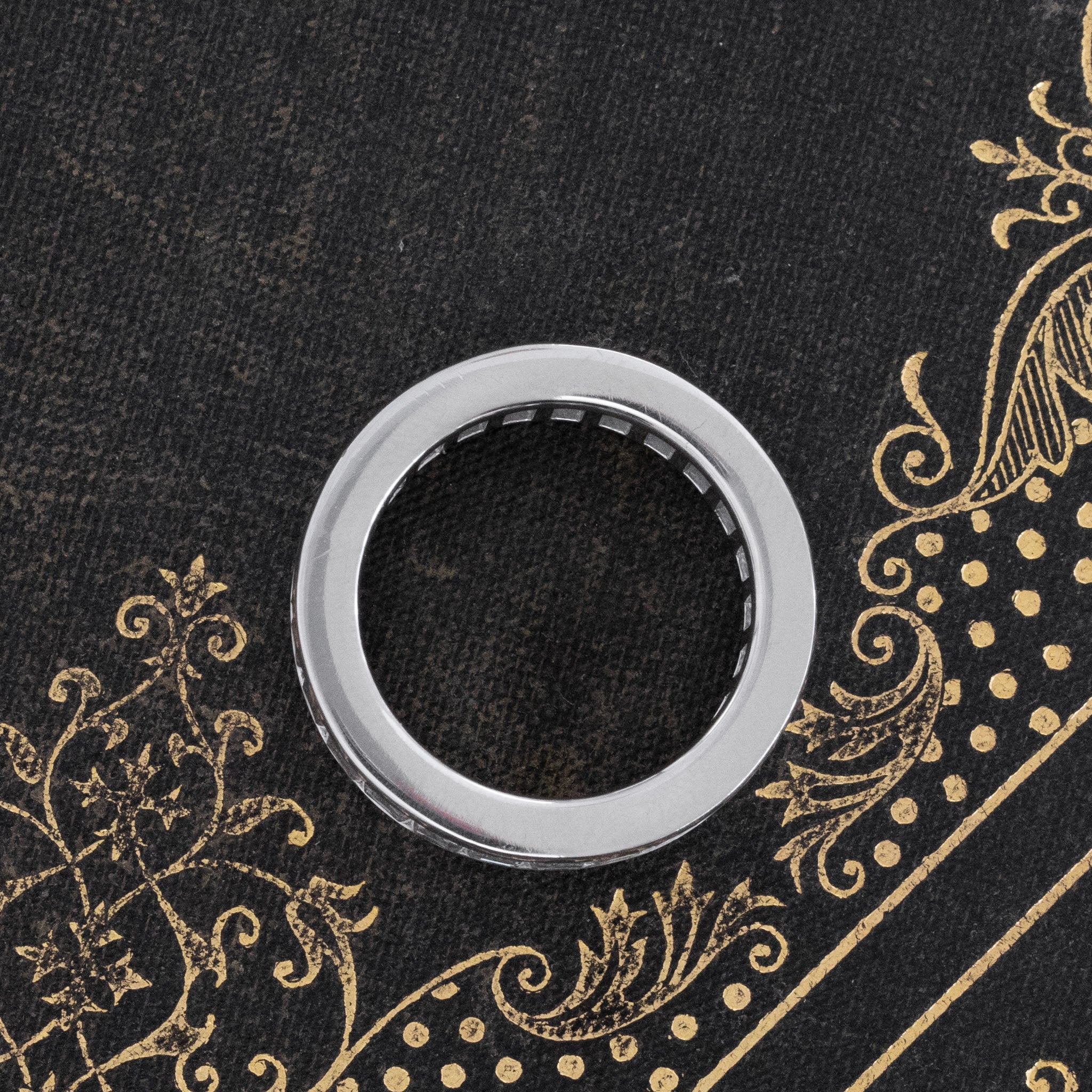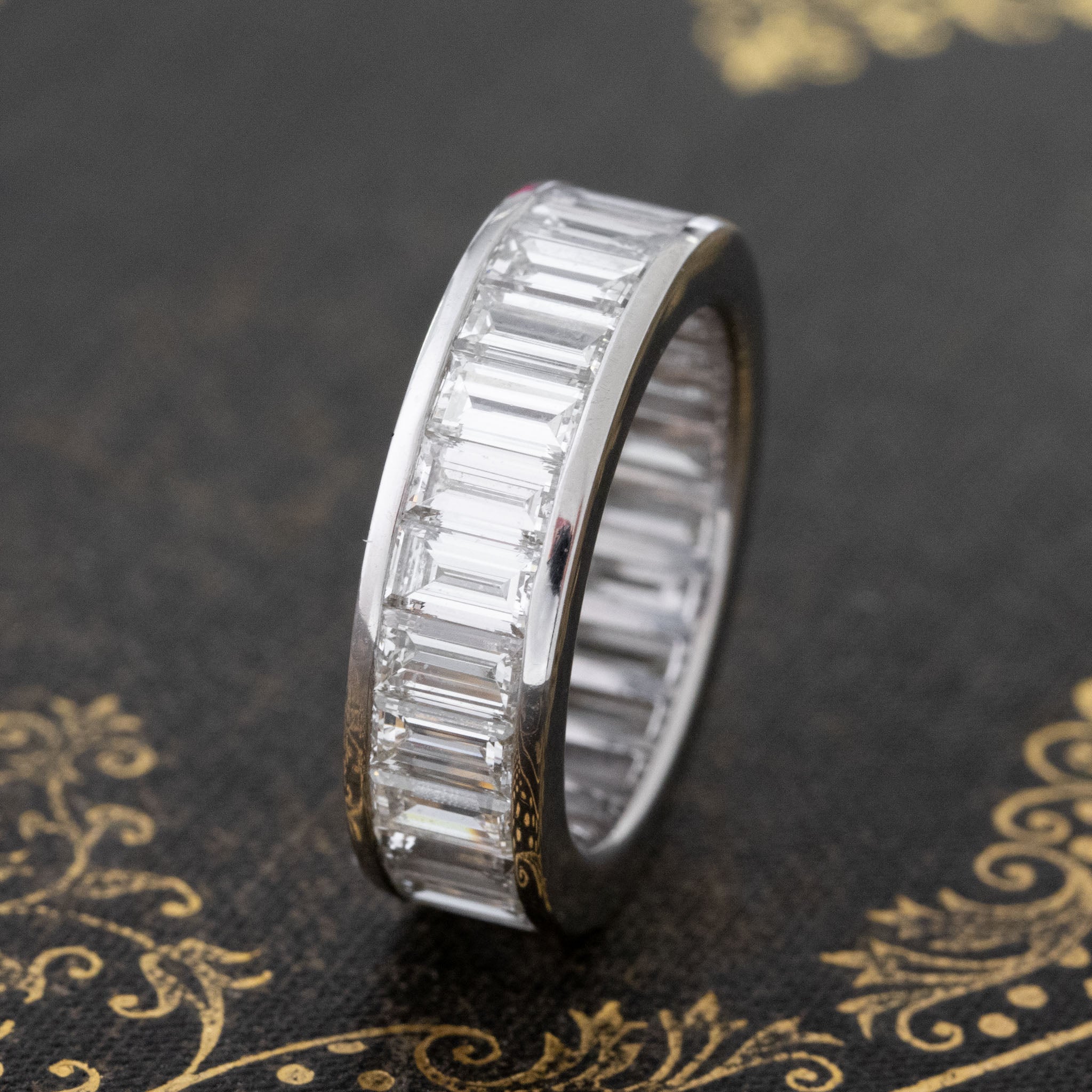 There's nothing quite like a full diamond eternity band - especially when it's a dead ringer for Marilyn Monroe's engagement ring from Joe DiMaggio! This baguette cut diamond band set in platinum is a chic and timeless diamond ring option that is such a classic. The channel walls hold in the shimmery baguettes perfectly, offering a delicious presence on one's fingers. The ring is a size 6 but fits more like a 5, 5.5 due to that wider band. Perfect for daily wear, stacking, or even to replace a traditional solitaire as an engagement ring option!